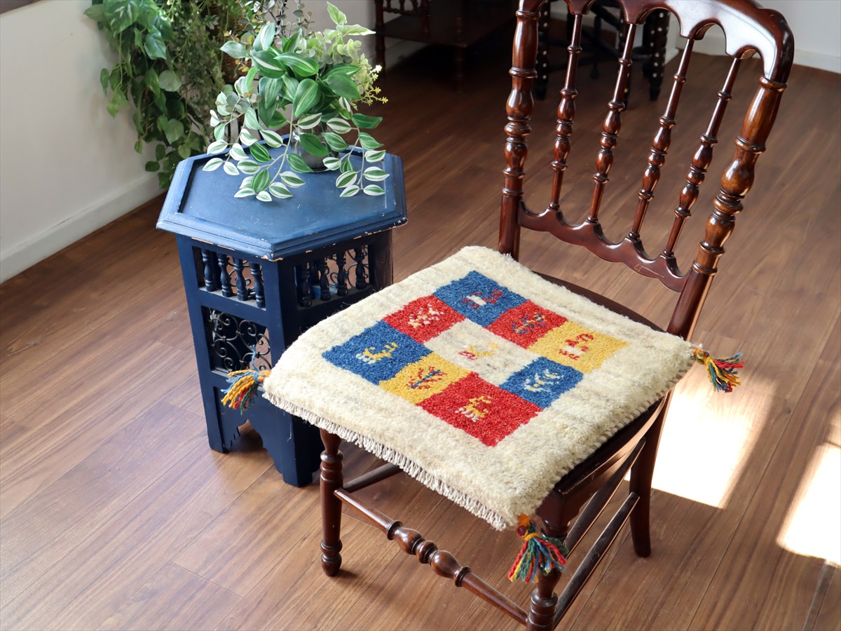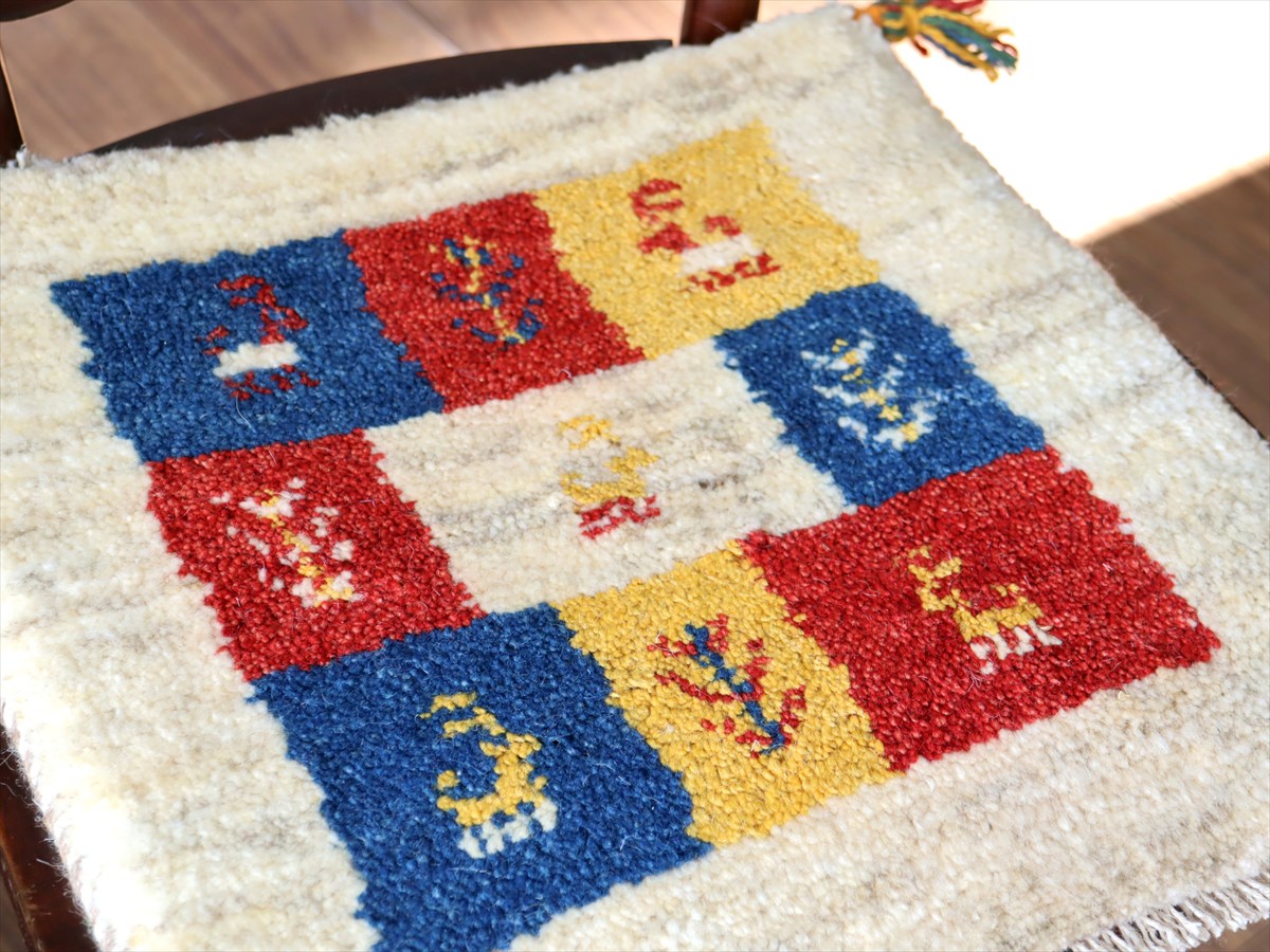 ギャッベ イラン産手織り 座布団サイズ42×42cm ナチュラルアイボリー カラフルタイル 動物と生命の樹