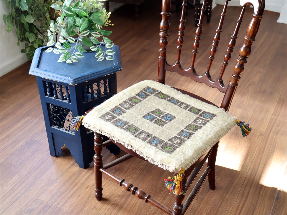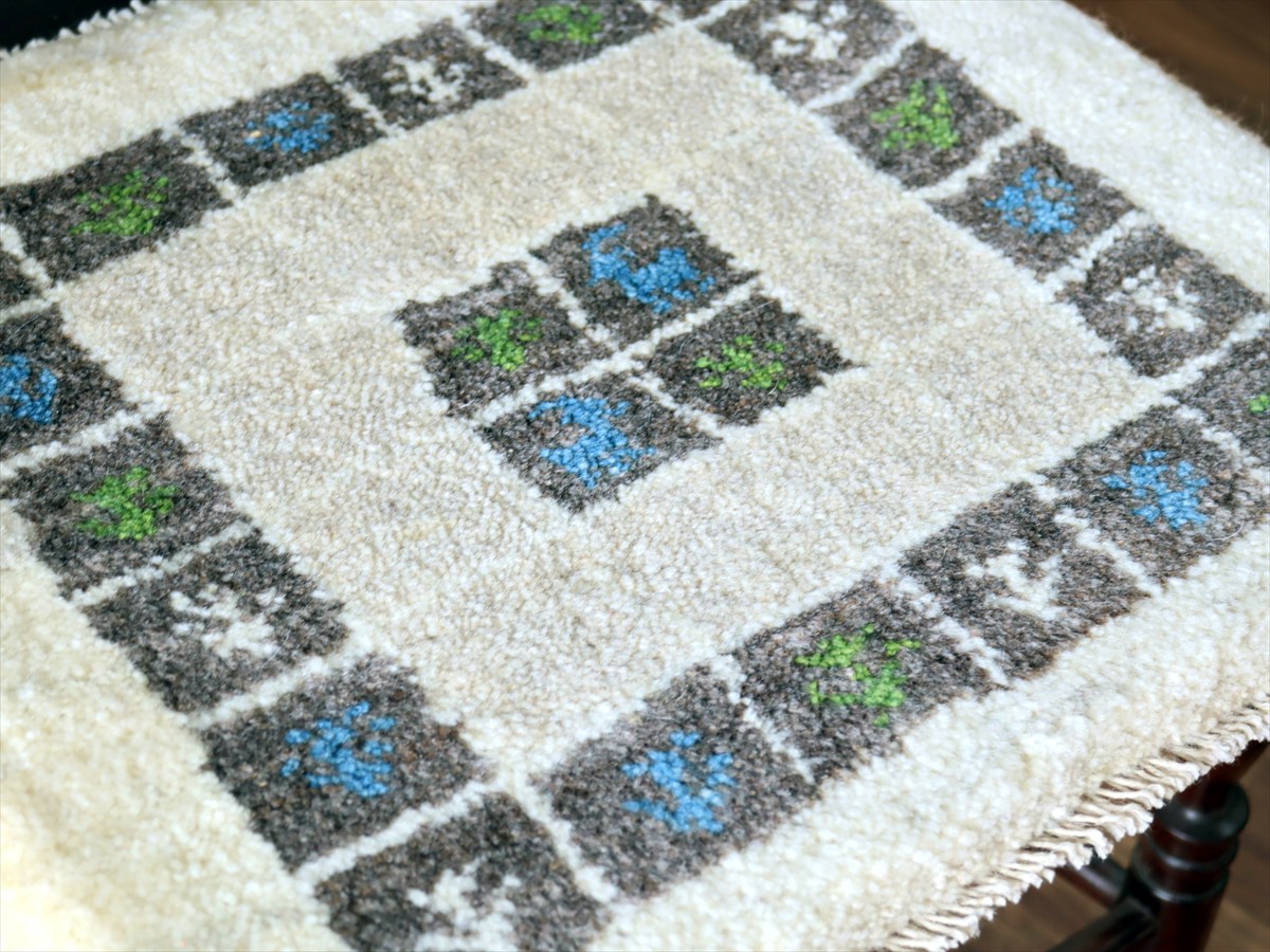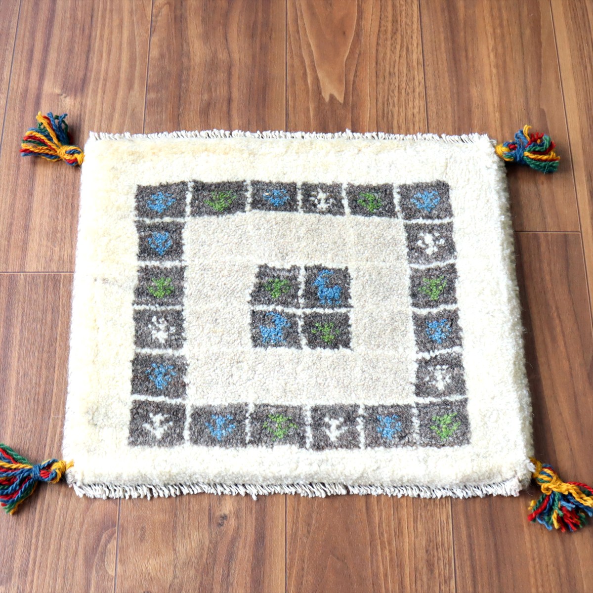 ギャッベ イラン産手織り 座布団サイズ36×44cm ナチュラルアイボリー タイルの中に生命の樹と動物