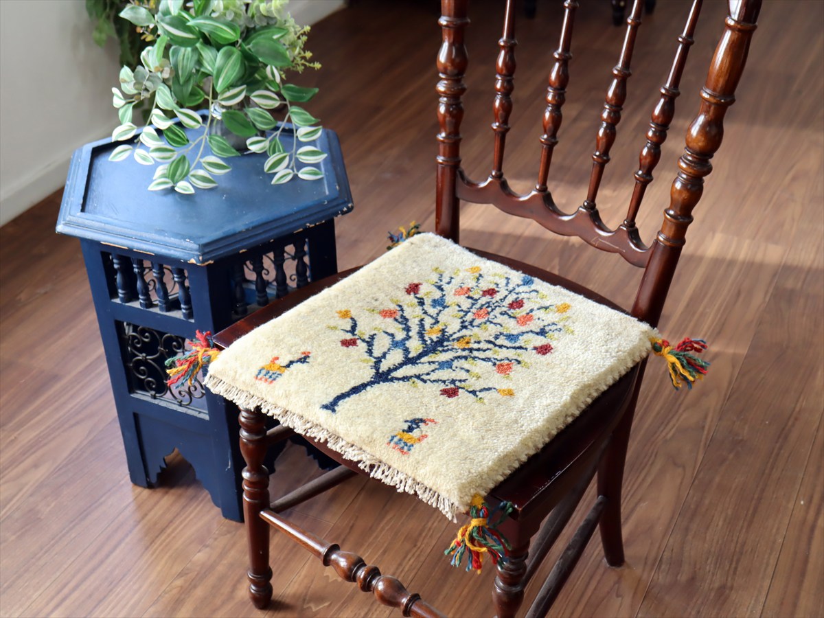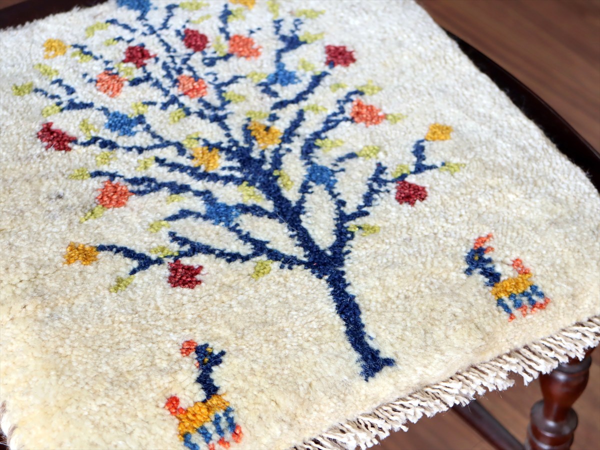 ギャッベ イラン産手織り 座布団サイズ37×37cm ナチュラルアイボリー カラフルなザクロの樹と動物