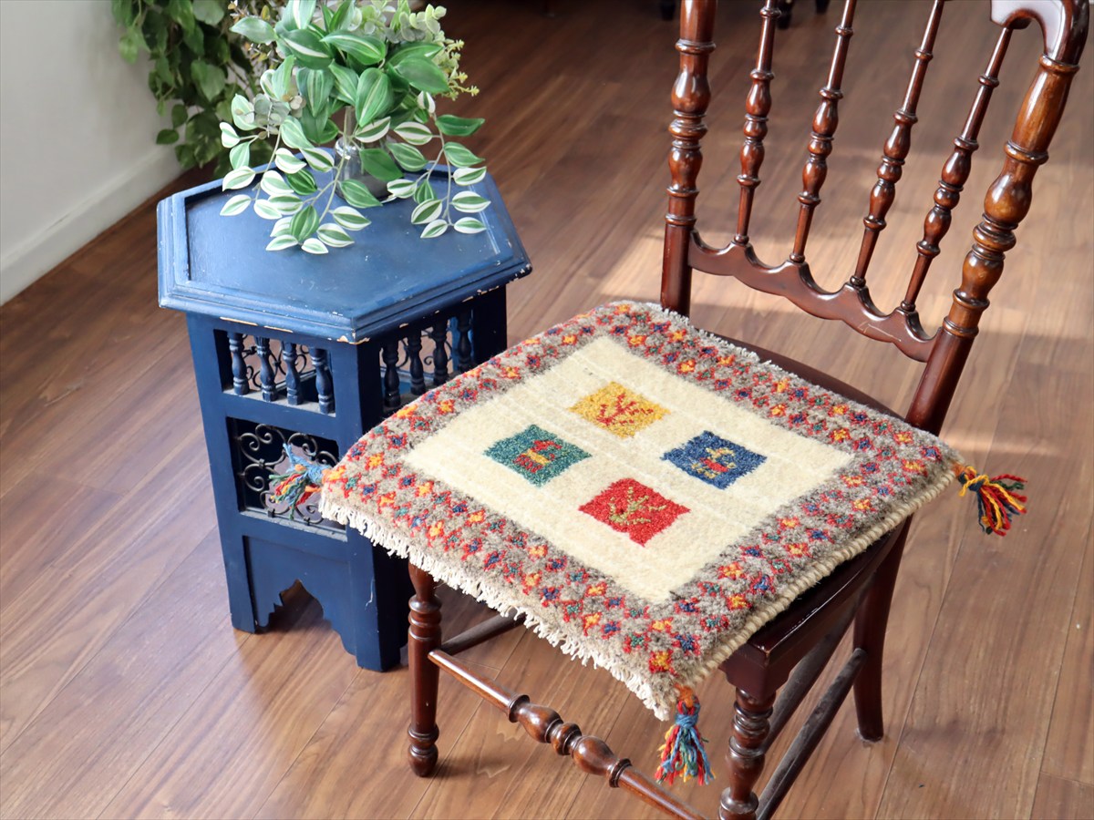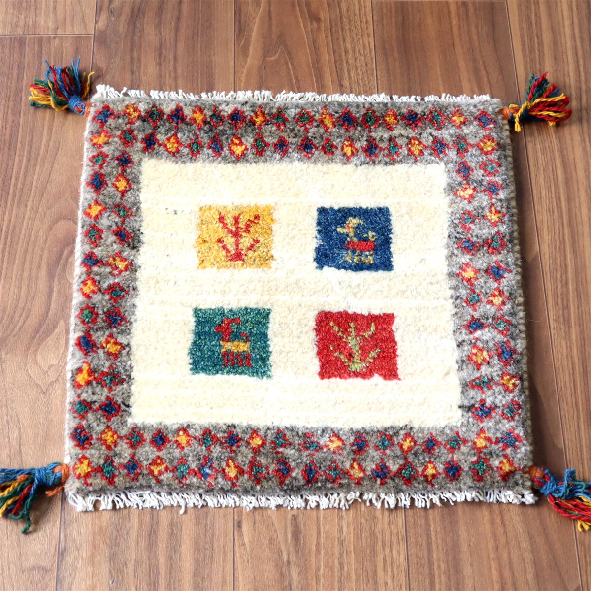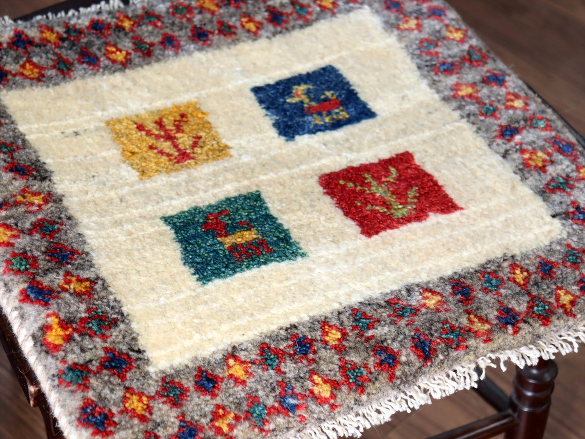 ギャッベ イラン産手織り 座布団サイズ42×43cm ナチュラルアイボリー カラフルタイル 動物と生命の樹