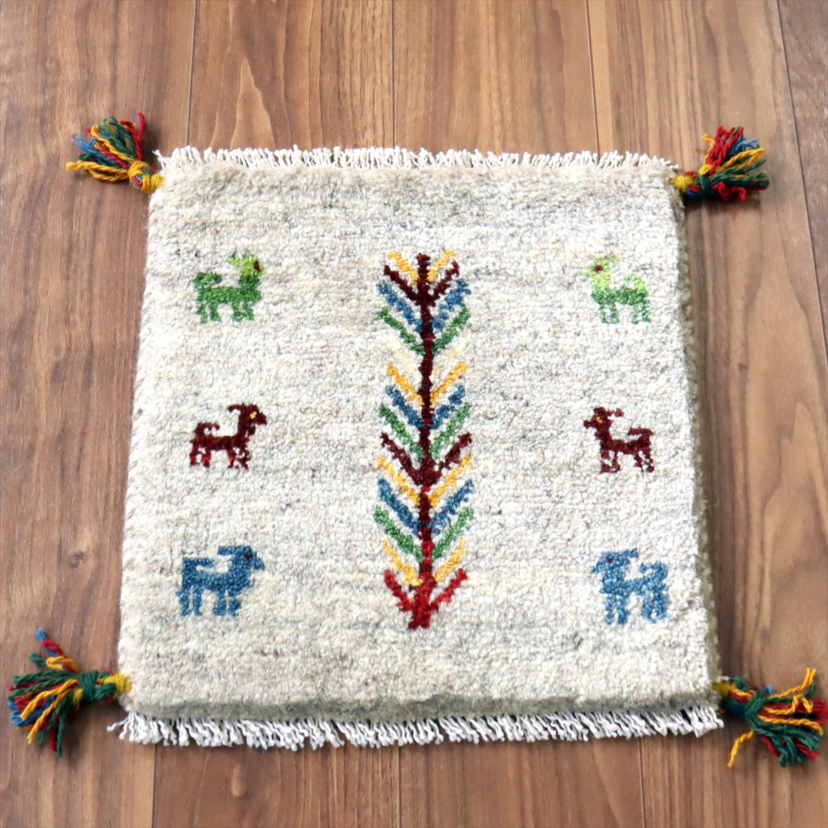 - ギャッベ イラン産手織り 座布団サイズ41×38cm ナチュラルアイボリー 生命の樹と動物