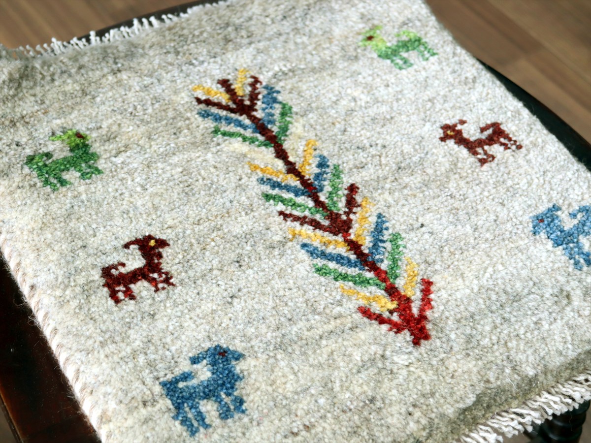 ギャッベ イラン産手織り 座布団サイズ41×38cm ナチュラルアイボリー 生命の樹と動物