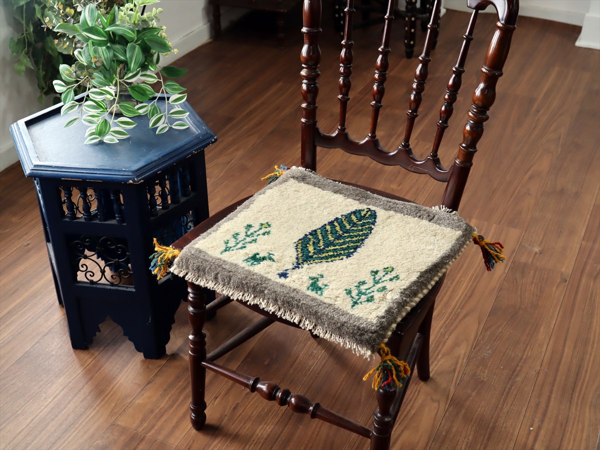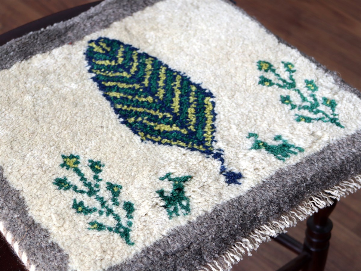 ギャッベ イラン産手織り 座布団サイズ38×40cm ナチュラルアイボリー 糸杉と動物