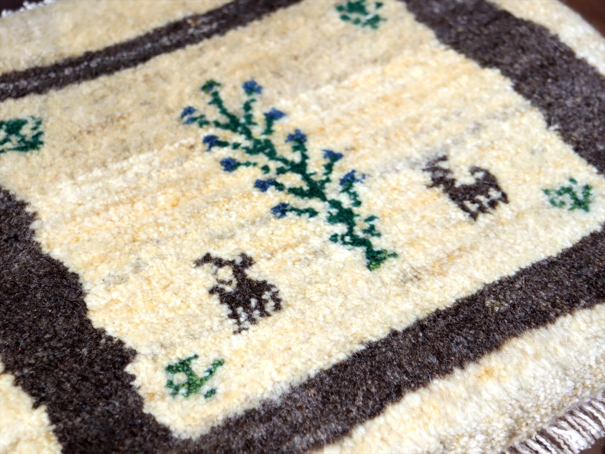 ギャッベ イラン産手織り 座布団サイズ38×43cm ナチュラルアイボリー 生命の樹と動物