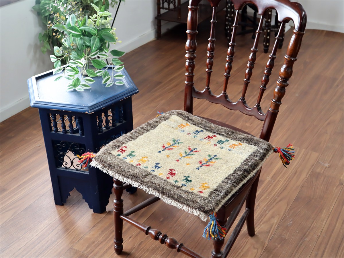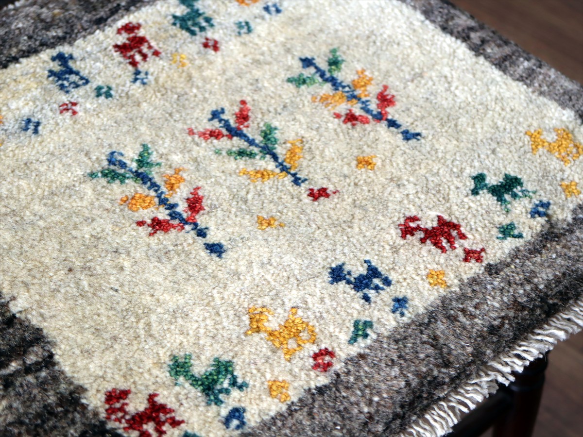ギャッベ イラン産手織り 座布団サイズ40×43cm ナチュラルアイボリー カラフルな生命の樹と動物