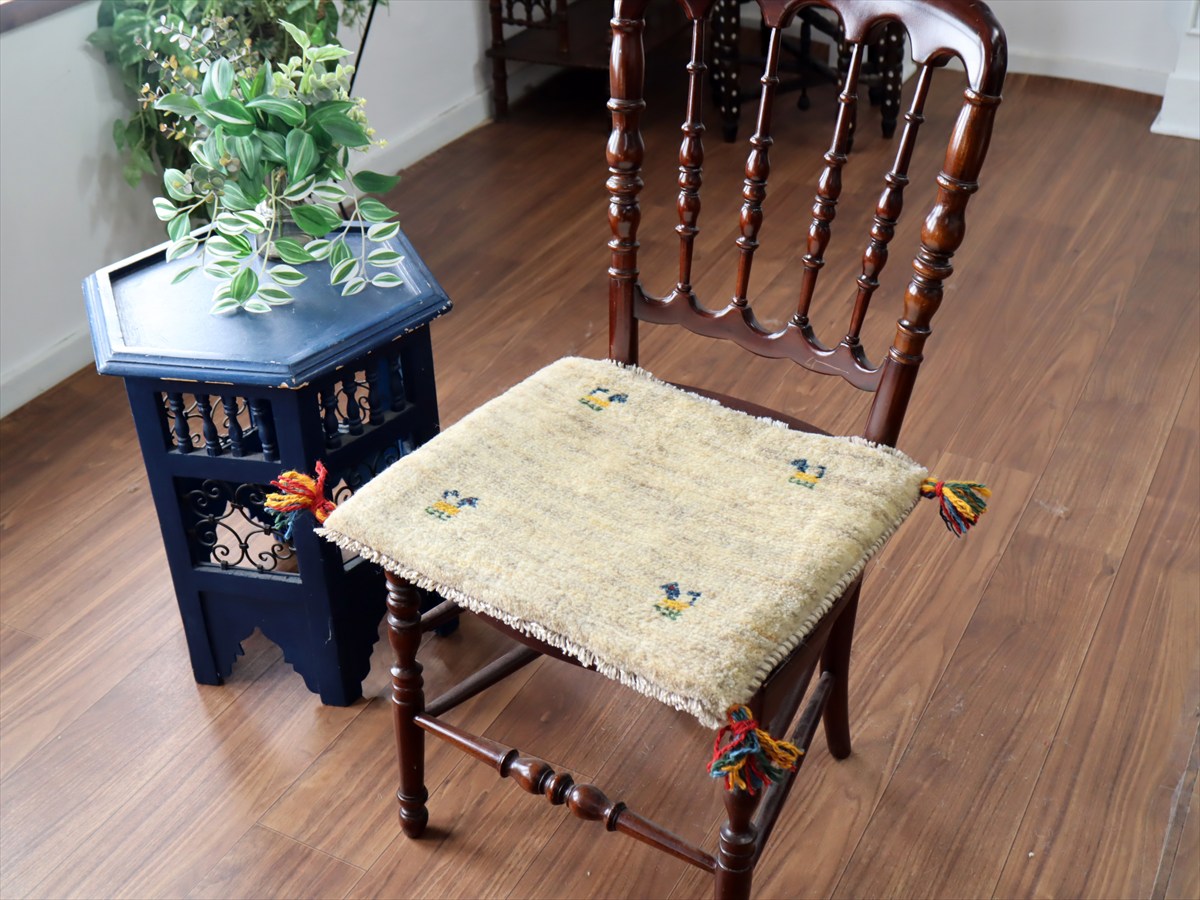 | 何枚も集めたくなる、40cm角の座布団サイズギャベ。四隅に大きなポンポンのついた、伝統的なスタイルで織られています。フローリングに並べて座布団がわりに使ったり、ベンチやダイニングチェアの座面など、使い方はいろいろ。壁にタペストリーのように飾るのもおすすめです。 |