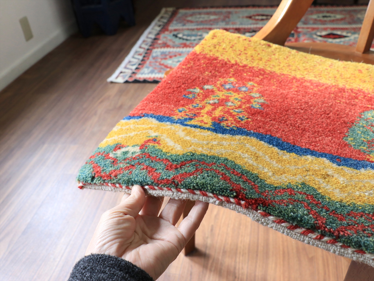 | ふっくらとした厚みのある織り地で、パイル(毛足)を含めたギャッベの厚みは、1.7-1.8cm程度。上下の房を巻き込んだり、何度もシャーリングをしたり、丁寧に仕上げられたコレクションです。 |