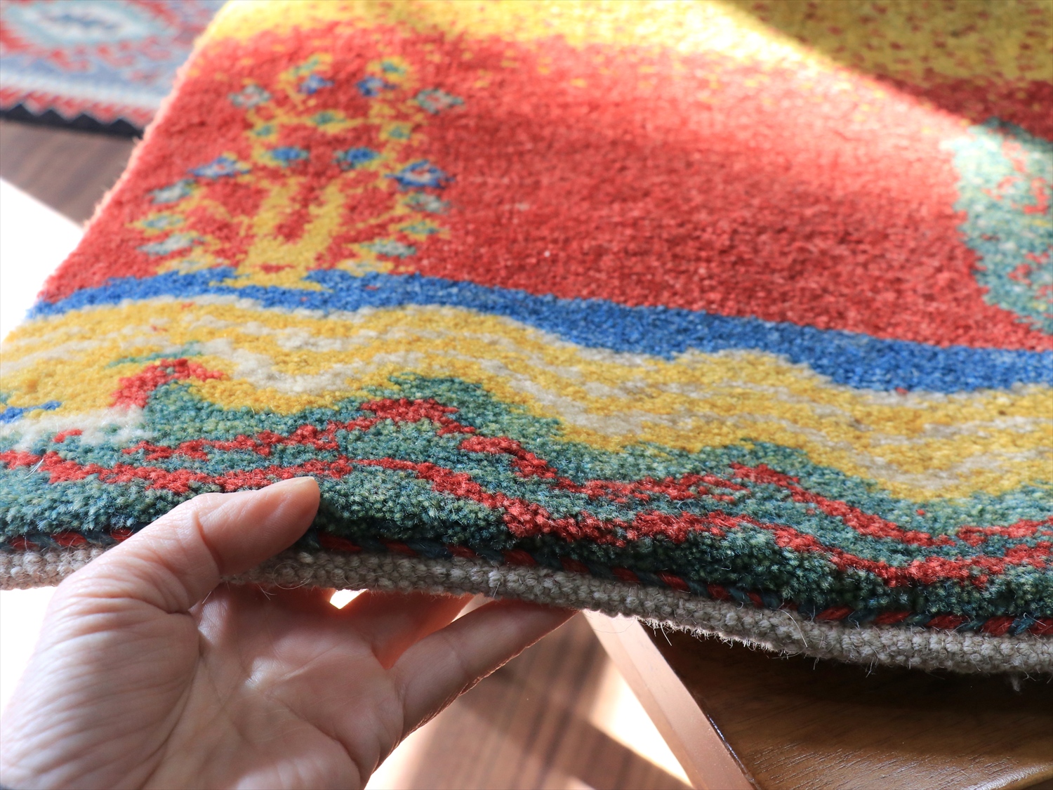 | ・手紡ぎ、草木染(または無染色)、ウール100%、手織りのギャッベ。 ・余分なウール繊維を焼き飛ばして、水洗いとシャーリングを数回繰り返した丁寧な仕上げ。遊び毛はほとんどでません。 ・上下の房は、飾り糸をそえて裏面に巻き込む仕上げ。 |