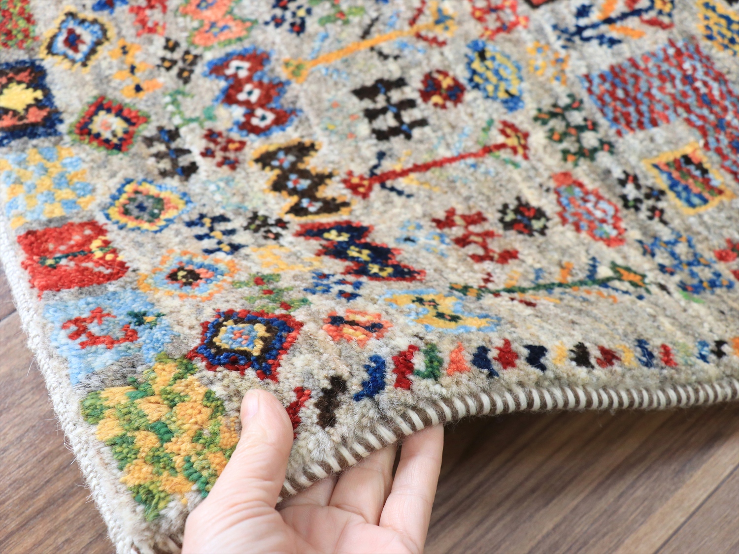 | ふっくらとした厚みのある織り地で、パイル(毛足)を含めたギャッベの厚みは、1.7-1.8cm程度。上下の房を巻き込んだり、何度もシャーリングをしたり、丁寧に仕上げられたコレクションです。 |