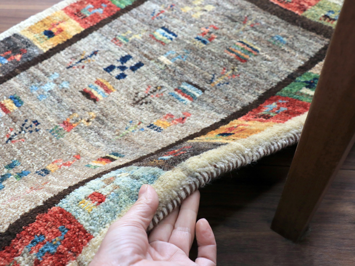 | ぎゅっと引き締まって、厚みのある織り。パイル(毛足)を含めたギャッベの厚みは1.6-1.7cmでボリューム感があります。 |