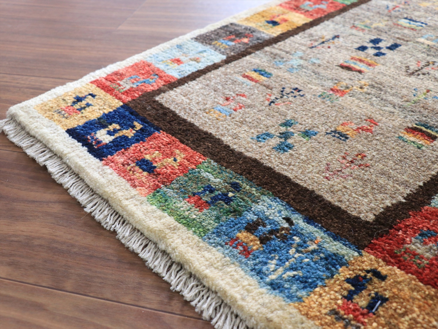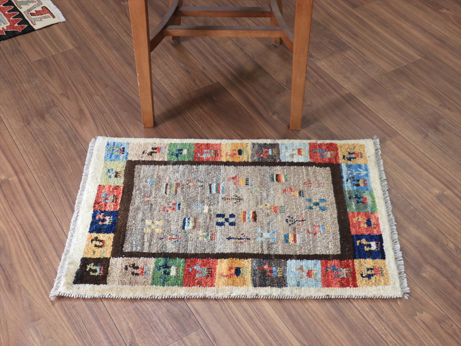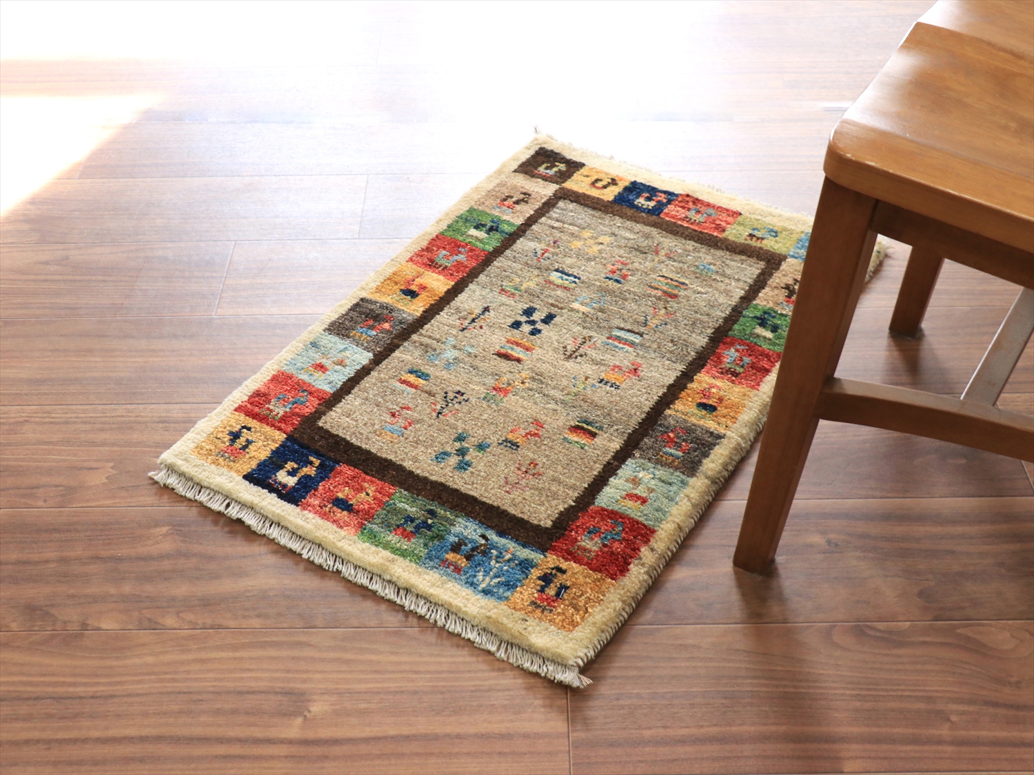| 中央のベースの色は、染料を使わずに天然の羊毛の色をそのまま使ったグレー。ランダムは配置で、動物や草花のモチーフが並べられています。周囲のカラフルなタイルモチーフもひとつひとつがかわいらしく、素朴なギャッベのイメージそのままのデザインです。 |