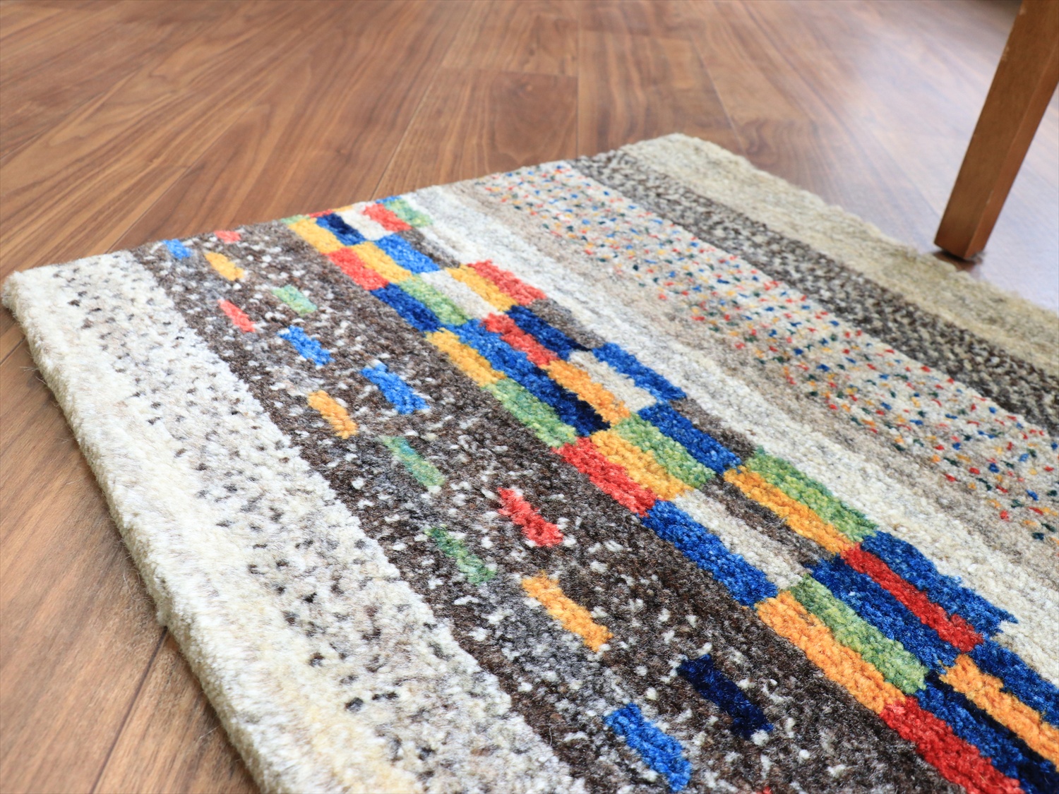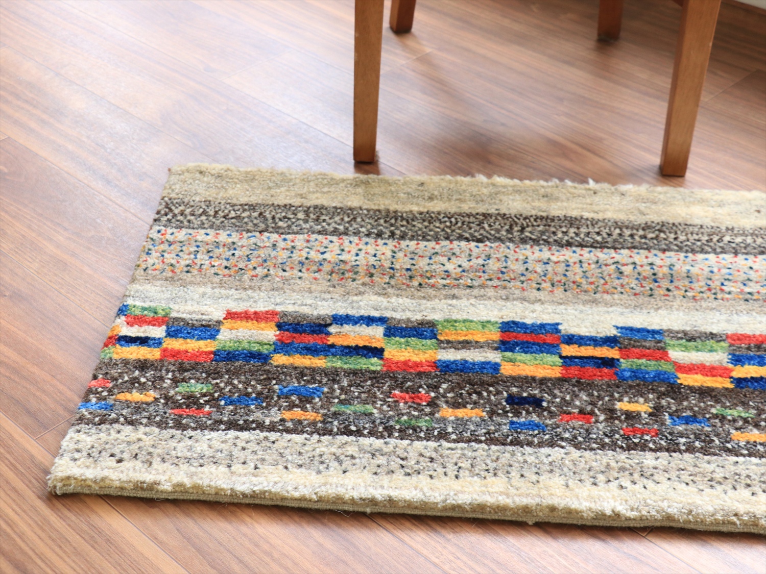 | 縦のストライプは珍しいと思われたかもしれませんが、このギャッベは経糸の方向からみると、横に長いサイズです。経糸の房は丁寧に巻き込んであるので、お使いになるときには縦横どちらの方向でも気にせずにおいてください! モダンな幾何学モチーフで、動物や草花のモチーフがはいっていないのもいいですね。 |