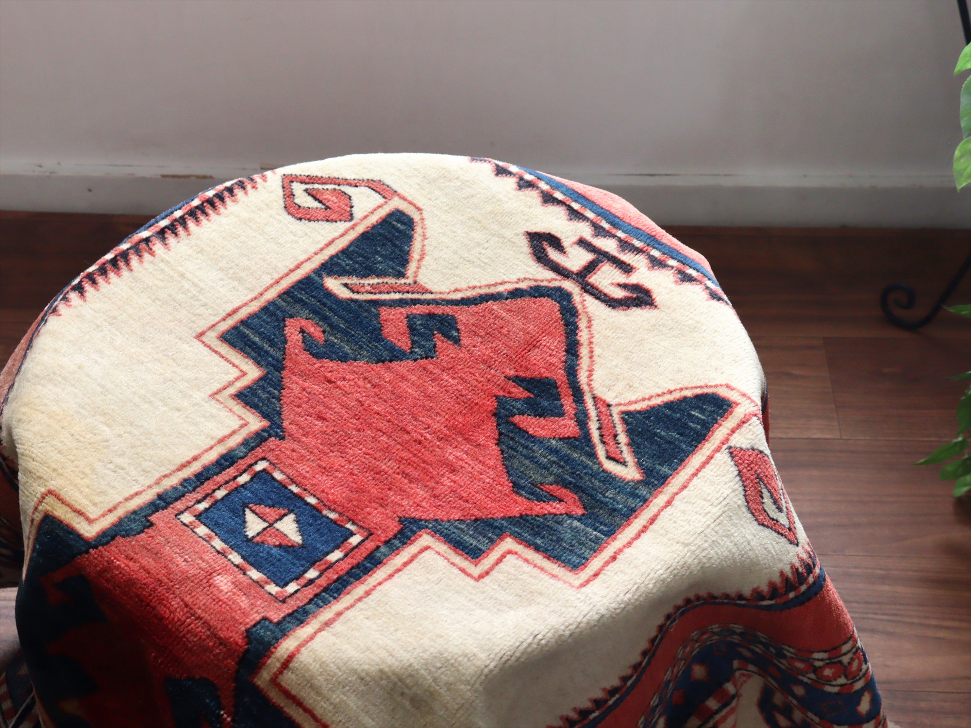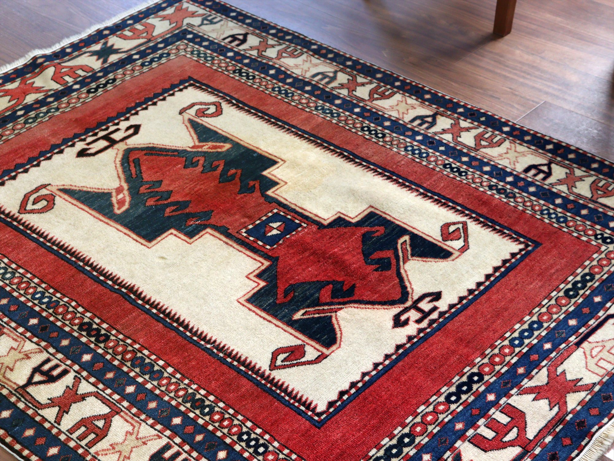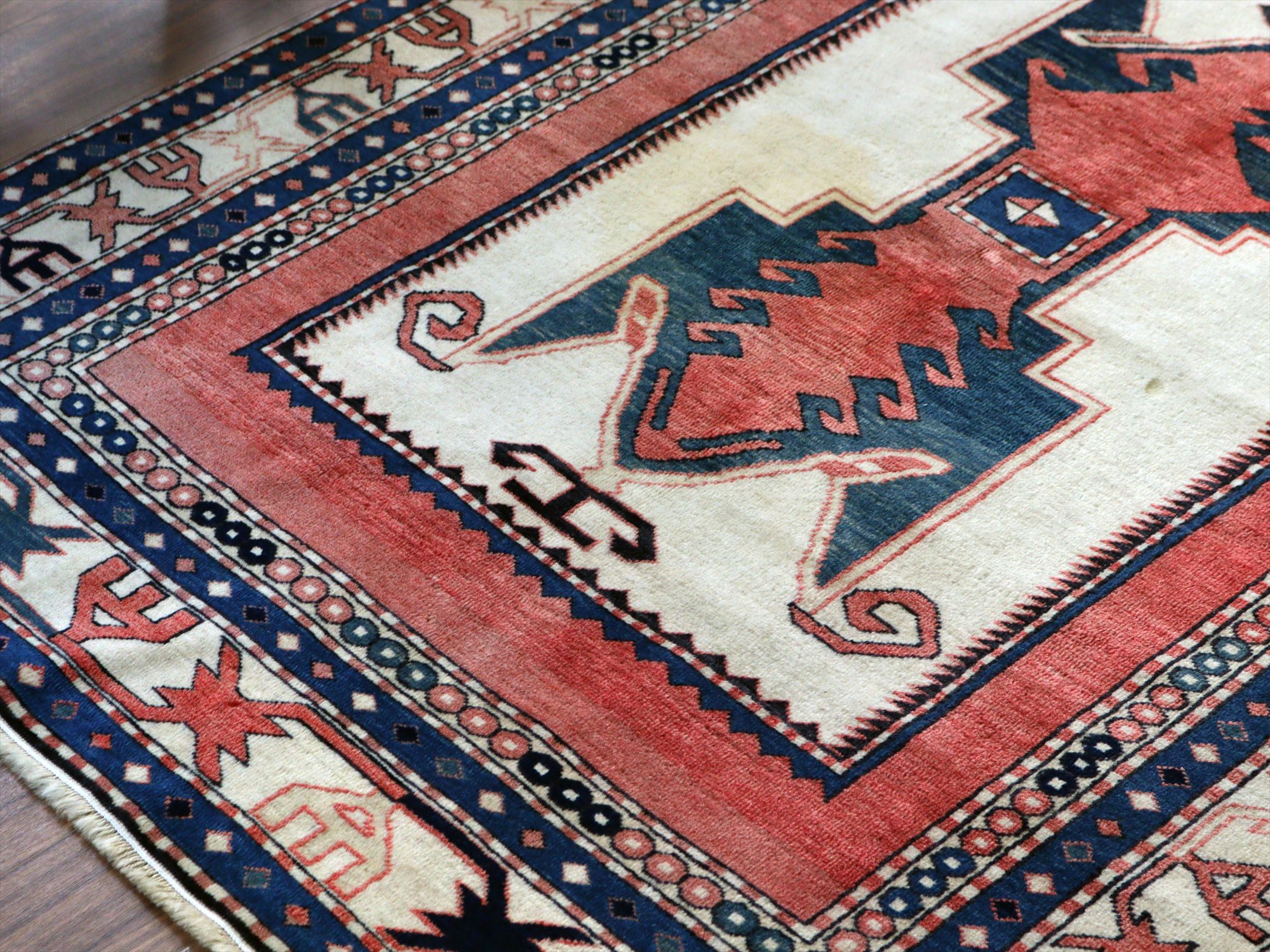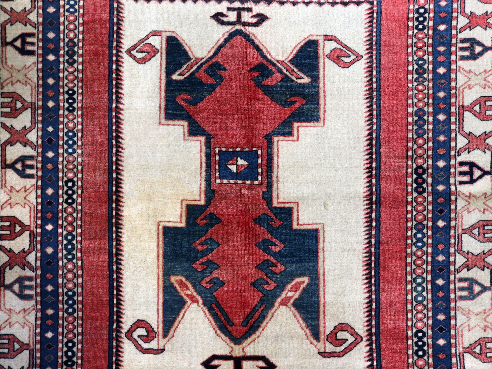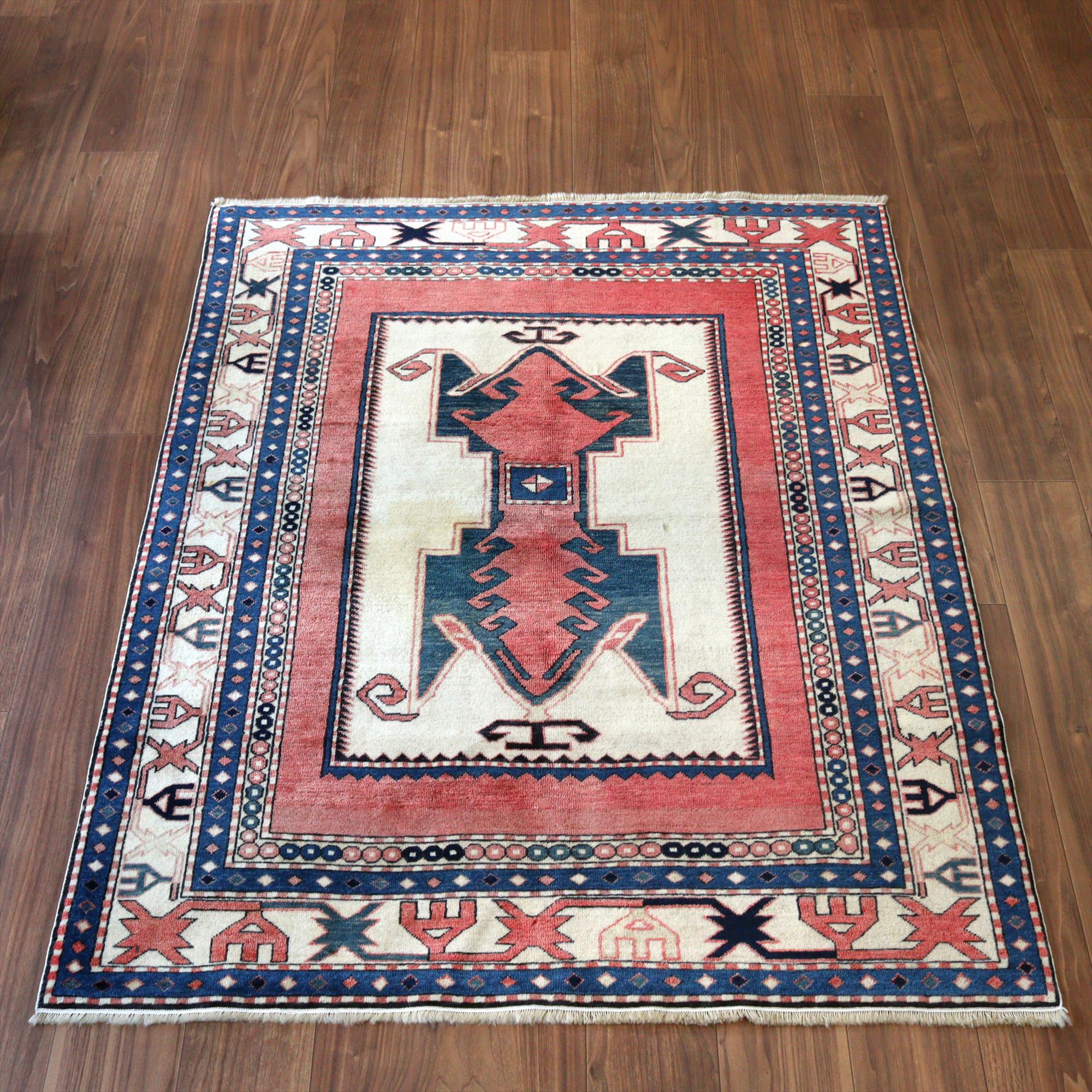 | 南コーカサス地方、現在のアゼルバイジャンで織られた絨毯。レッド、ブルー、アイボリーを基調として、ややパステルに落ち着いた色合いで構成されています。中央には母神のモチーフとして象徴的なエリベリンデ、また力強さを表す雄羊の角と思しきモチーフがデザインされています。 |