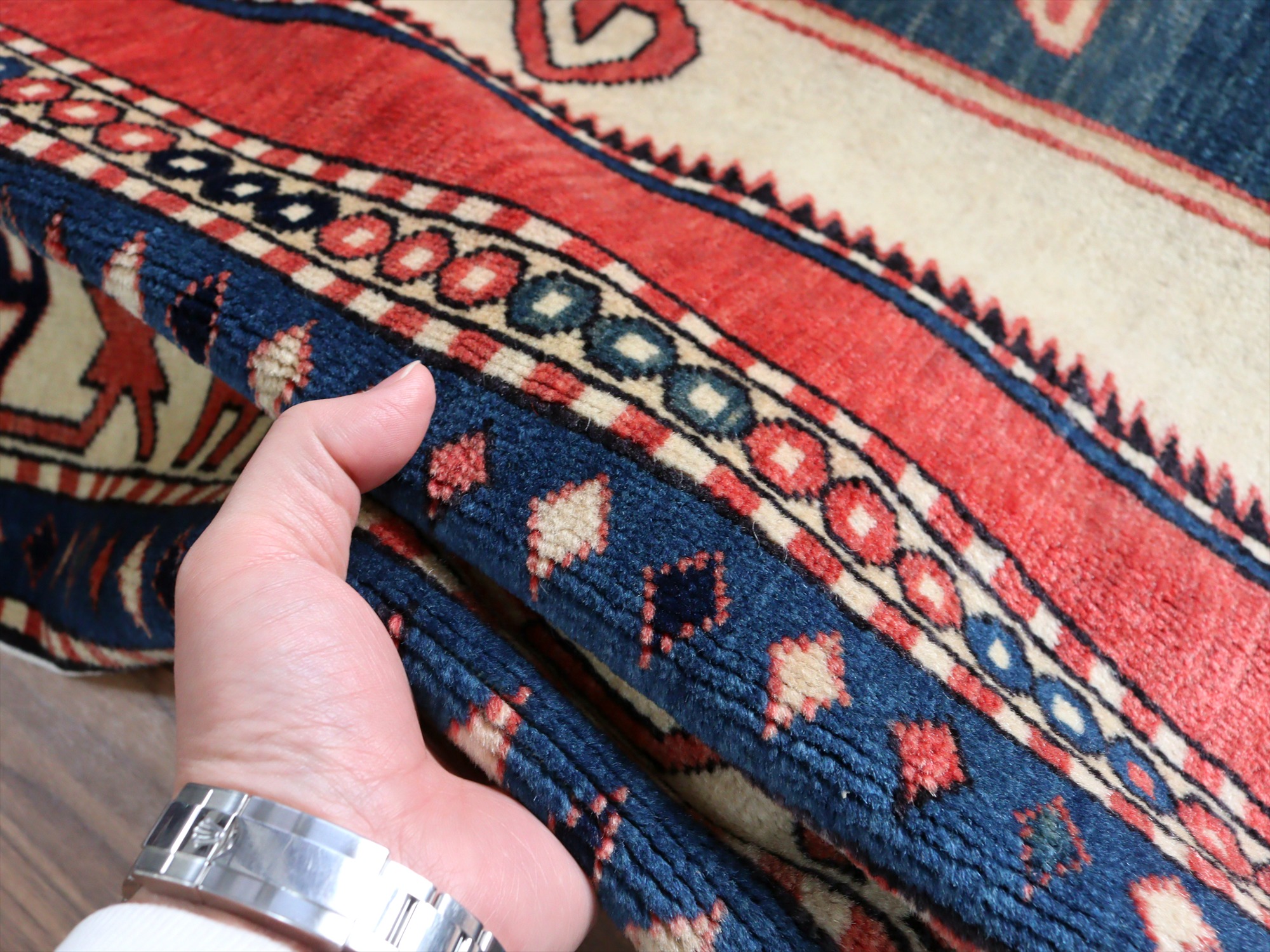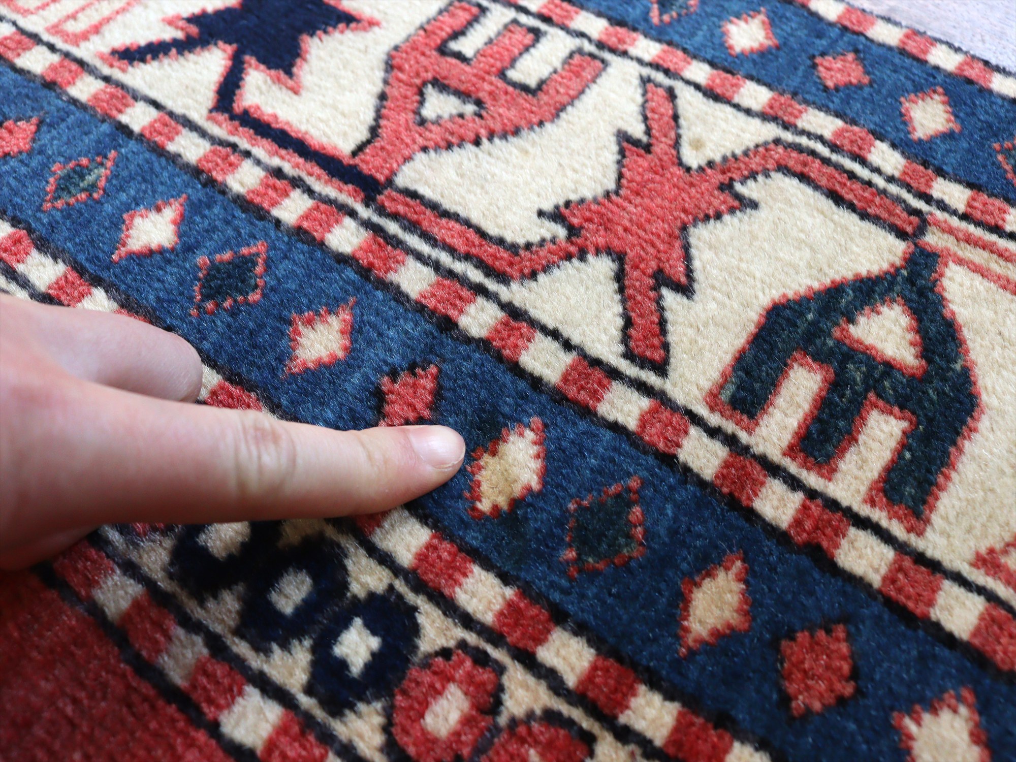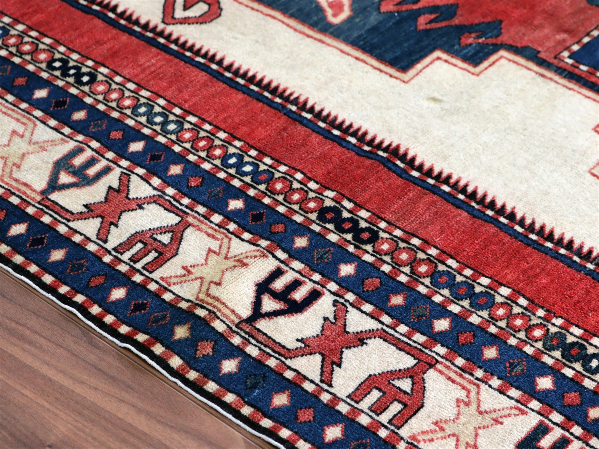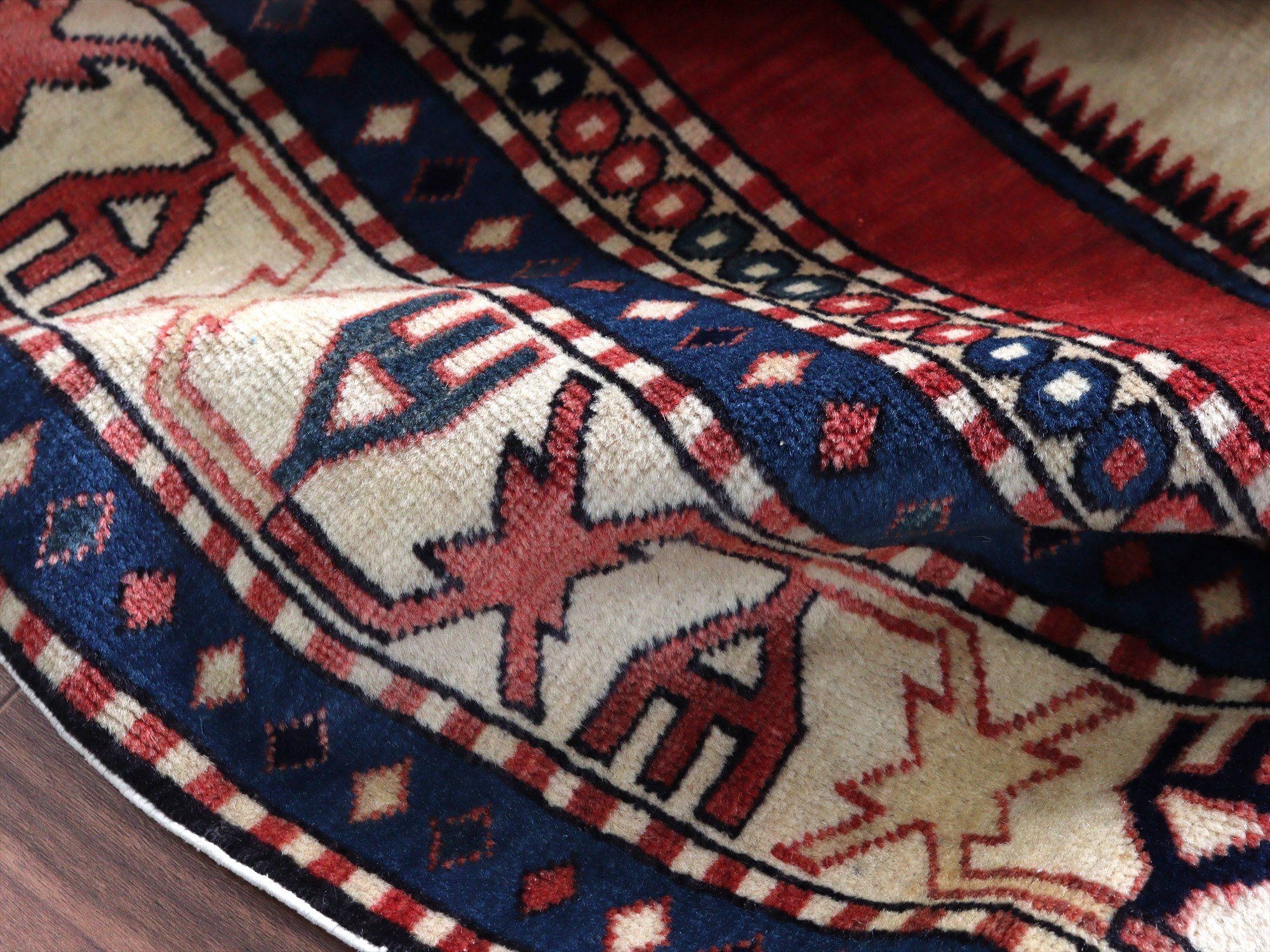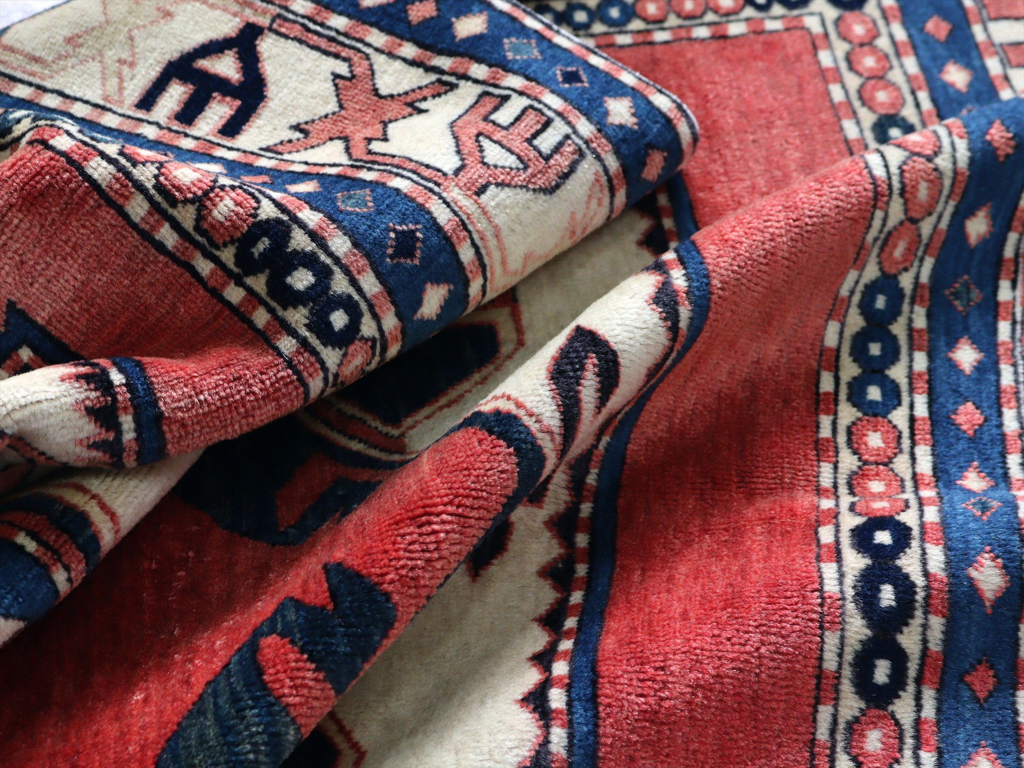 | 南コーカサス地方、現在のアゼルバイジャンで織られた絨毯。レッド、ブルー、アイボリーを基調として、ややパステルに落ち着いた色合いで構成されています。中央には母神のモチーフとして象徴的なエリベリンデ、また力強さを表す雄羊の角と思しきモチーフがデザインされています。 |
