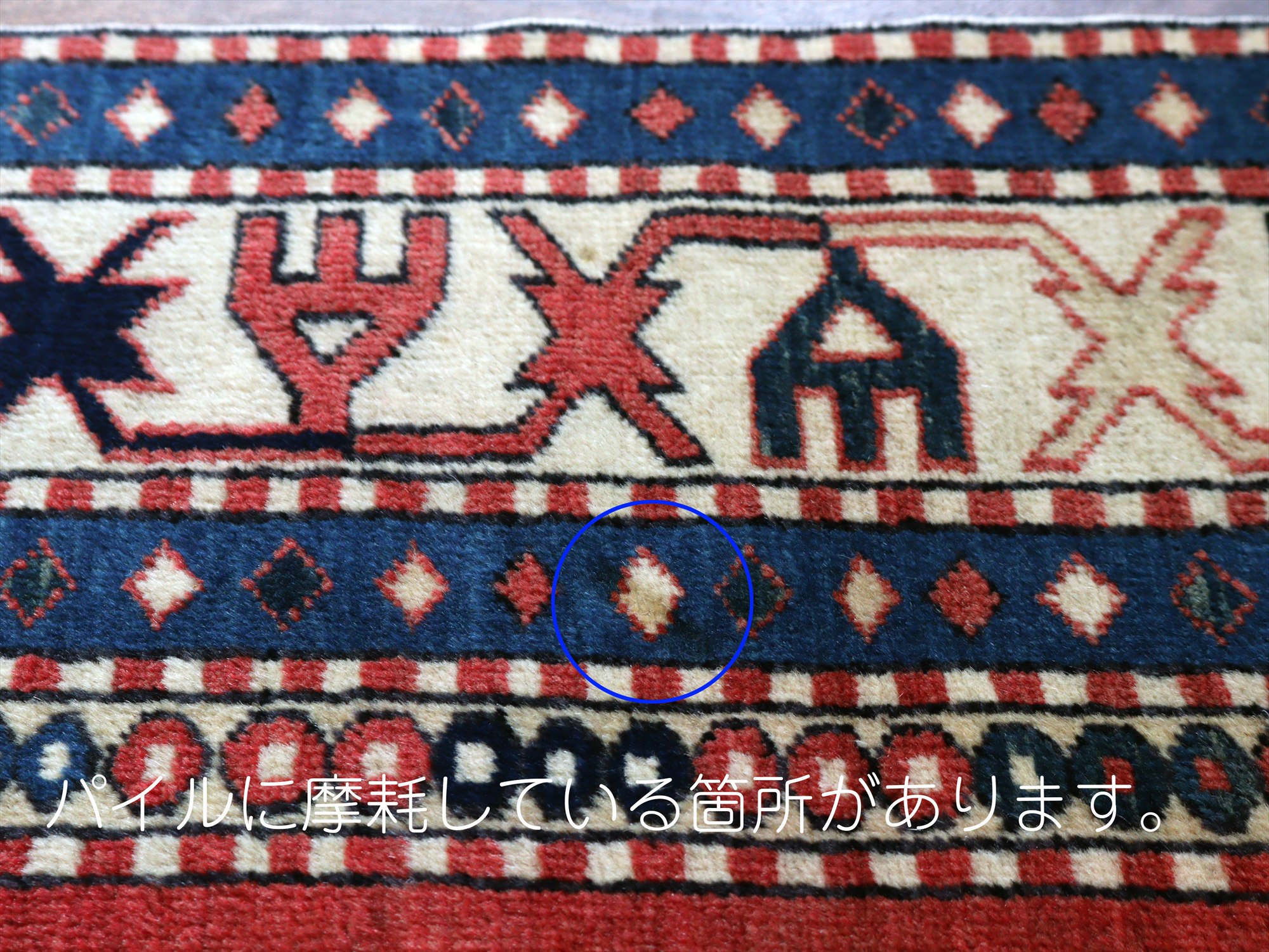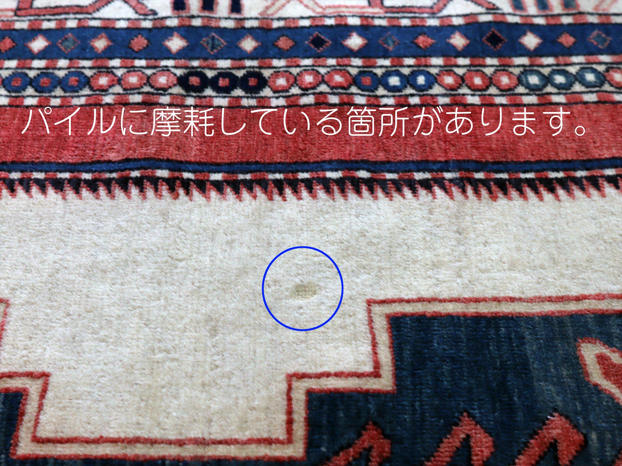 | べーズを含めたラグの厚みは5mm程で、パイルは短くすっきりとしています。一部パイルに削れている箇所があります(写真をご参照ください)。そのほかは大きいダメージもなくきれいな状態です。 |