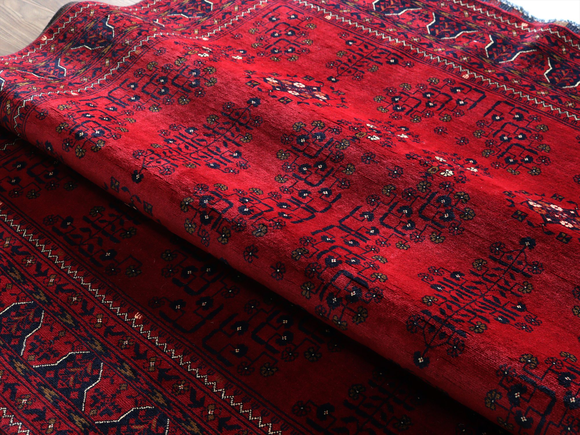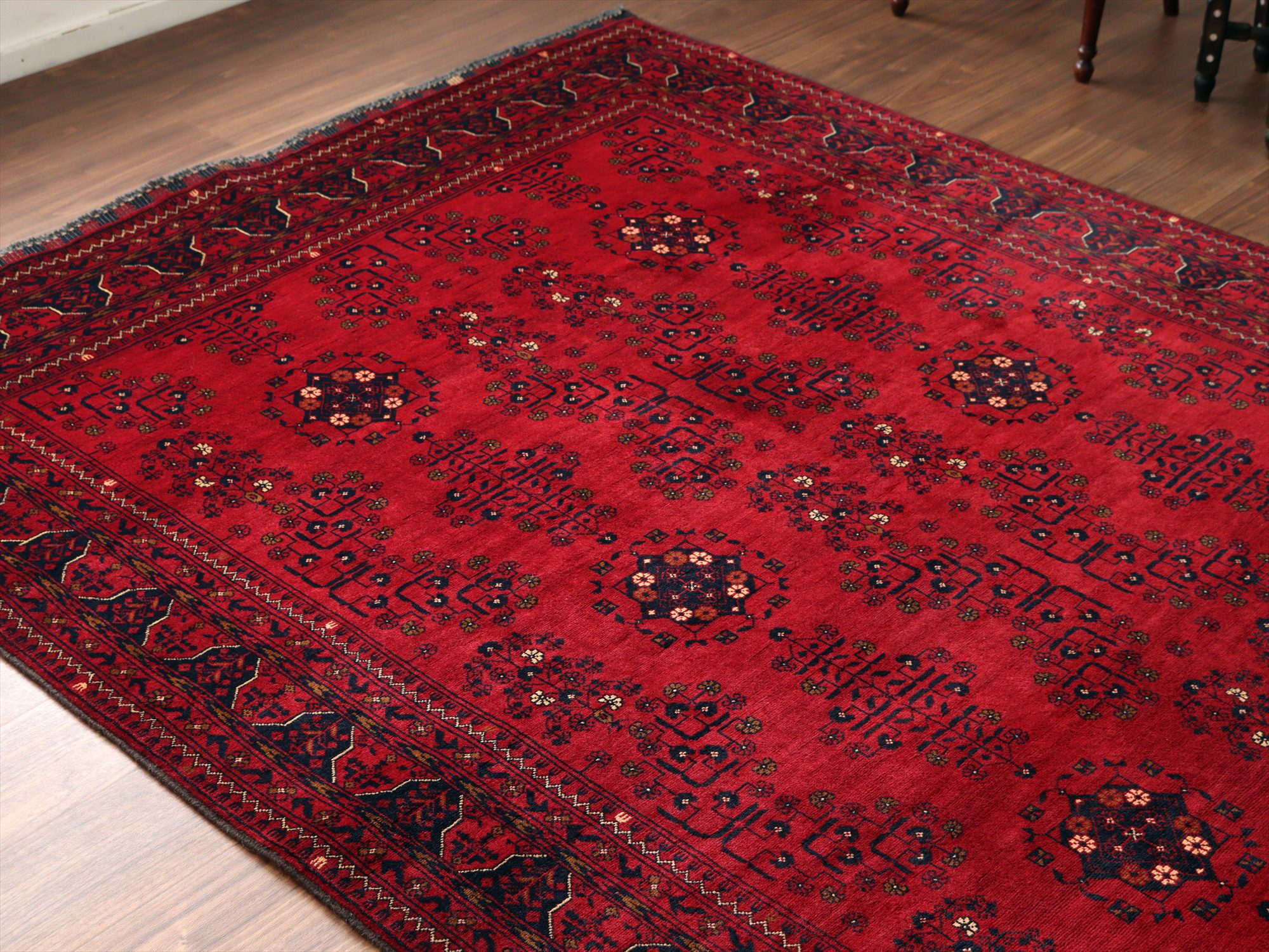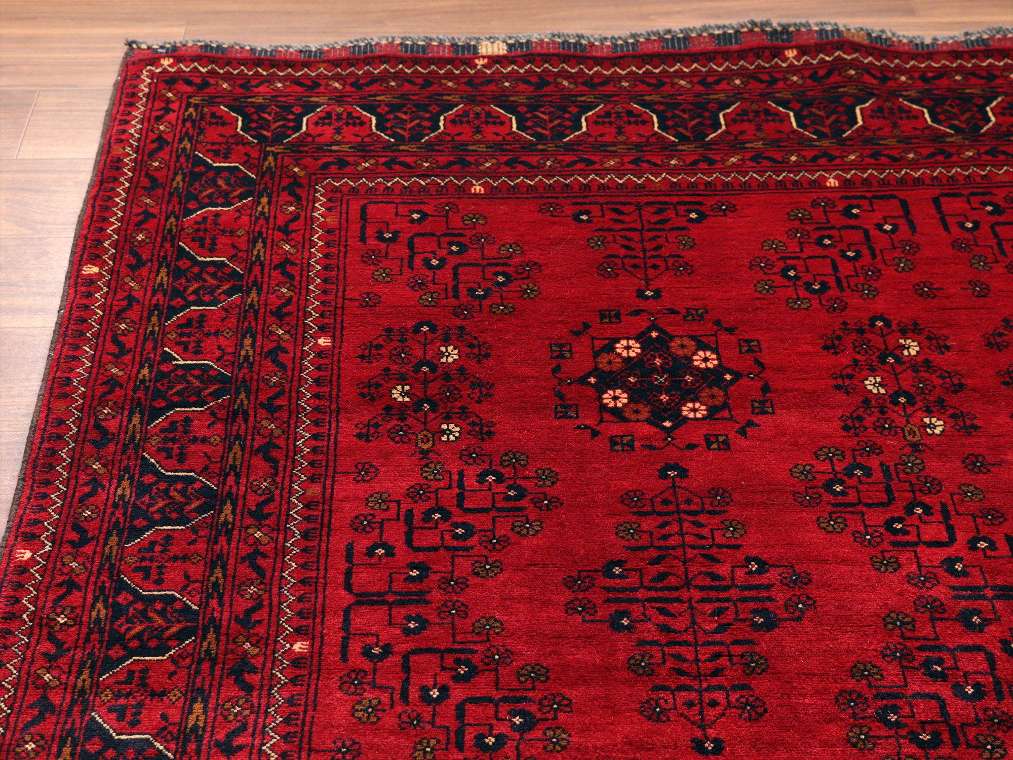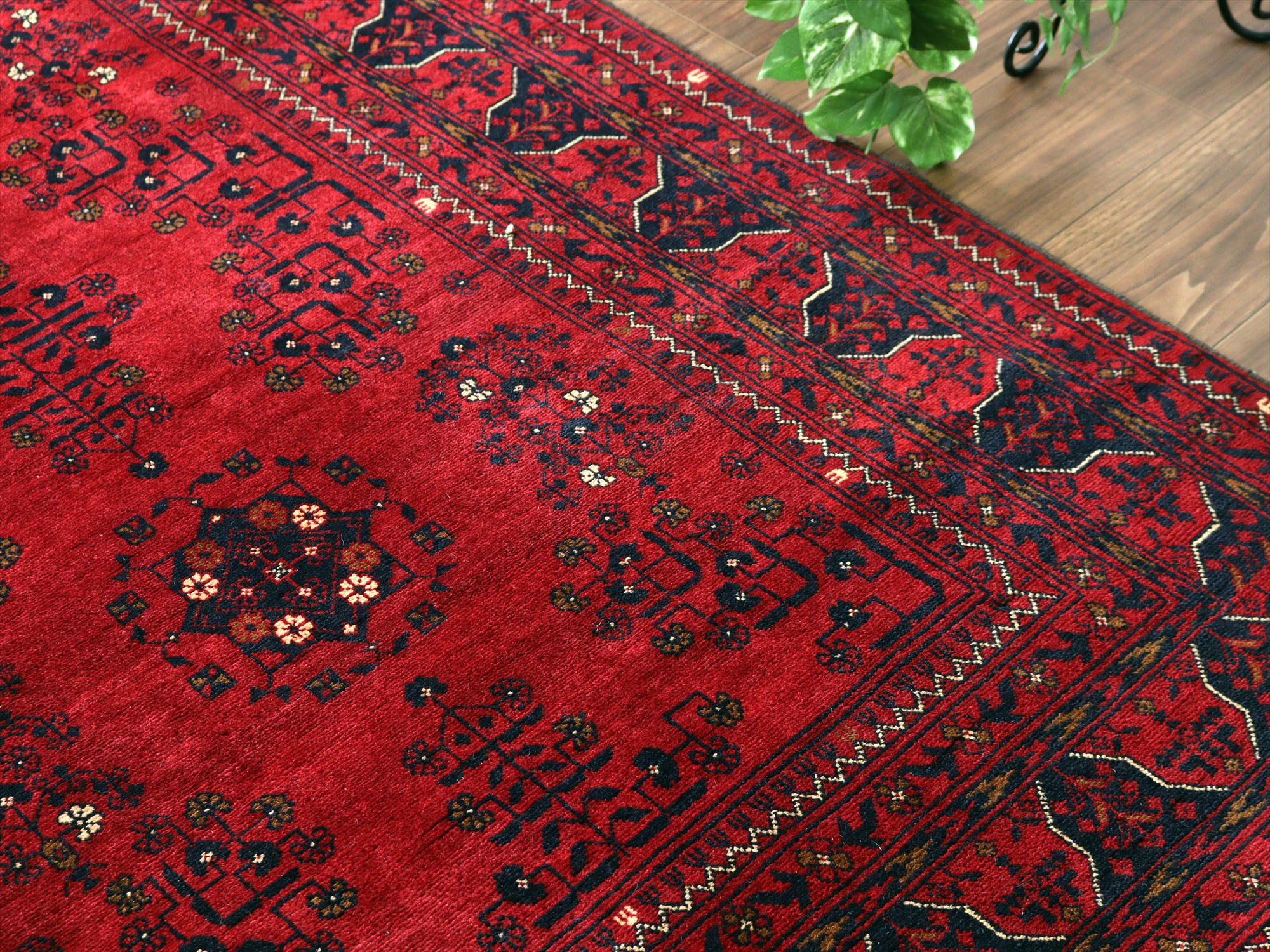 | 深い赤がどっしりとした重厚感を演出するアフガニスタン北部のクンドゥズ地方で織られた高級絨毯です。モチーフが細かいところまできれいに表現されていて、まさに洗練された1枚と言えるでしょう。 |