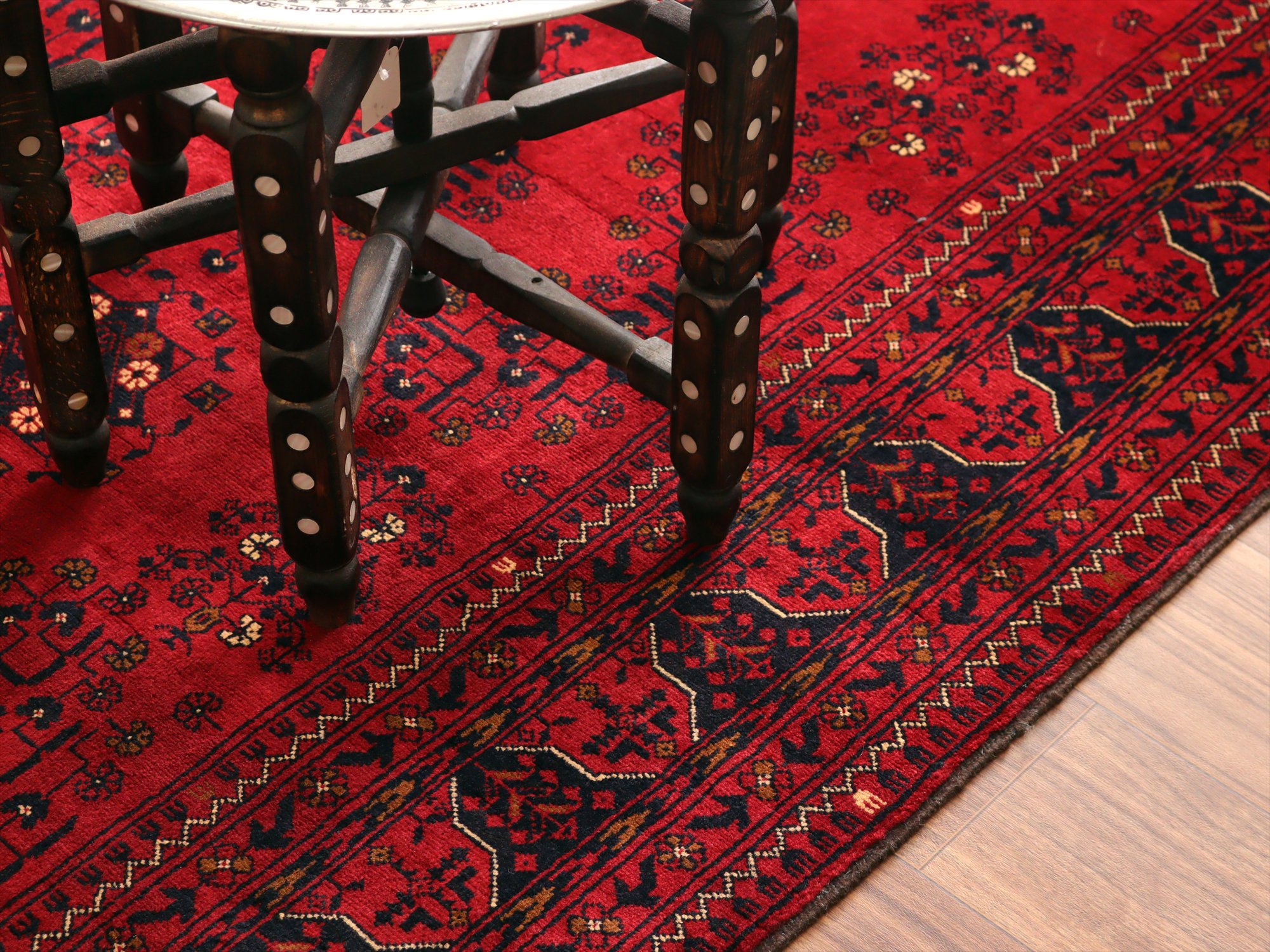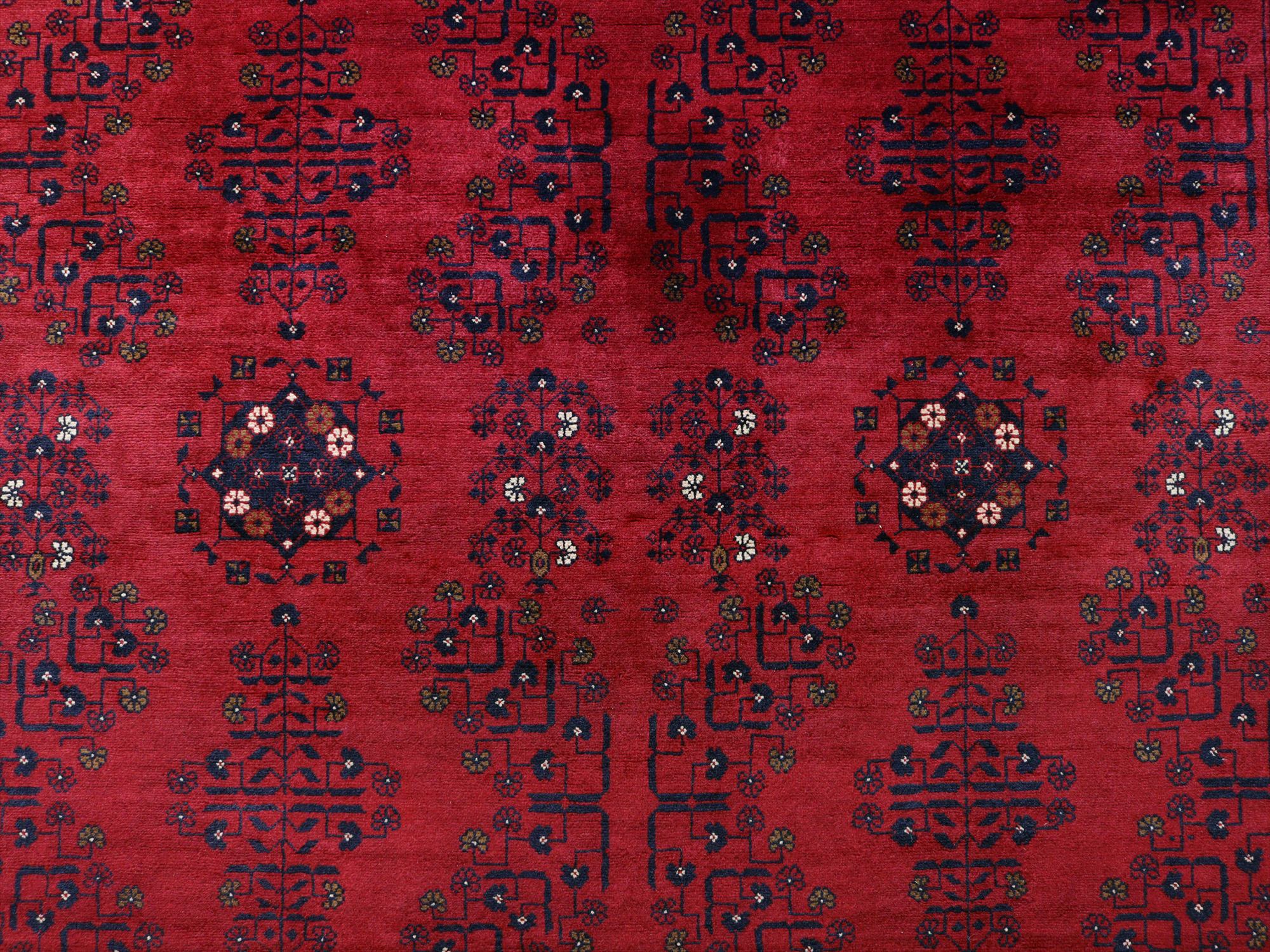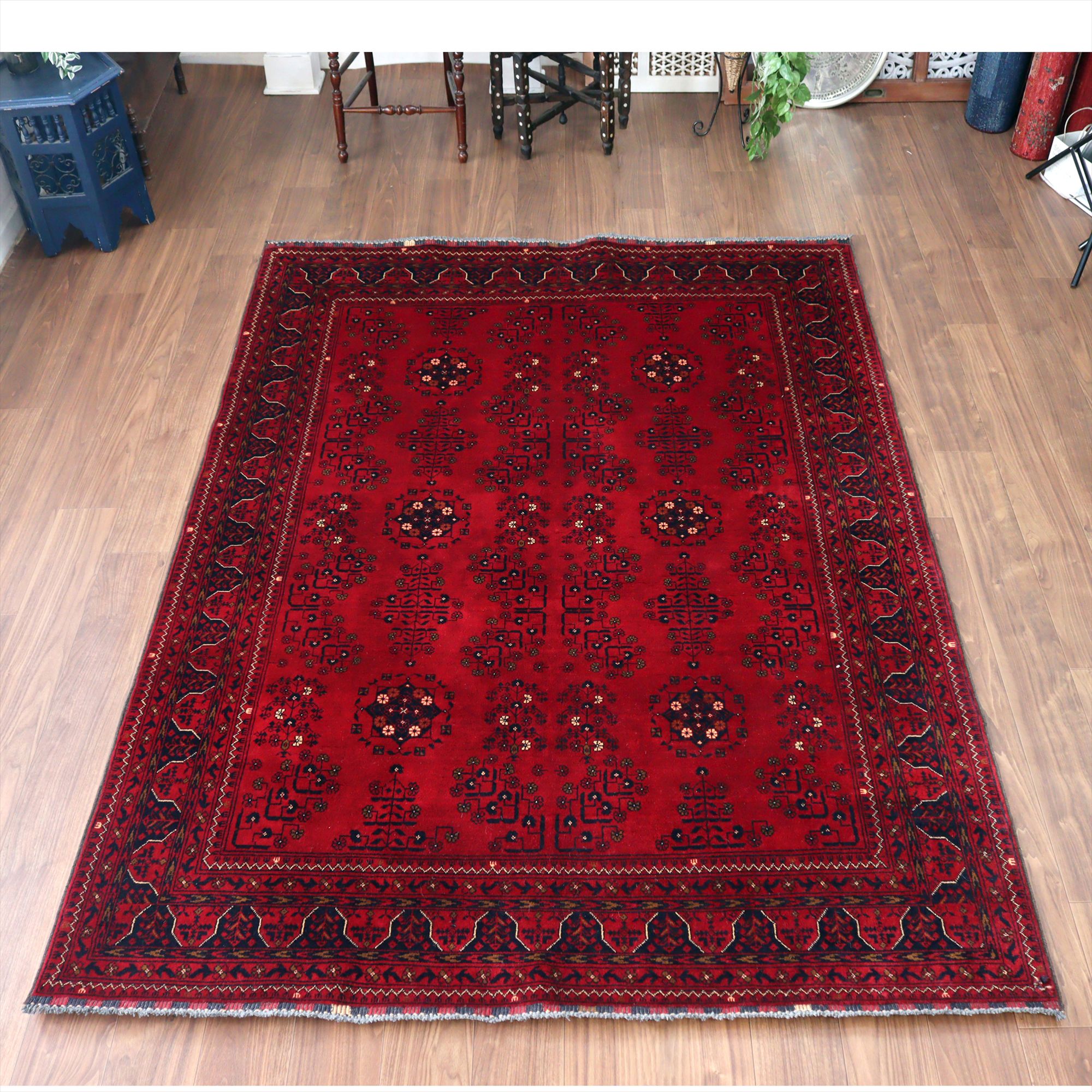 | 深い赤がどっしりとした重厚感を演出するアフガニスタン北部のクンドゥズ地方で織られた高級絨毯です。モチーフが細かいところまできれいに表現されていて、まさに洗練された1枚と言えるでしょう。 |