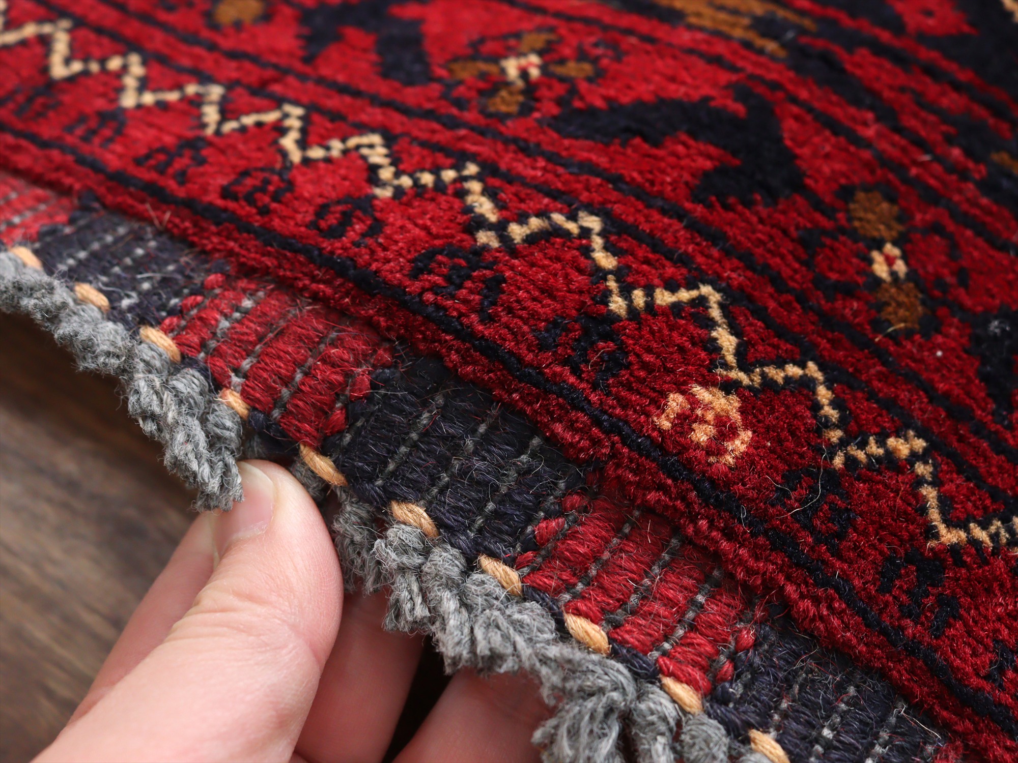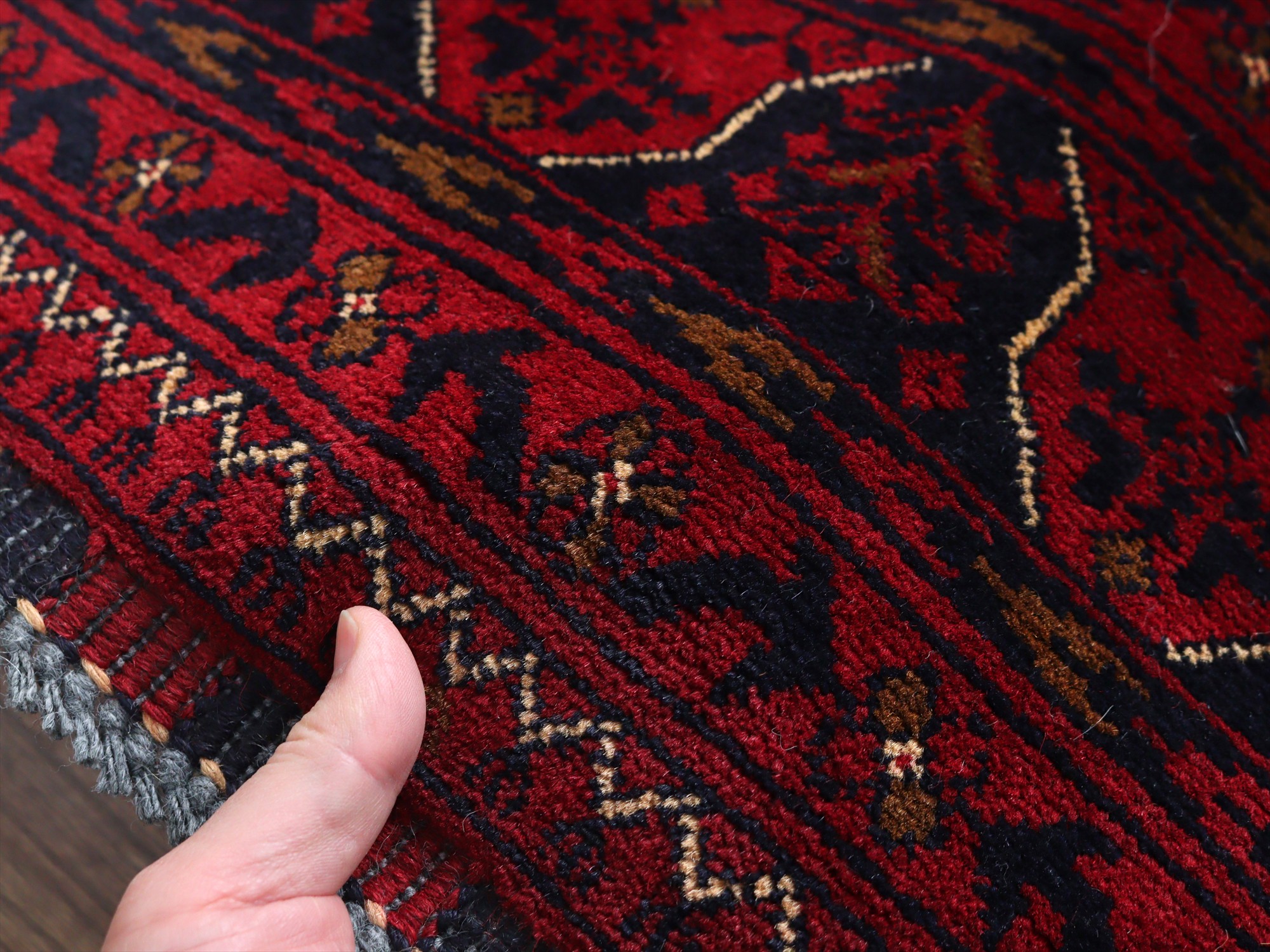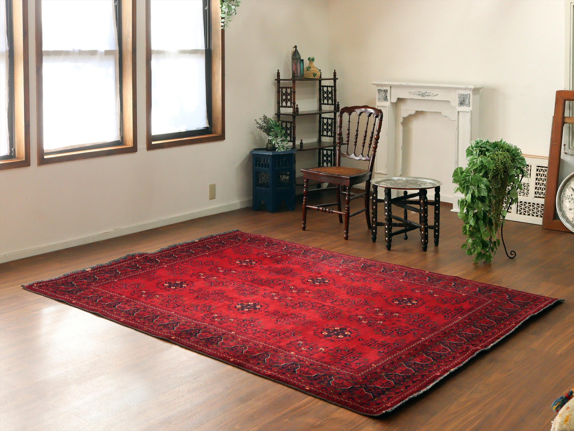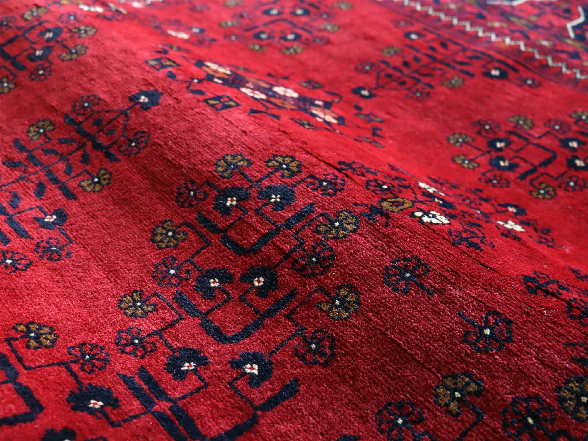 | 深い赤がどっしりとした重厚感を演出するアフガニスタン北部のクンドゥズ地方で織られた高級絨毯です。モチーフが細かいところまできれいに表現されていて、まさに洗練された1枚と言えるでしょう。 |