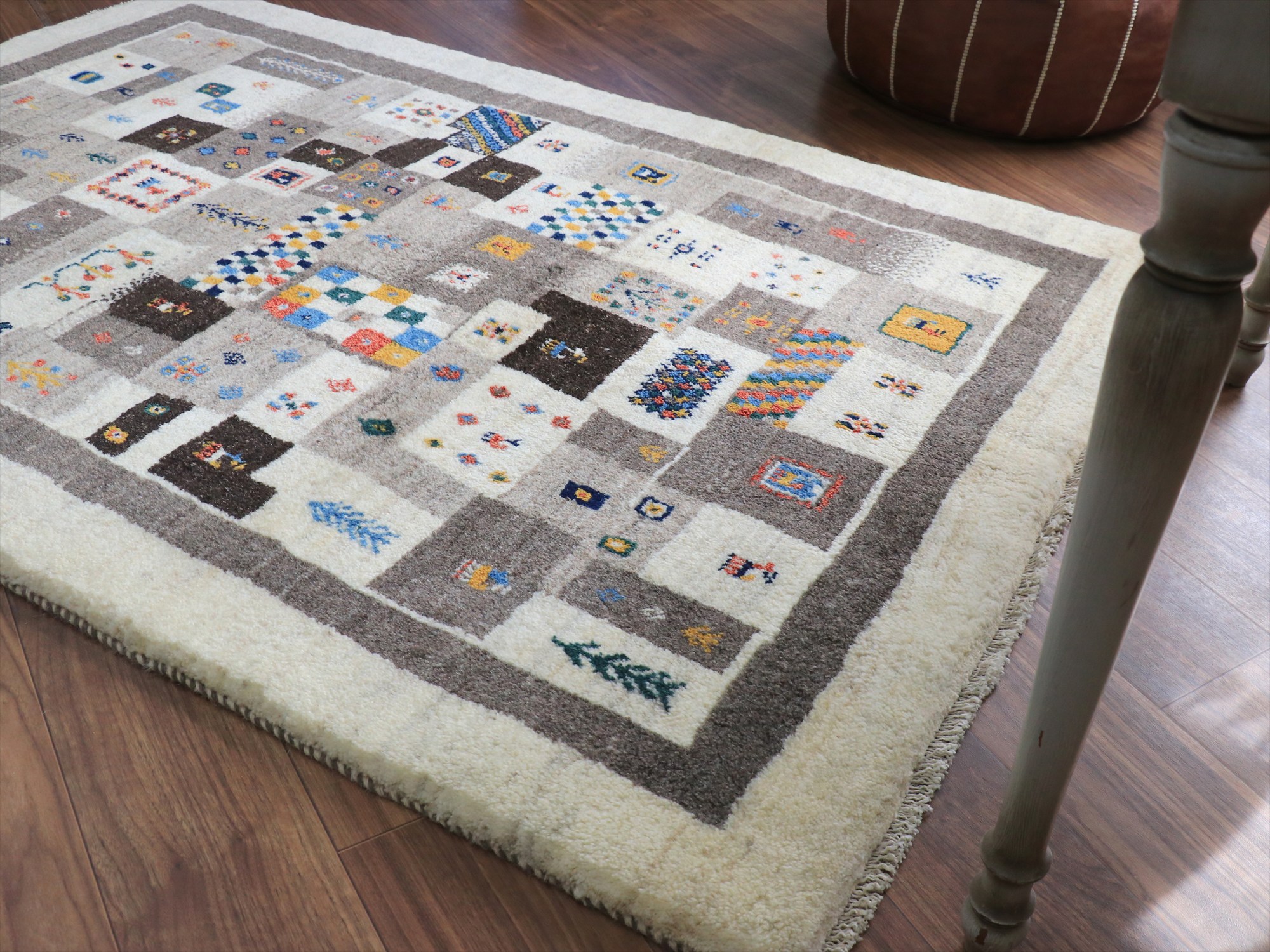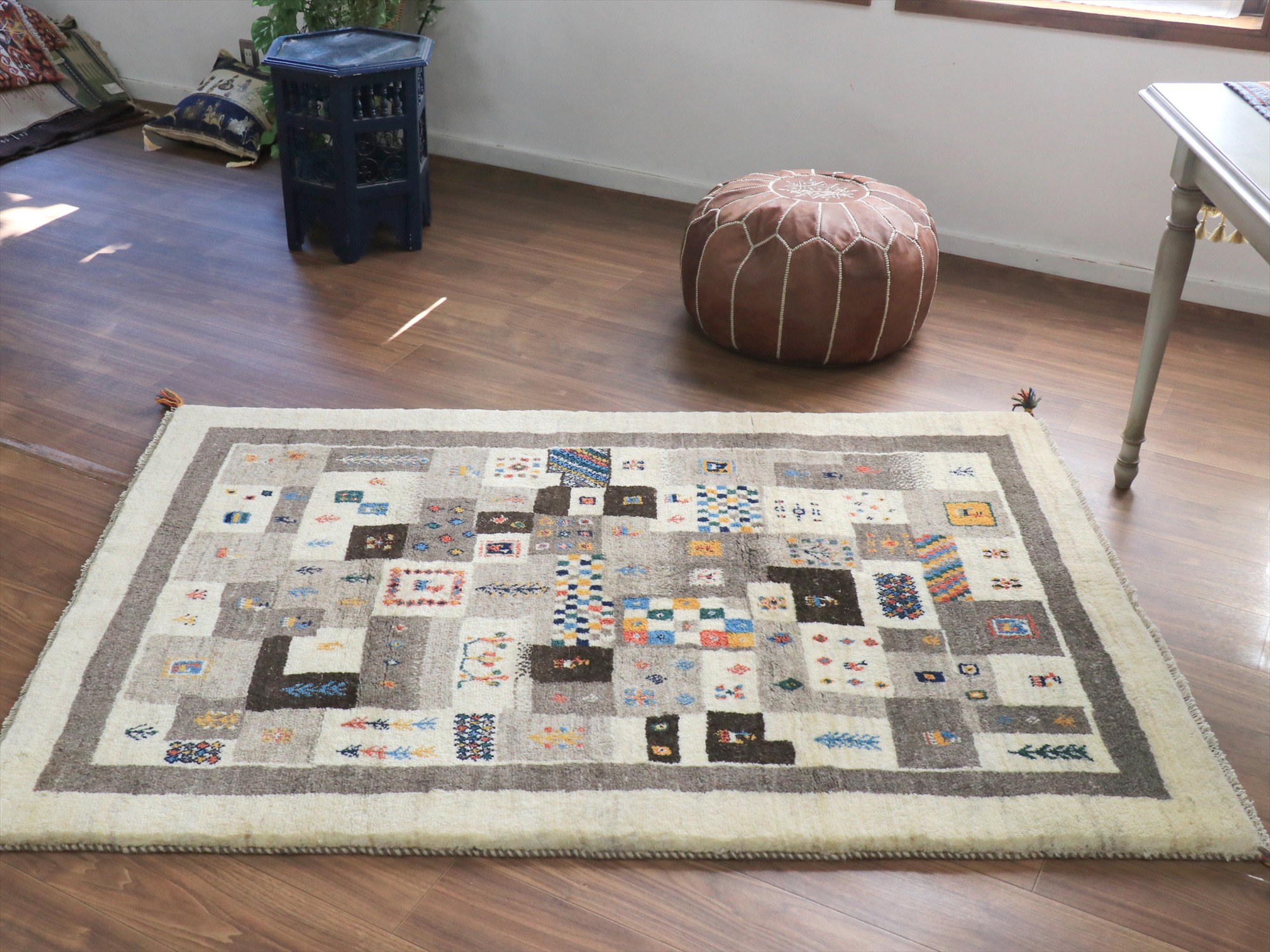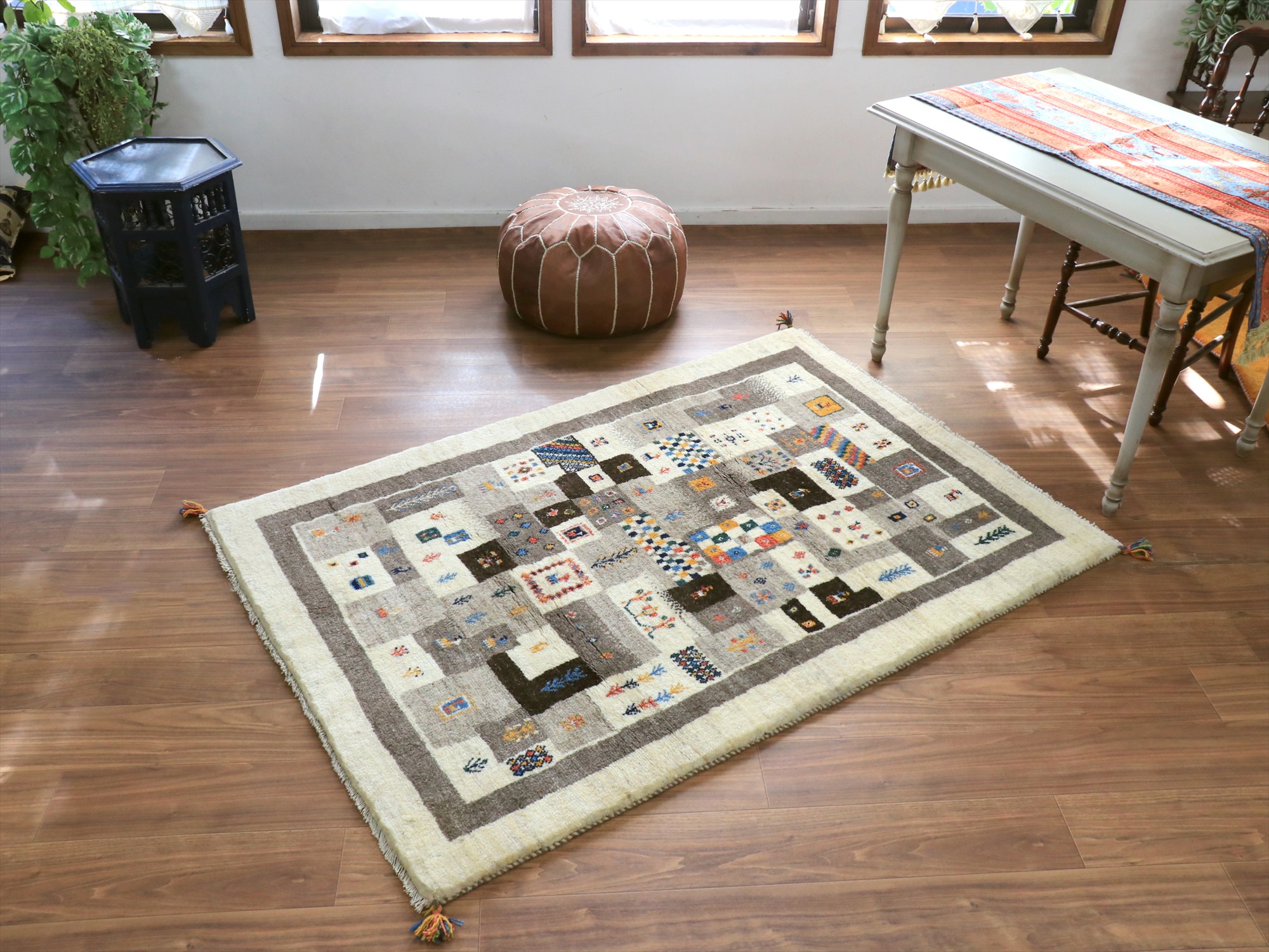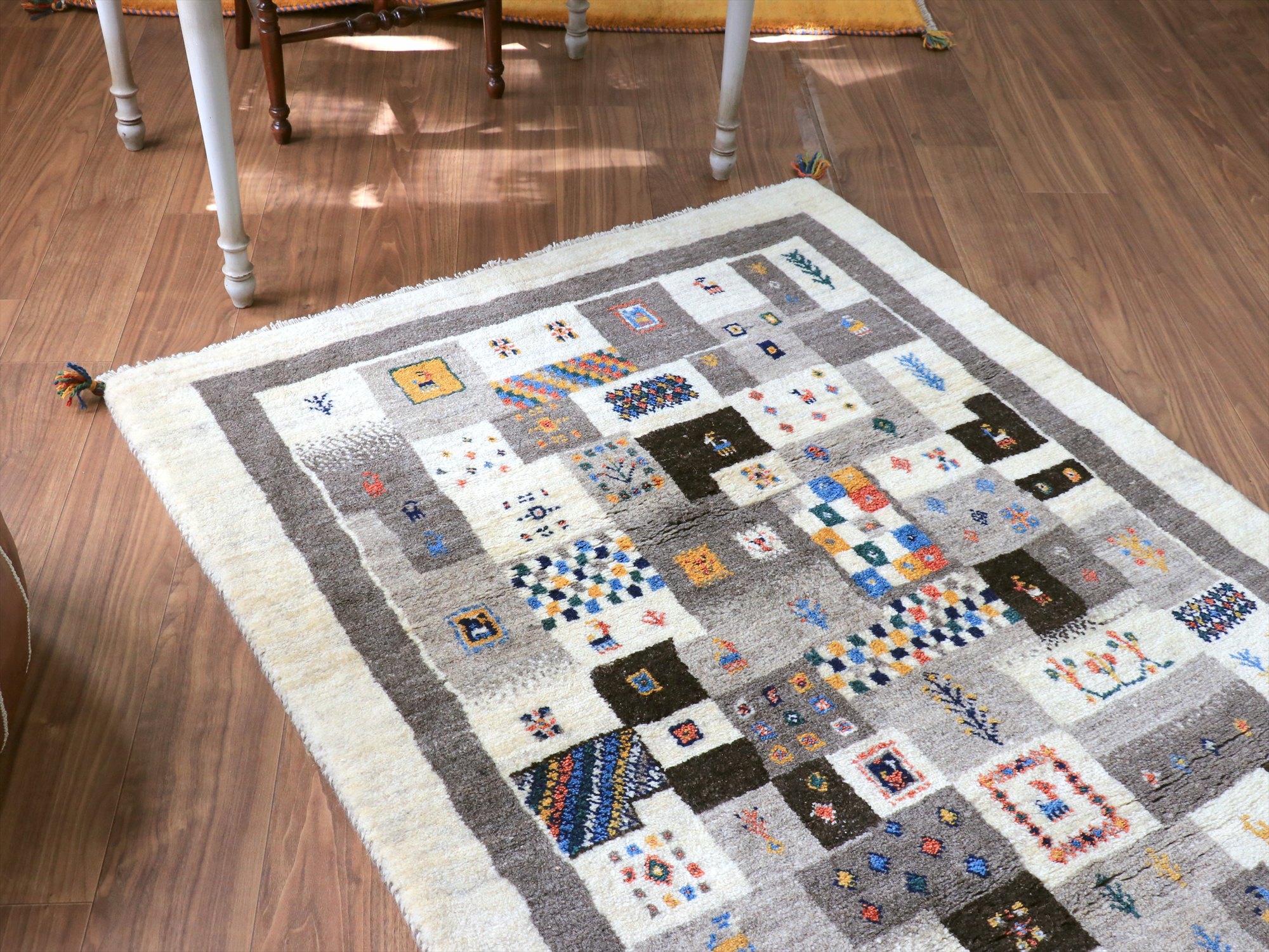 Key:ギャベ, ラグ, 手織り絨毯, 部族絨毯, 草木染, カシュカイ族, ウール製, リビングサイズ, アイボリー, グレー, 東京,中野区, ガラタバザール, Gabbeh, Tribal Rug, Hand knotted, wool, Natural dye, Shiraz, Fars, Quashkai