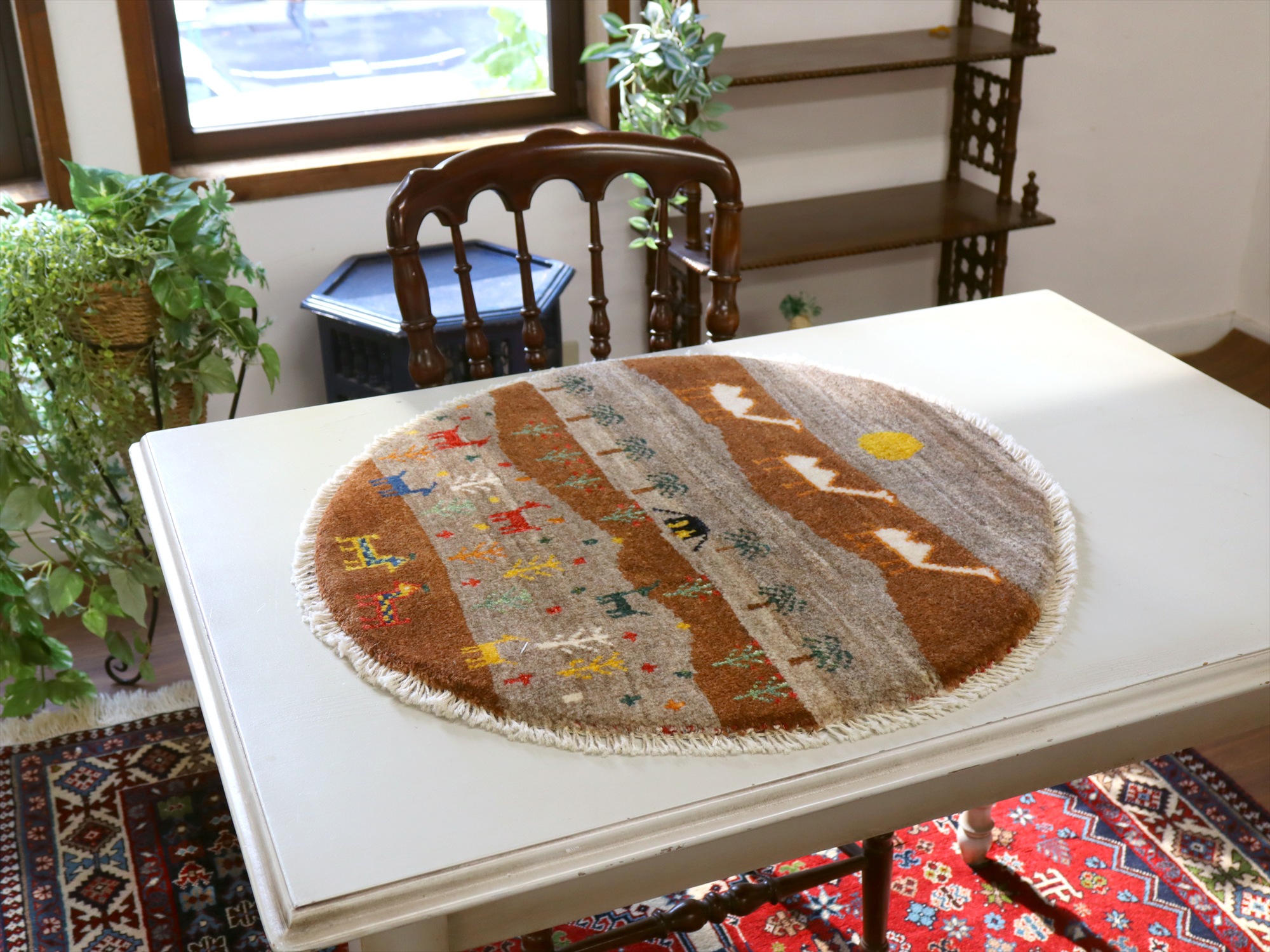 Key:Gabbeh, Shiraz, Carpet, Handmade, Hand weaven, Hand knotted, wool, Natural dye, Shiraz, Quashkai, ギャッベ, ギャベ, ラグ, まるい, 丸, 60cm, カシュカイ族, 細かい, 手織り絨毯, 草木染め, 玄関マット, ベッドサイド,