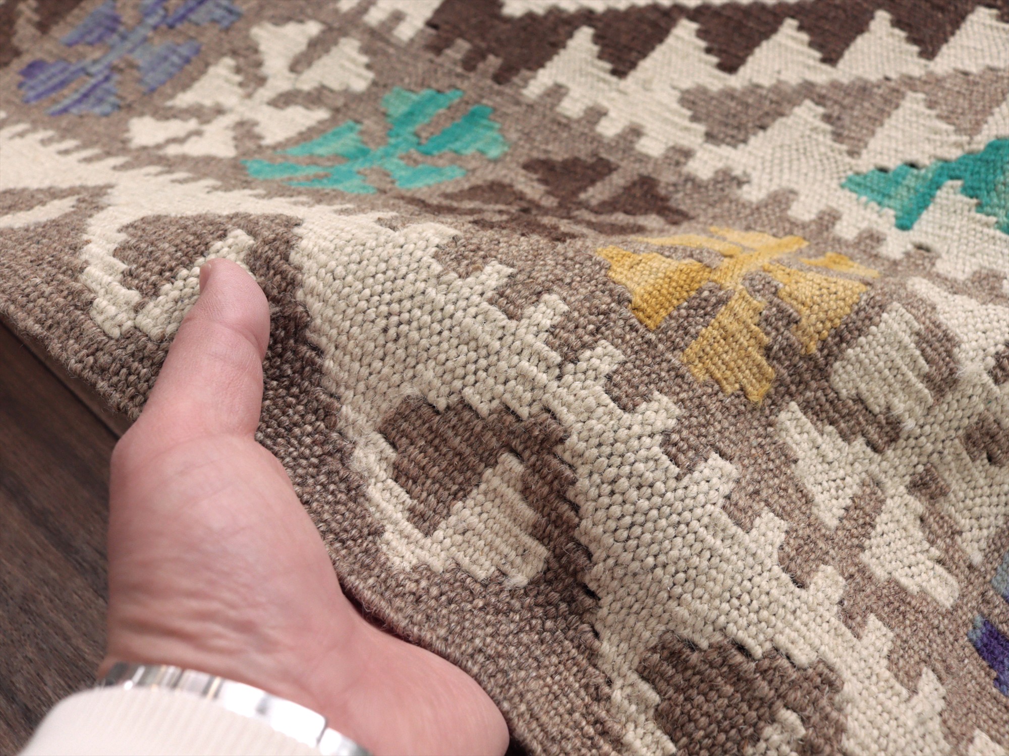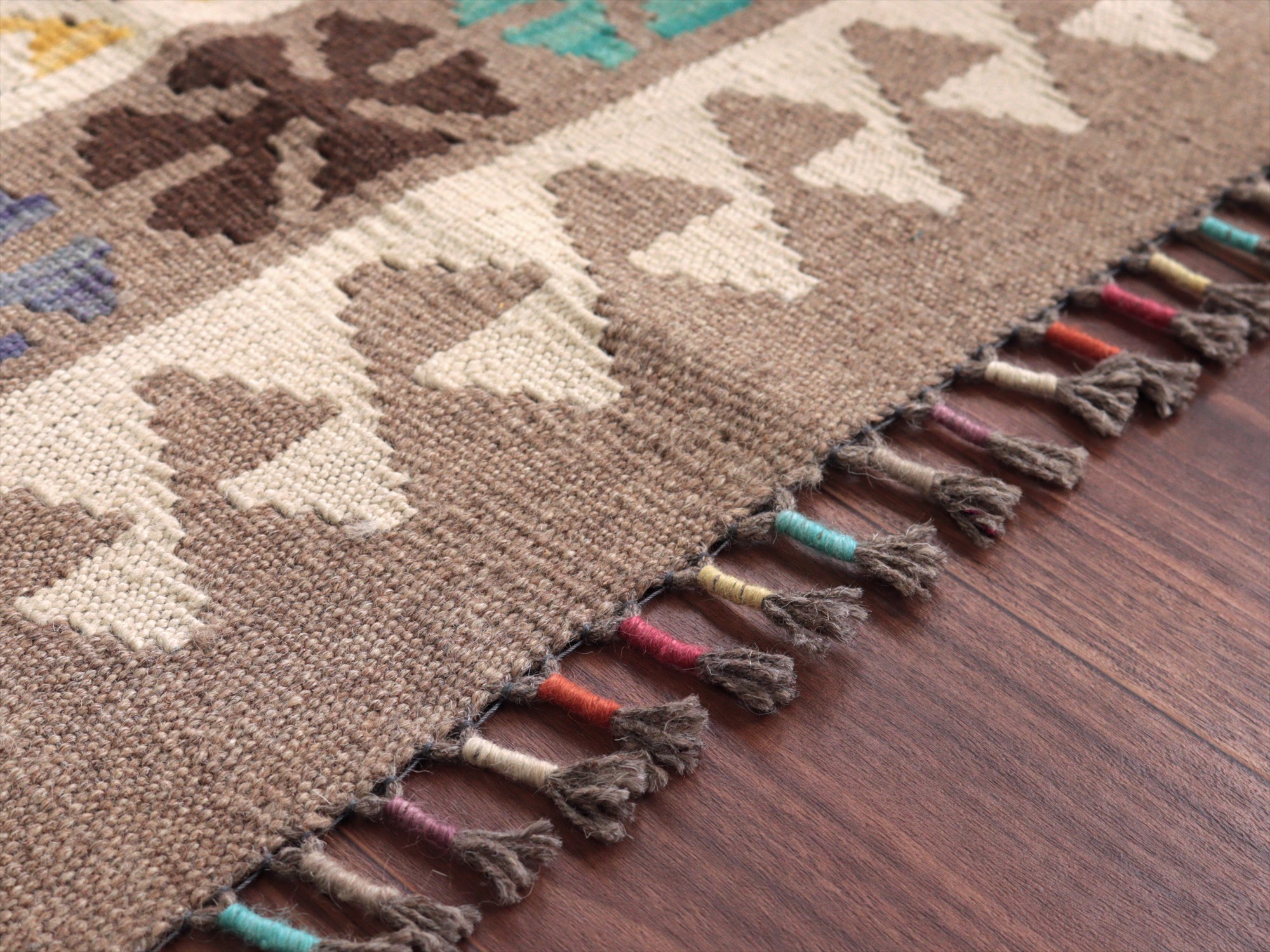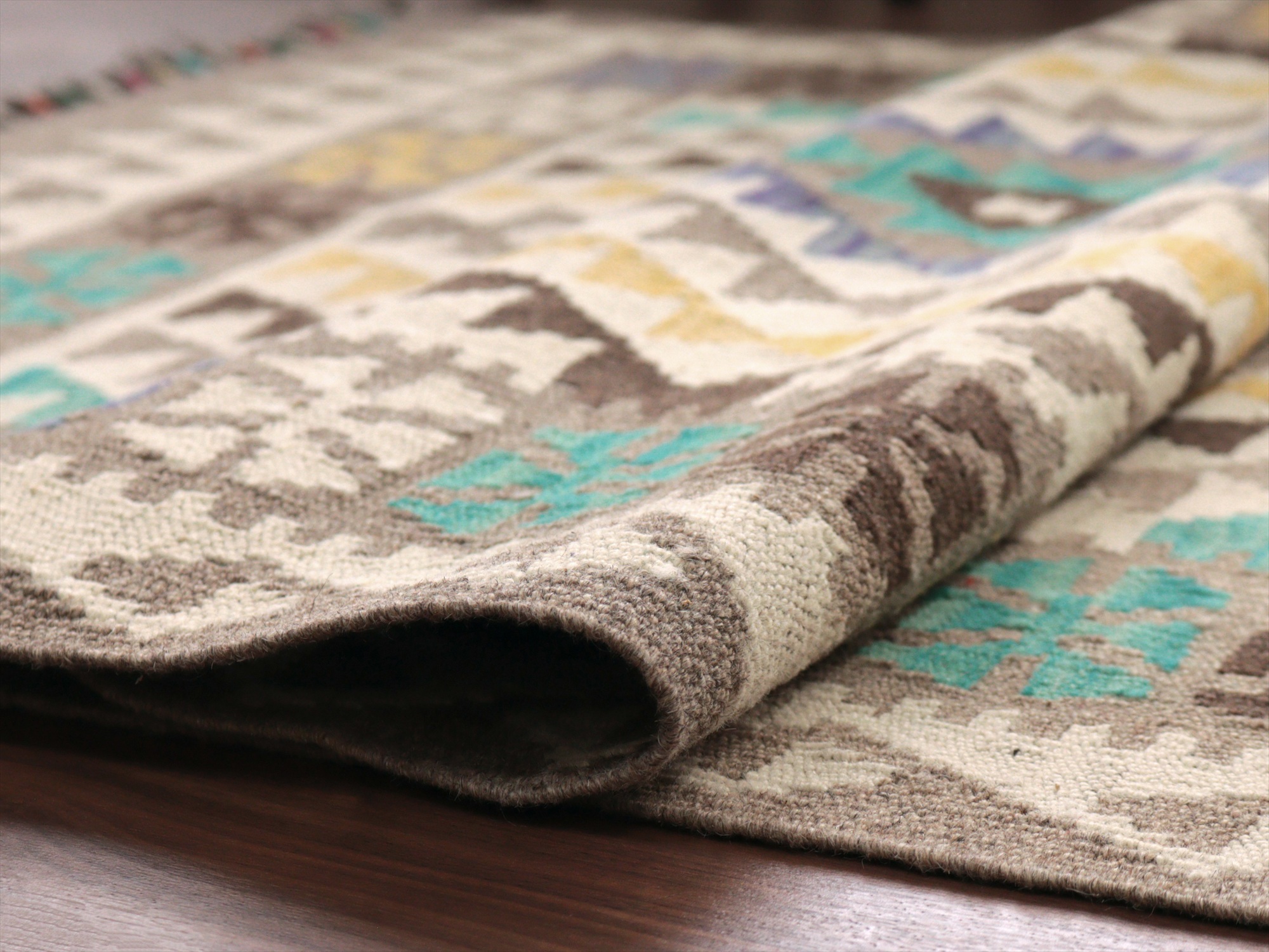 | アフガニスタンで現在織られている、手織りのウールキリムです。経糸にグレーの羊毛が使われ、房はカラフルな色糸で巻いて処理しています。天然の羊毛の色と、パープルやターコイズ、イエローといったユニークな色の組み合わせで幾何学モチーフが織り込まれています。 |