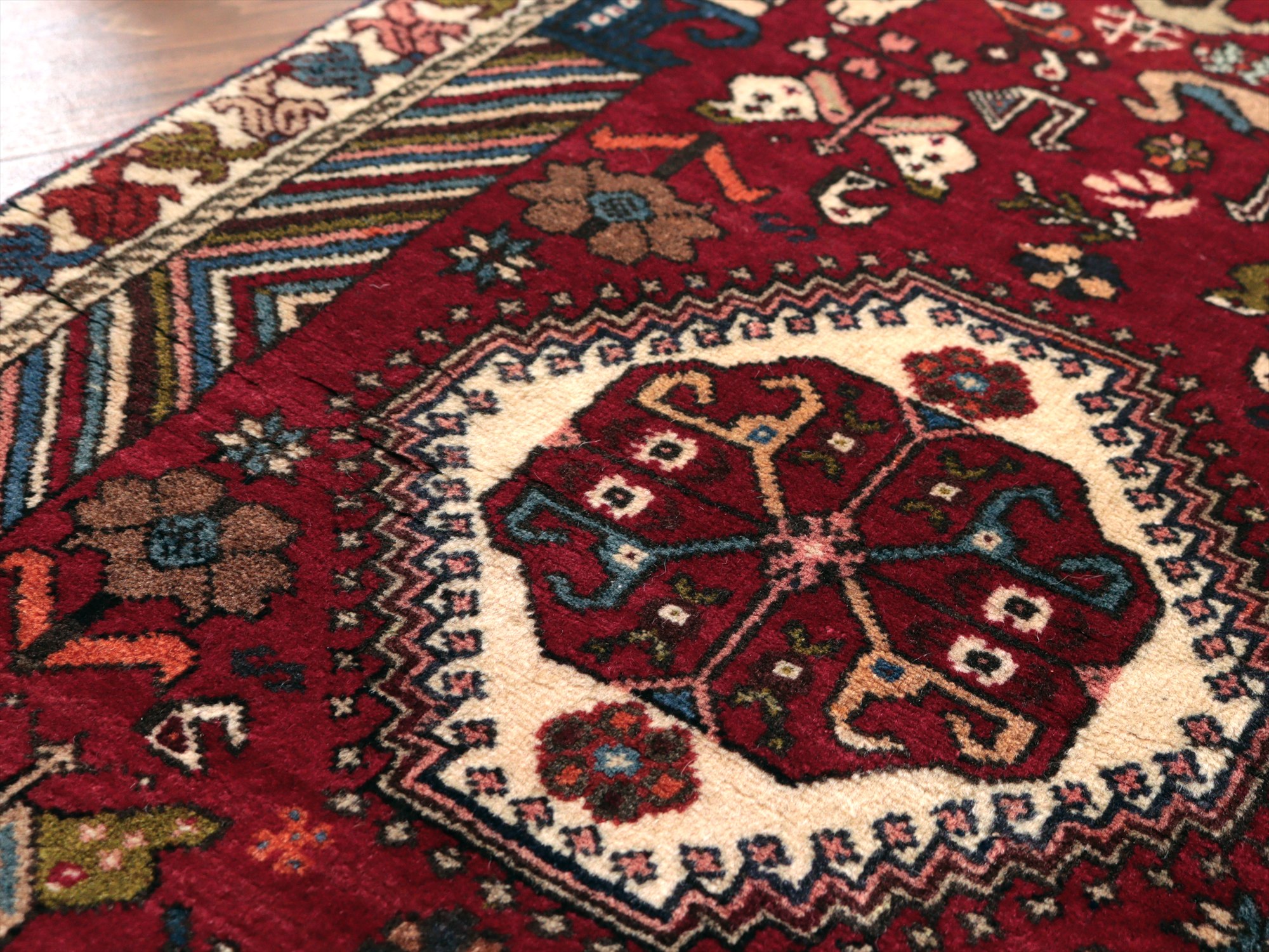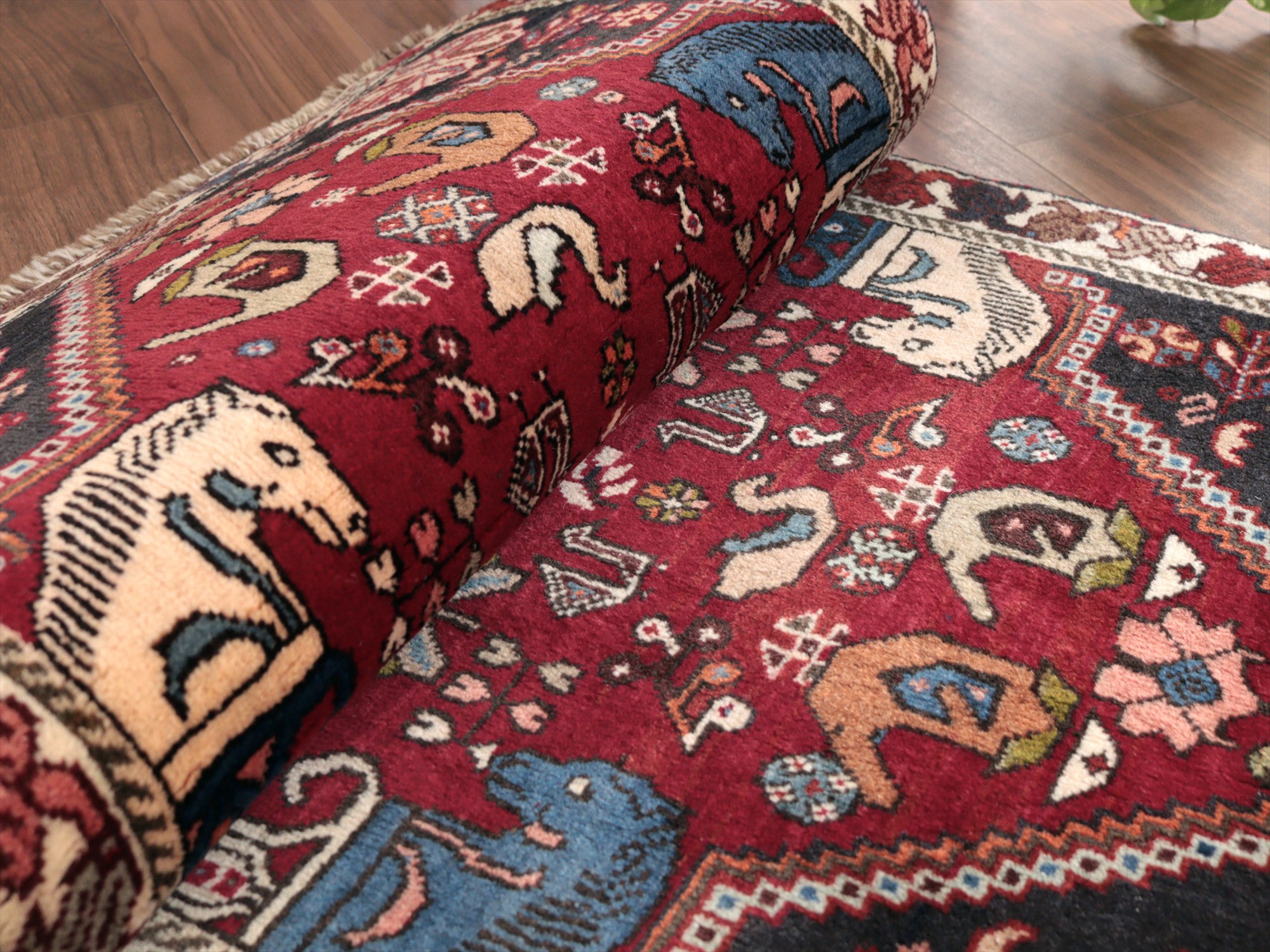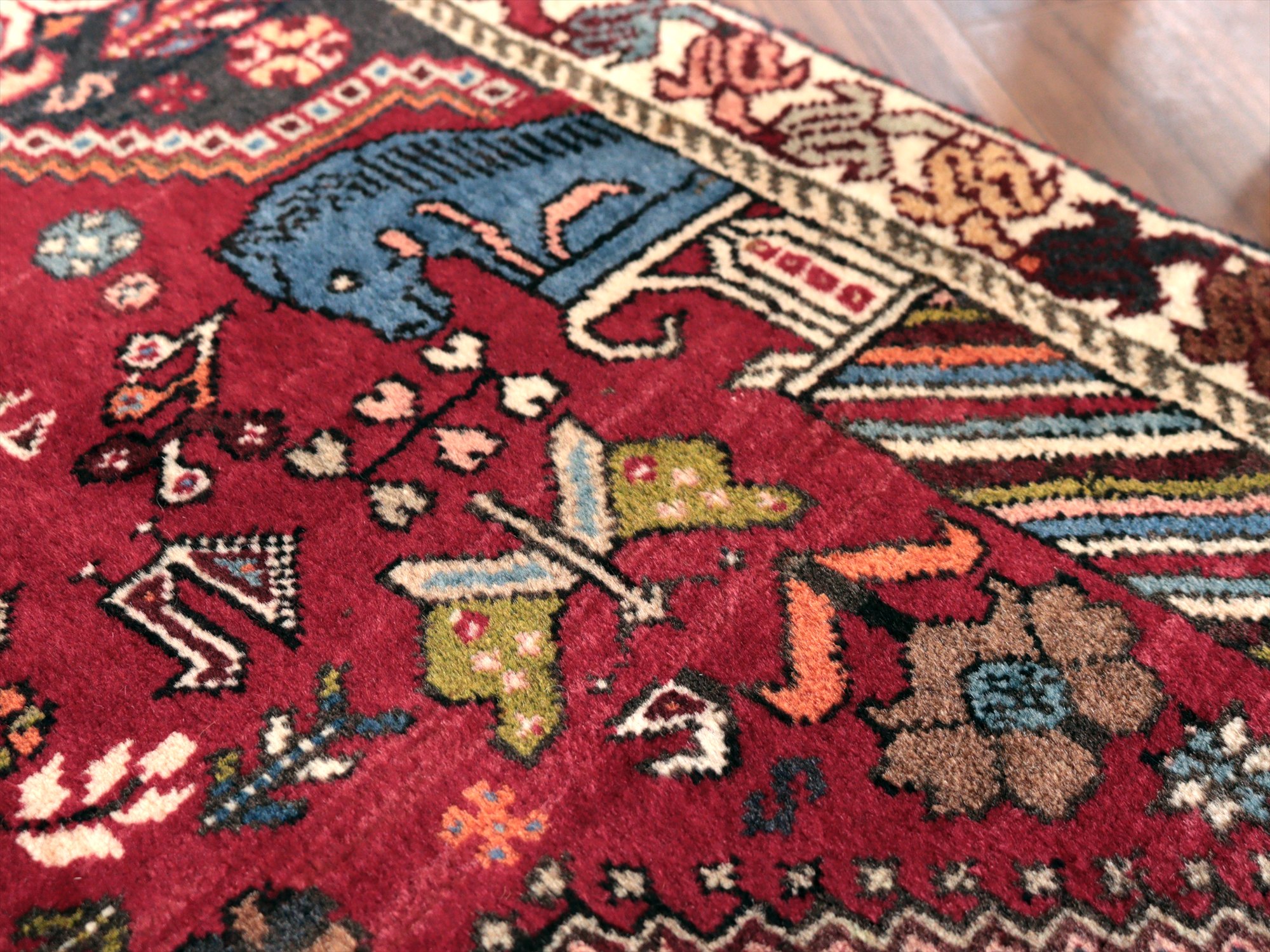 | イラン南部ファルス州で織られた伝統的なデザインの絨毯。蝶や鳥、花など様々なモチーフが織られていますが、中でも特徴的なのは、左右にあるカラフルな柱から馬の頭が出ているデザインで、これは世界遺産のペルセポリスの石柱を模したとされるものです。ボーダー(額縁)部分の花模様も、明るい色で織られていて華やかです。 |