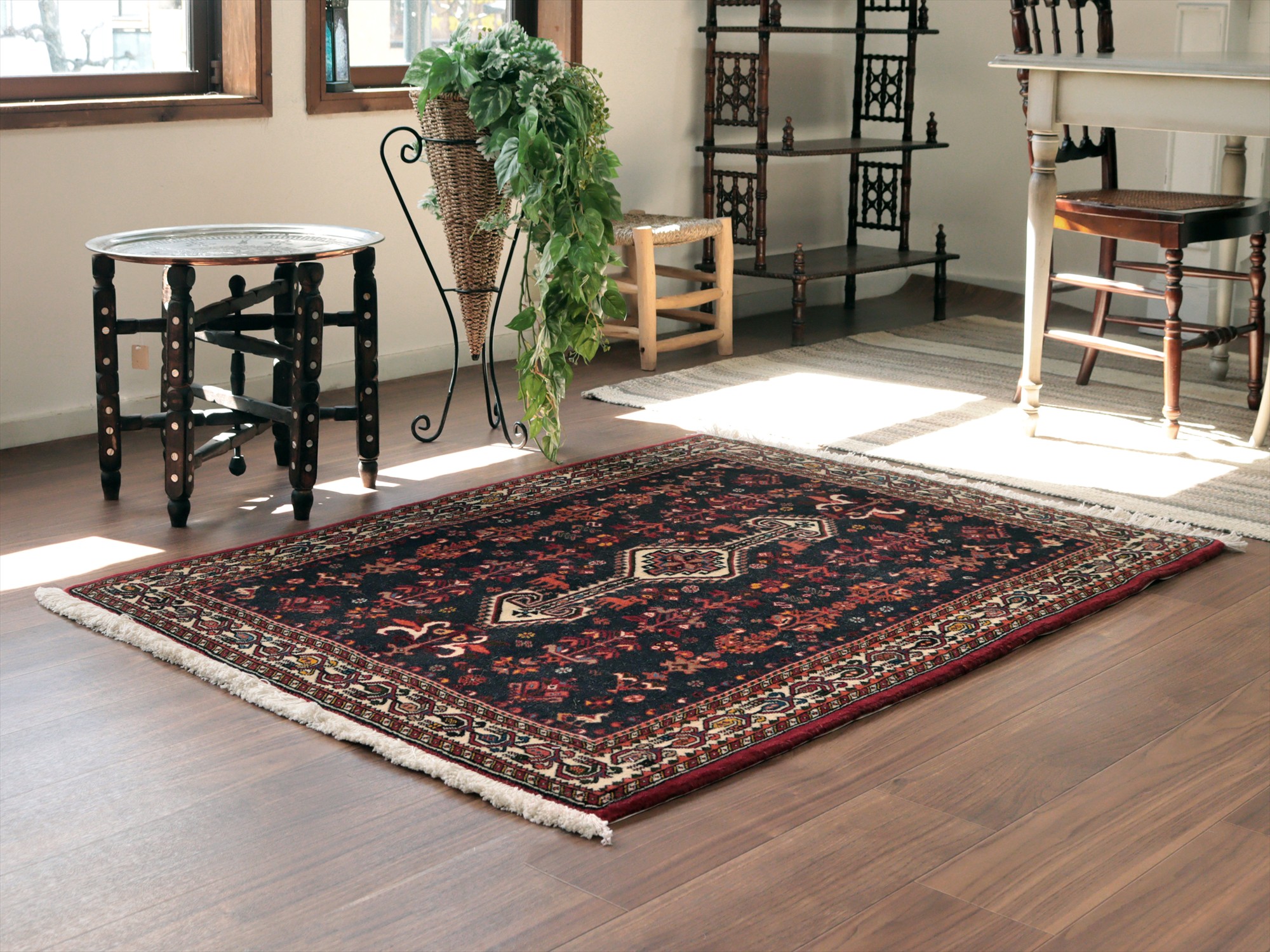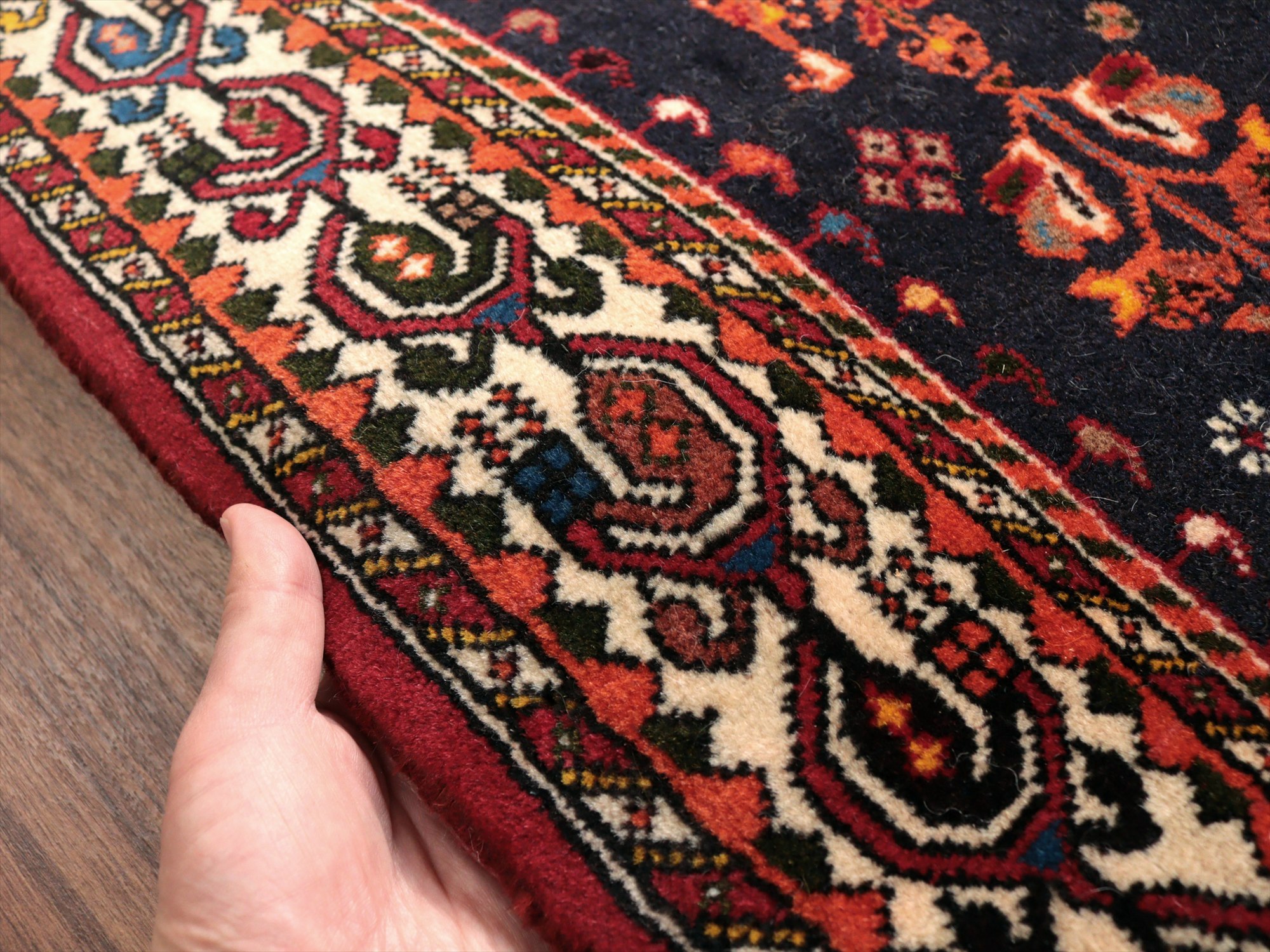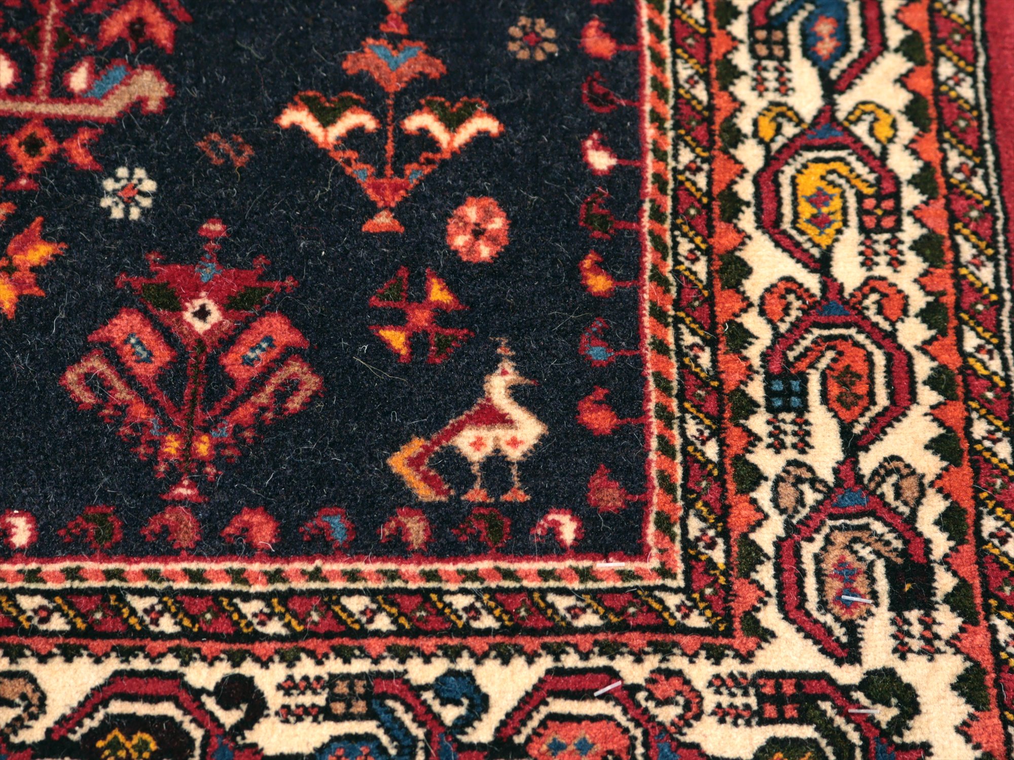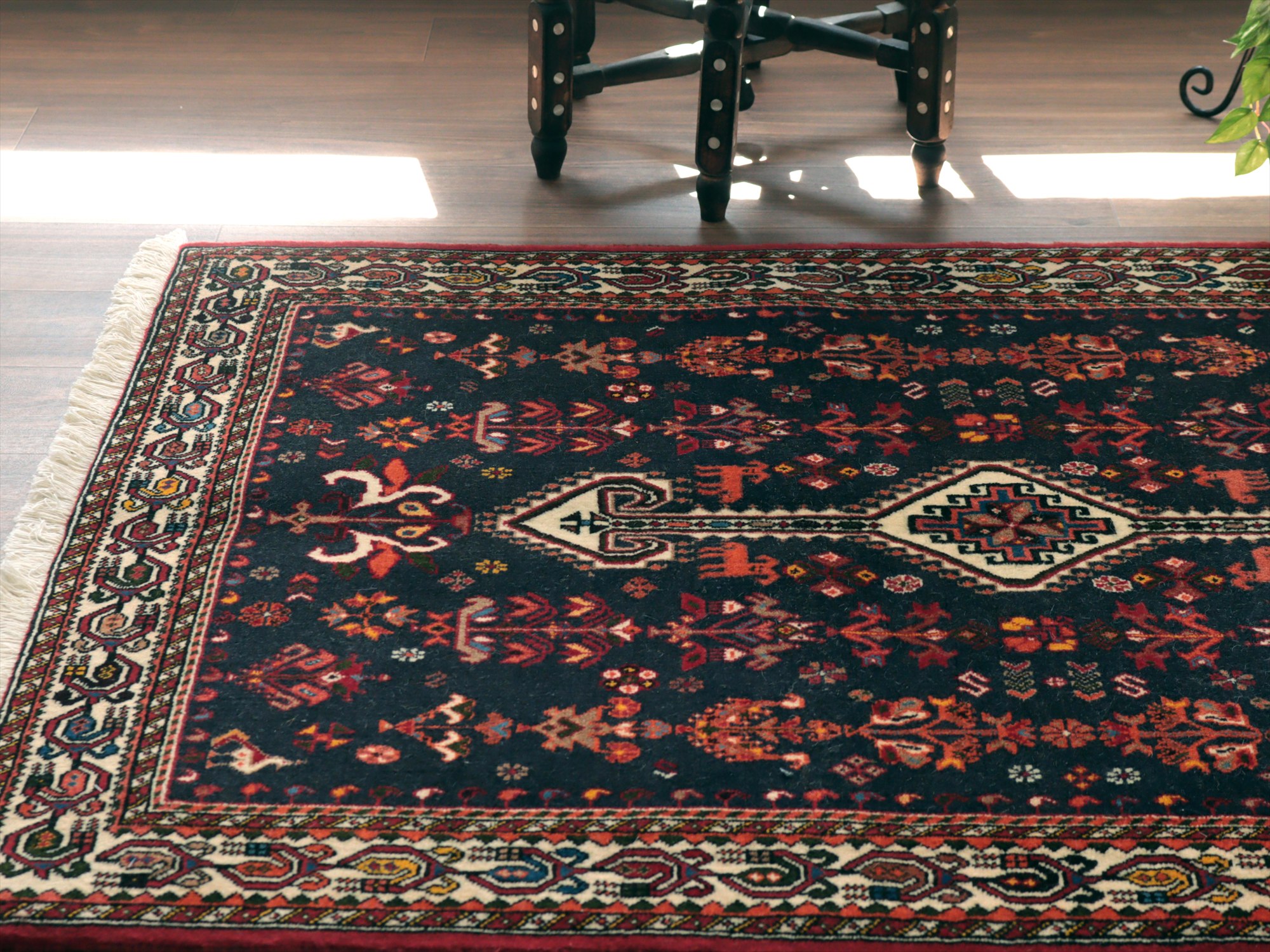 | イランのファルス州北部に位置する都市部、アバディのものとされる絨毯。花や鳥、動物などが明るい色で織られ、黒に近い濃紺のフィールドによく映えています。ボーダー(額縁)部分にはパルメット(植物模様)が連なるように織られ華やかな雰囲気です。 |