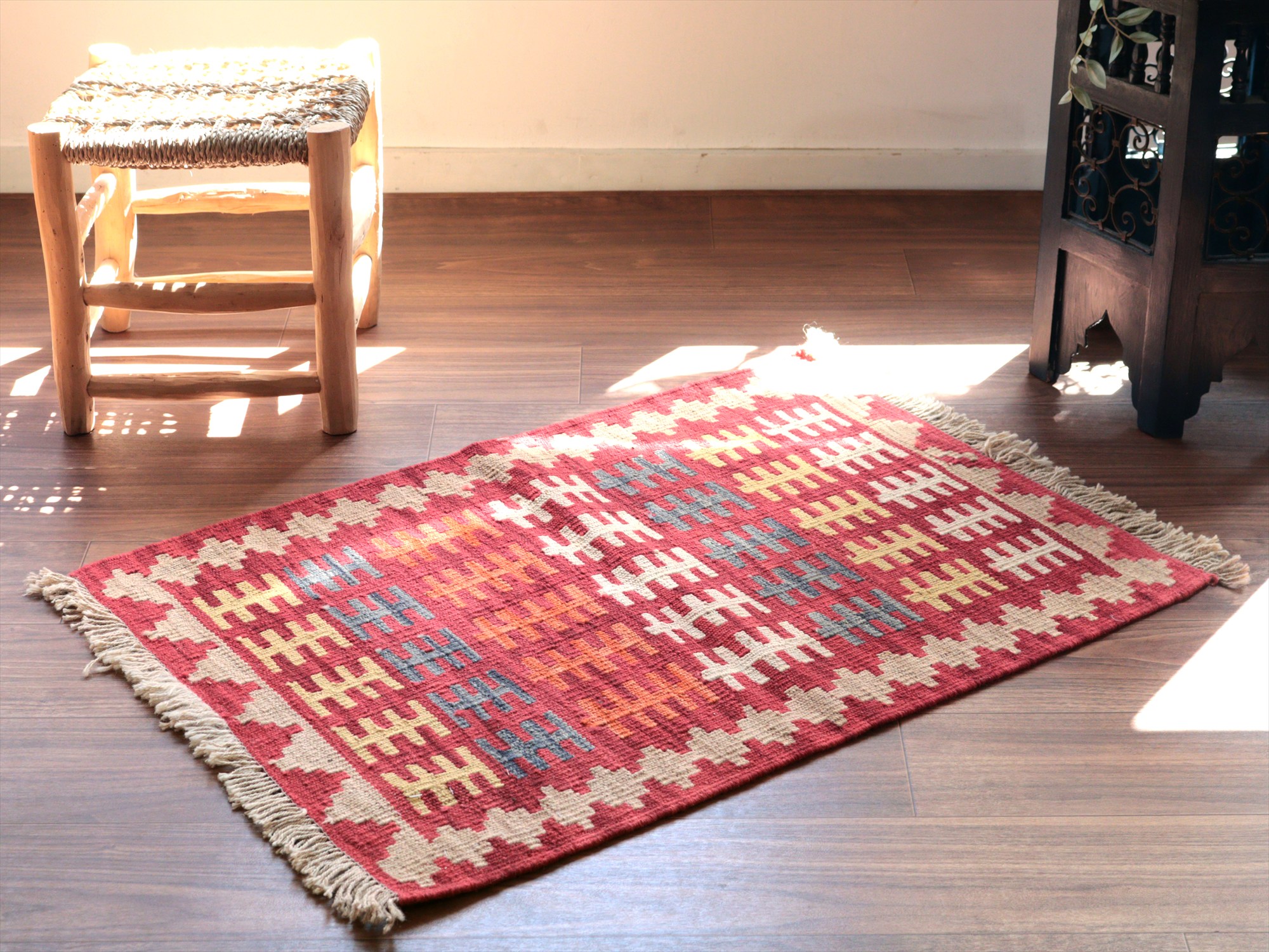 | 6-7mm程度の厚みがあり、パイル(毛足)がない平織りの敷物で表面は少しザラっとした肌ざわりです。織り手の自由なアイデアでデザインされていますので、左右対象でなかったり、モチーフが少しずれていたりということもありますが、世界で一枚だけの作品ですからその点はご了承ください。 |
