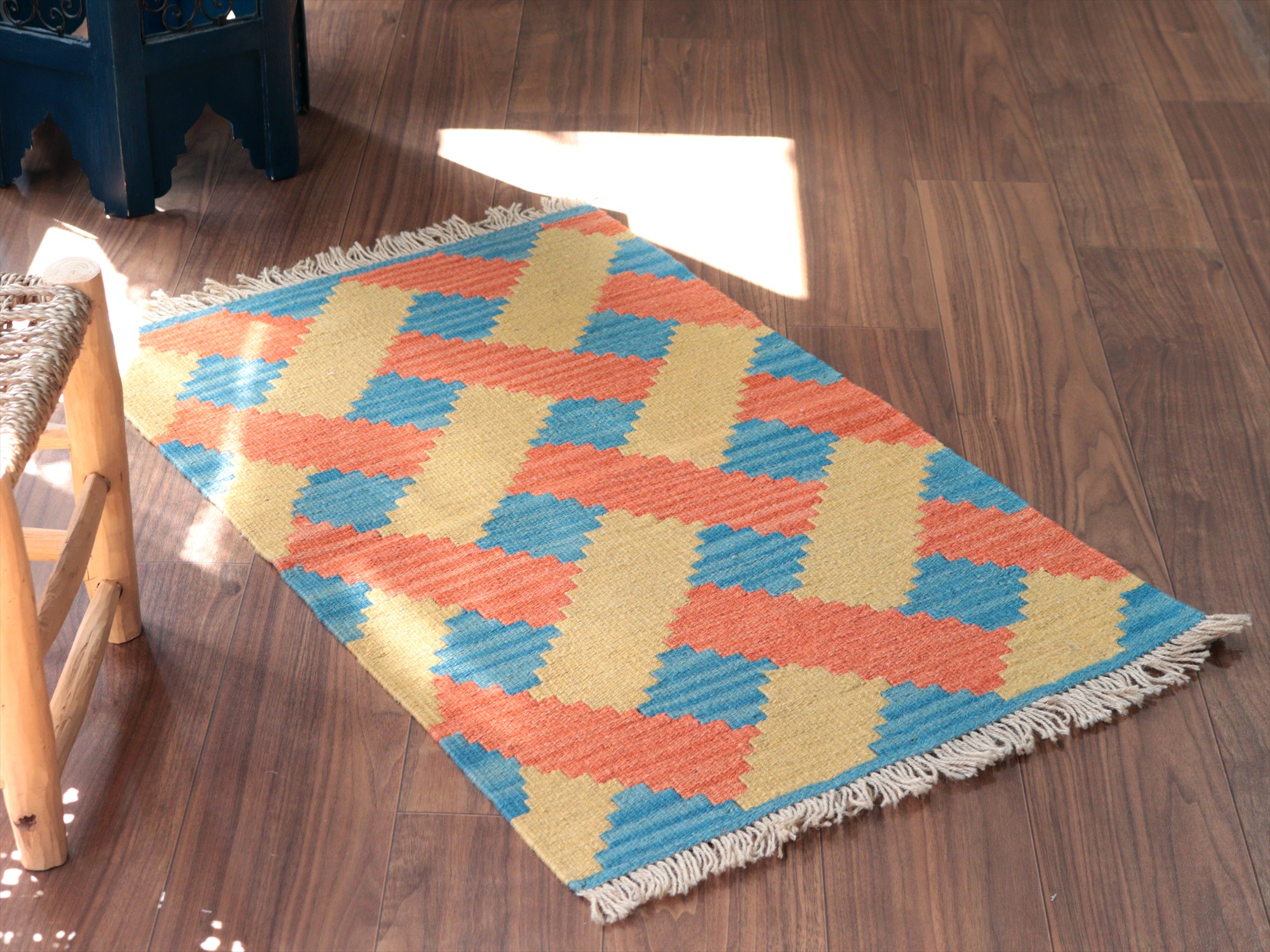 | 6-7mm程度の厚みがあり、パイル(毛足)がない平織りの敷物で表面は少しザラっとした肌ざわりです。織り手の自由なアイデアでデザインされていますので、左右対象でなかったり、モチーフが少しずれていたりということもありますが、世界で一枚だけの作品ですからその点はご了承ください。 |