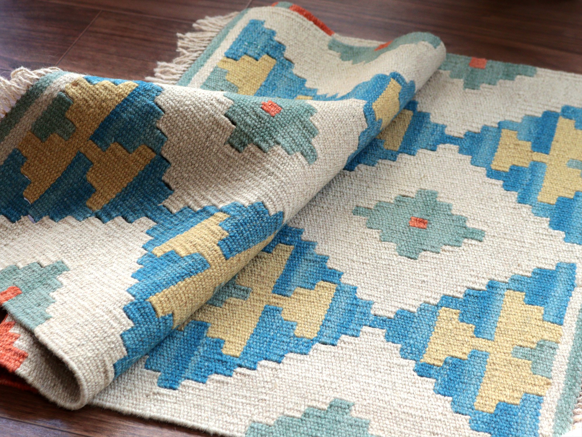 | 6-7mm程度の厚みがあり、パイル(毛足)がない平織りの敷物で表面は少しザラっとした肌ざわりです。織り手の自由なアイデアでデザインされていますので、左右対象でなかったり、モチーフが少しずれていたりということもありますが、世界で一枚だけの作品ですからその点はご了承ください。 |