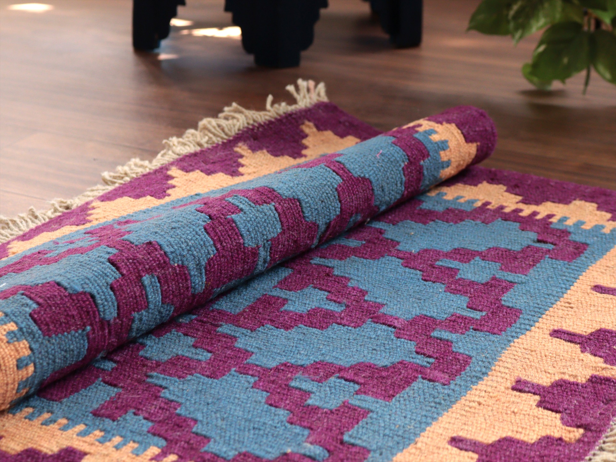 | 6-7mm程度の厚みがあり、パイル(毛足)がない平織りの敷物で表面は少しザラっとした肌ざわりです。織り手の自由なアイデアでデザインされていますので、左右対象でなかったり、モチーフが少しずれていたりということもありますが、世界で一枚だけの作品ですからその点はご了承ください。 |