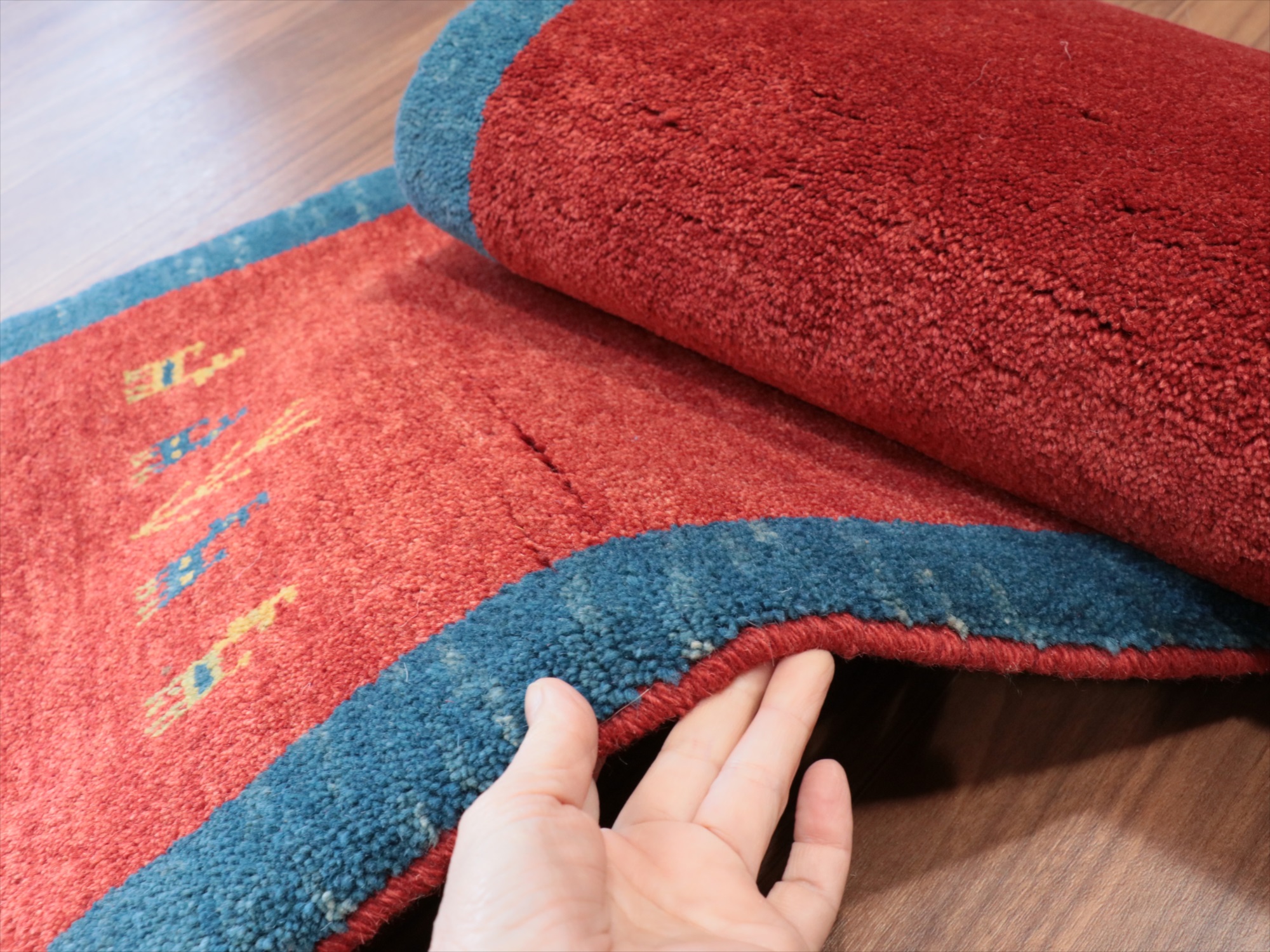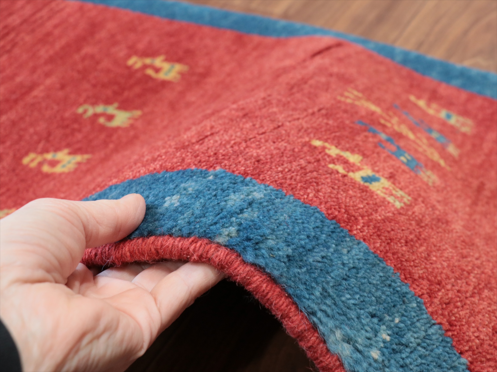 | パイルはやや短めの刈り込みで、表面は整っています。ベースを含めたギャッベ全体の厚みは、1.3-1.4cm程度で、すっきりした織り地です。 |
