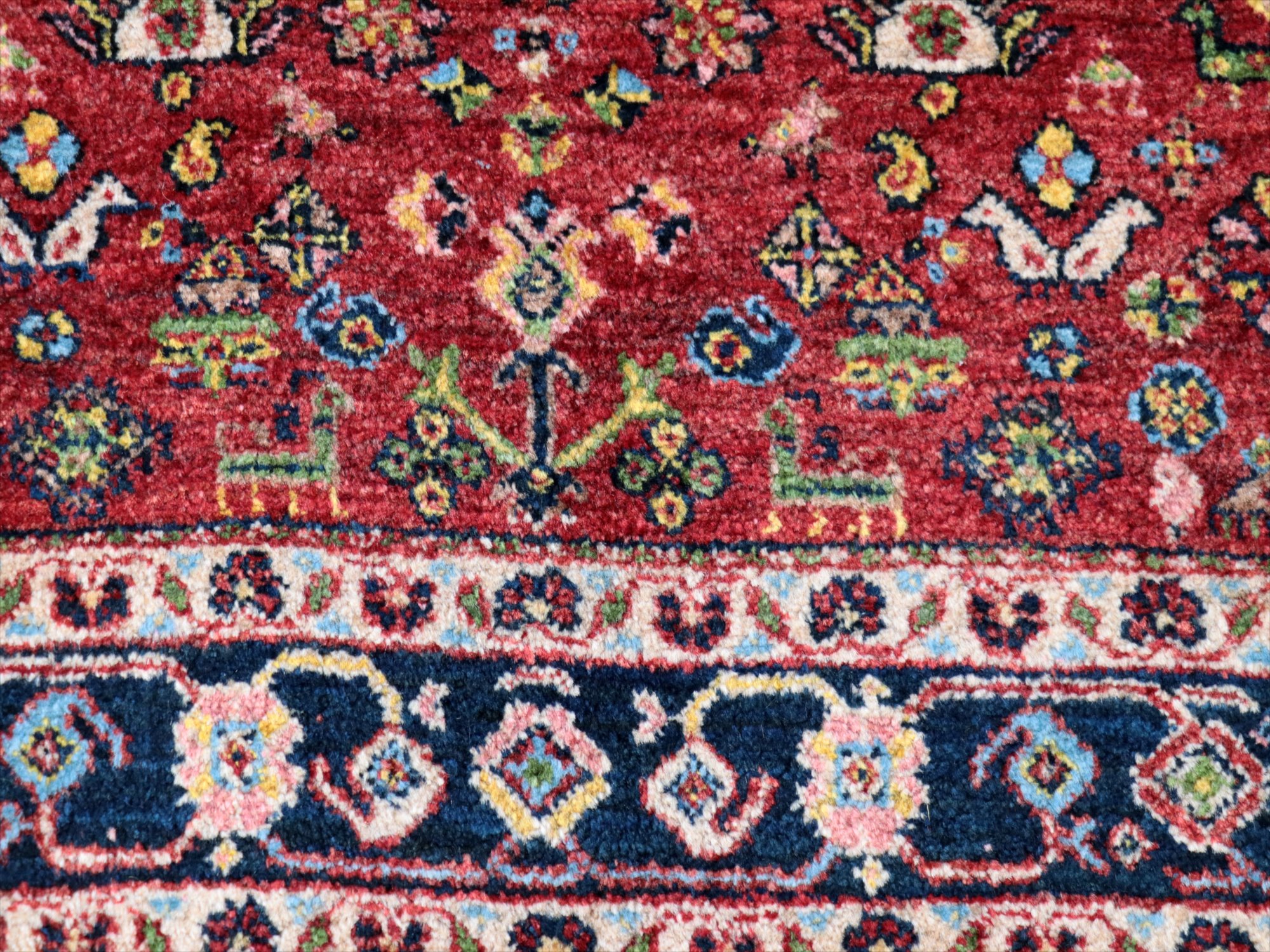 | カシュカイ族の伝統柄のメダリオンと、密度の高い織りを活かした繊細なモチーフがぎゅっと一枚に織り込まれたクラシックデザイン。動物や草花、人やペイズリーなどが緻密に織られ、 向かって右下の隅にはデザイナーのサインと思われるマークが織り込まれています。(スタンプや焼き印ではありません)織り手の自由なアイデアというわけではなく、モチーフ使いや色などを指定して、織り進めたということなのでしょう。バランスよく整って、トライバルラグとペルシャ絨毯の中間的なイメージです。 |