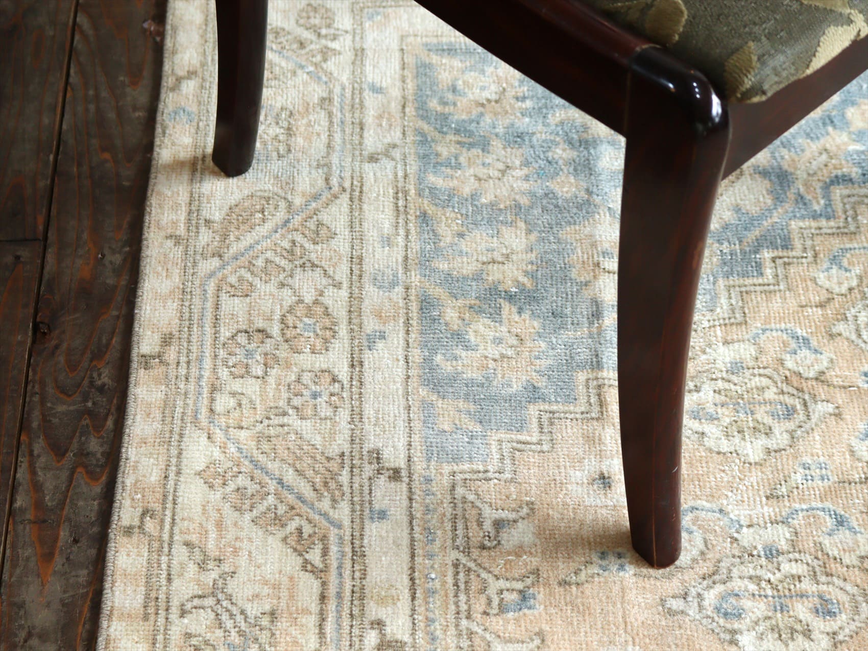 | ダメージが多く、使われなくなった古い手織りカーペットを、洗った上でブリーチをかけたユーズドラグです。当店では、アナトリア(トルコ地方)のオールドカーペットのみを使っています。擦りきれたパイルの下に、オリジナルのデザインが見えています。 |