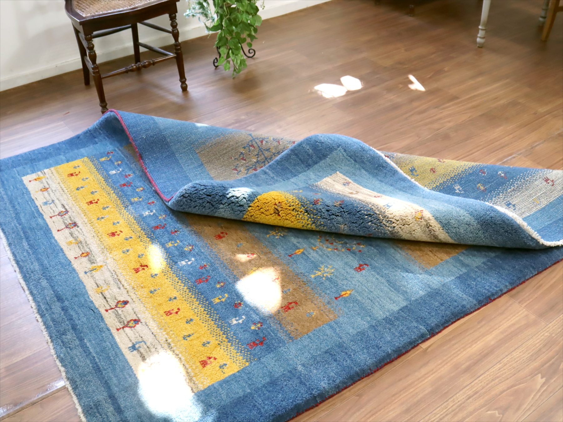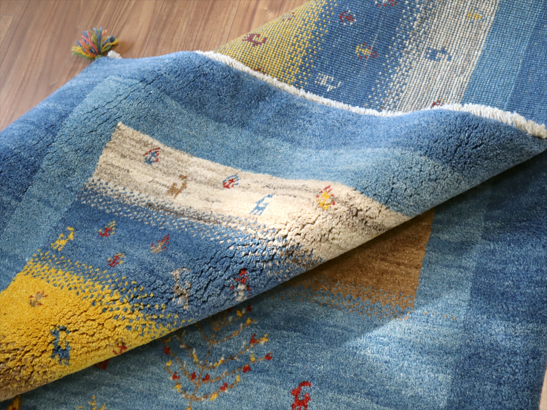 ギャッベ イラン産手織り 202x160cm ブルー&イエロー 生命の木 毛足の長いふかふかな織り