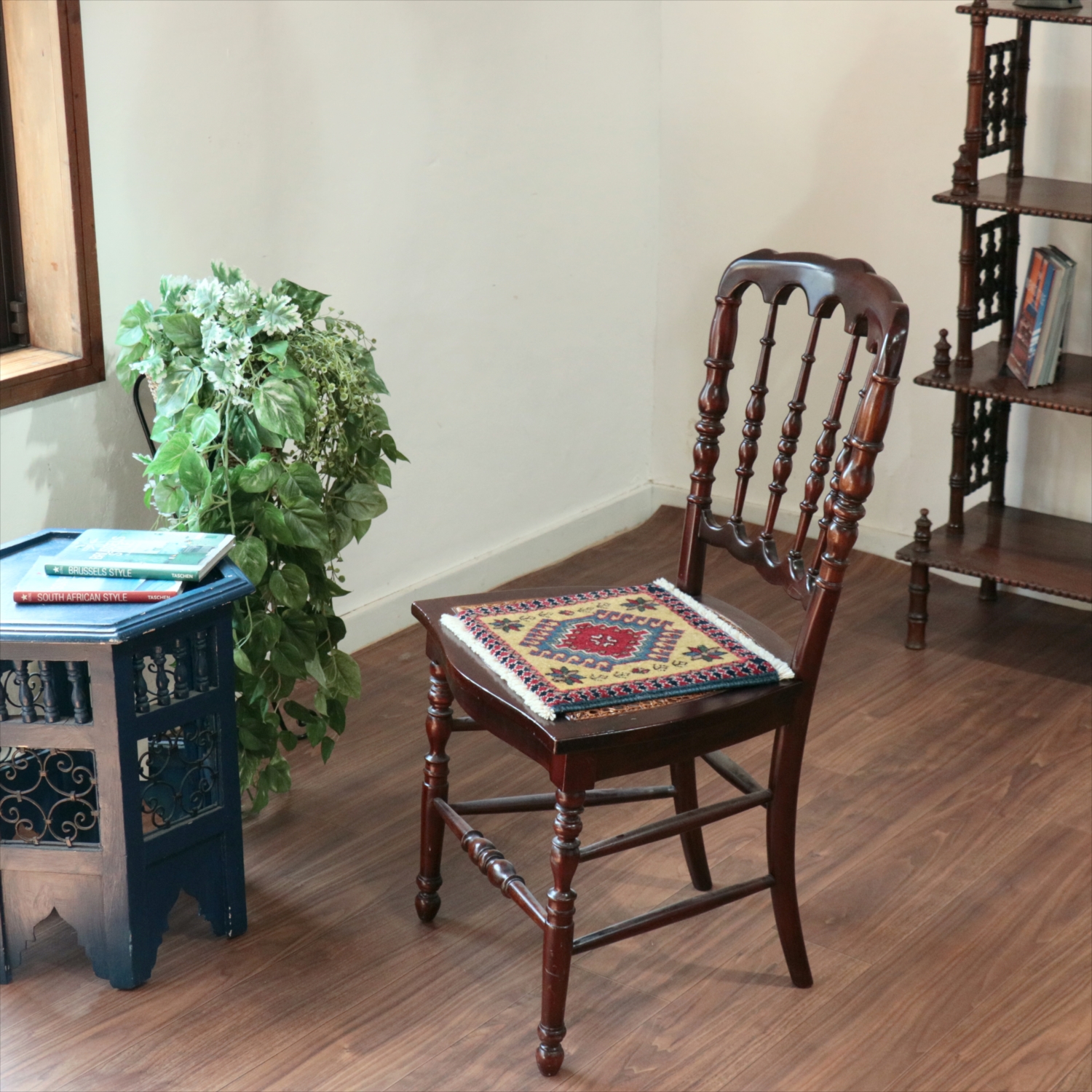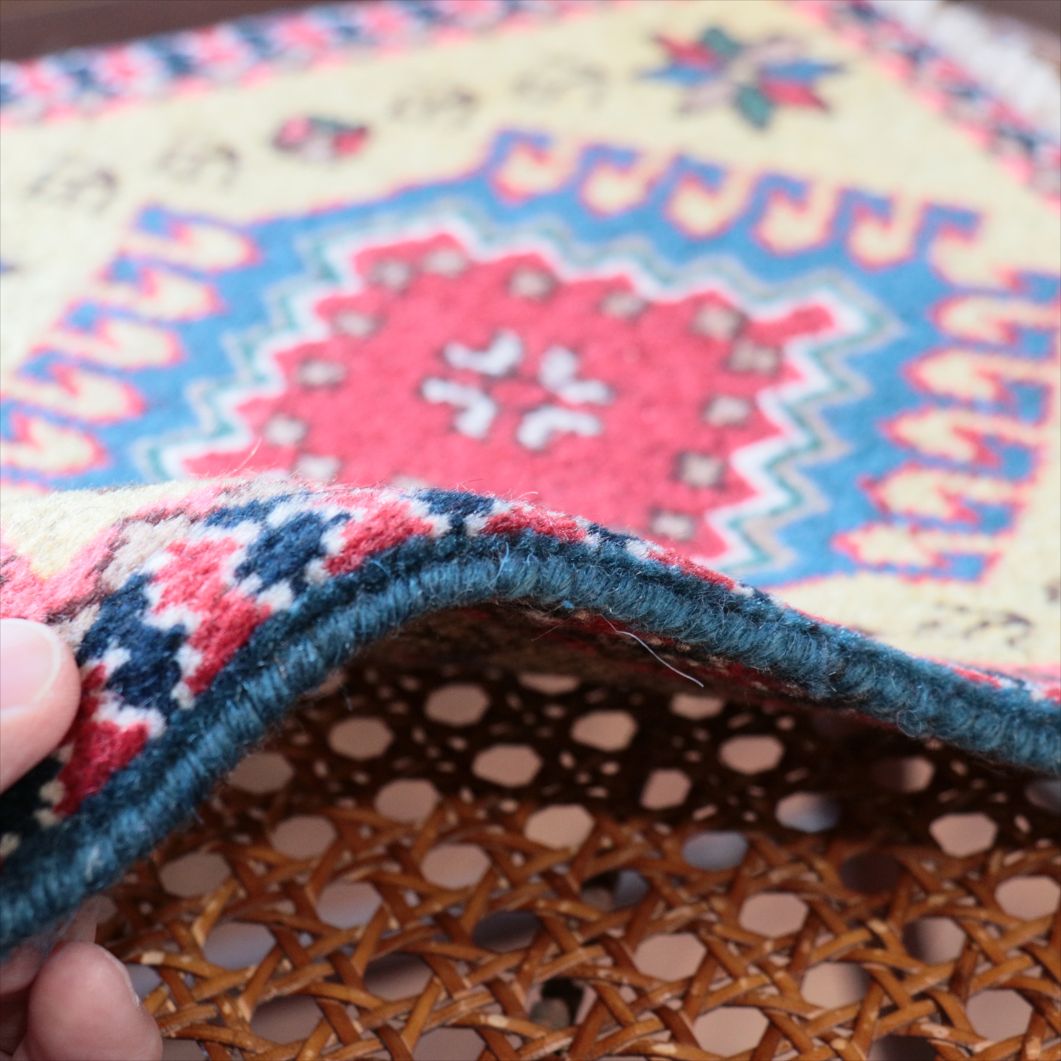 30cm角のミニサイズのラグ。小さいながらも、織りはしっかりしていて本格的です。多少ゆがみが気になりますが、ゆがみも含めて素朴な感じをお楽しみいただければと思います。