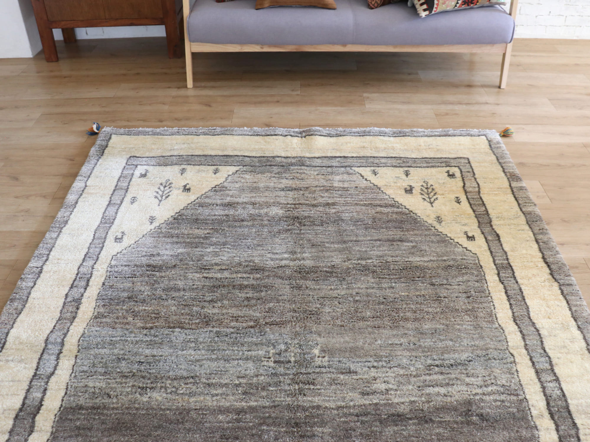 | 古い時代のカシュカイ族のギャッベにもみられる伝統的なデザインが再現されています。中央のグレー、外側のアイボリーともに、無染色の天然の色のみが使われています。中央のグレー部分は、羊毛の色の違いによってグラデーションができていて、奥行きが感じられます。 |