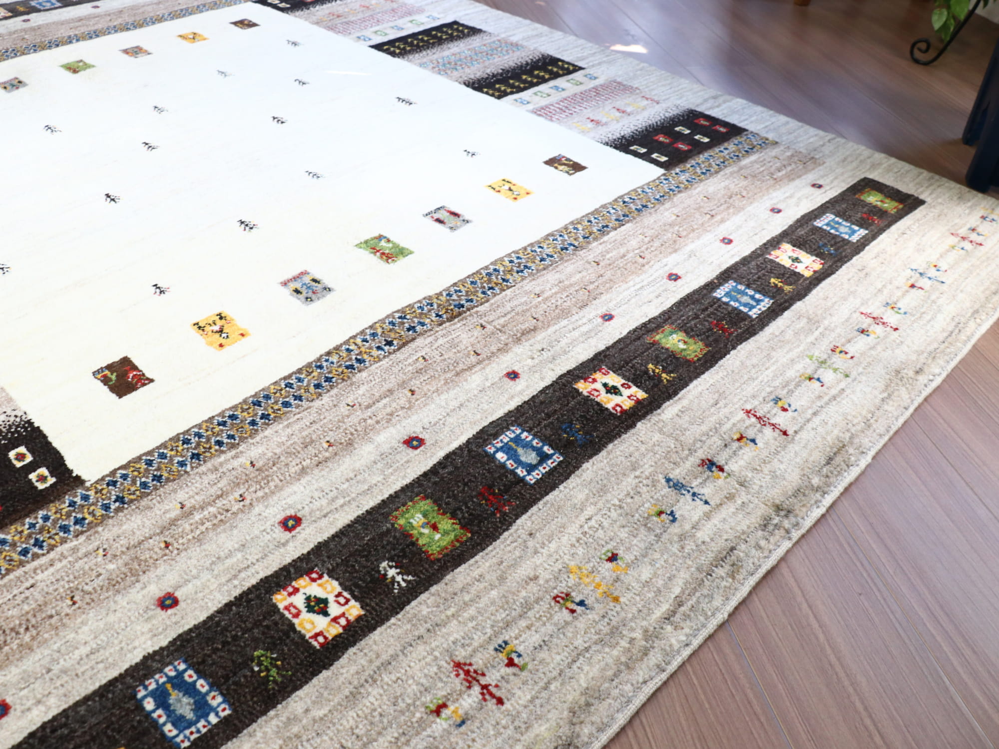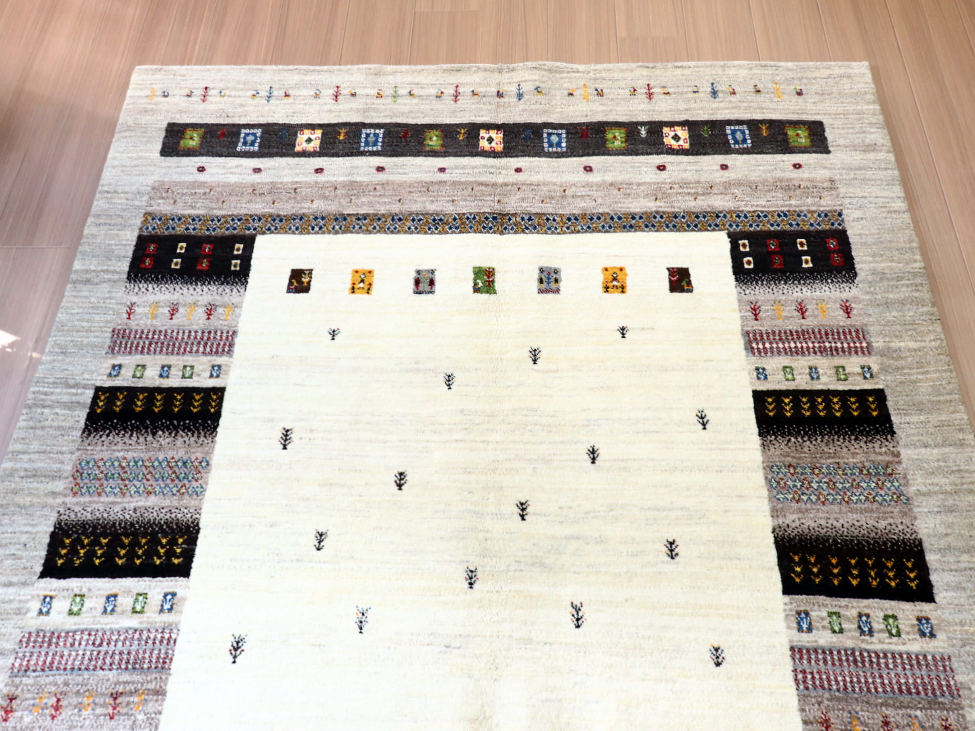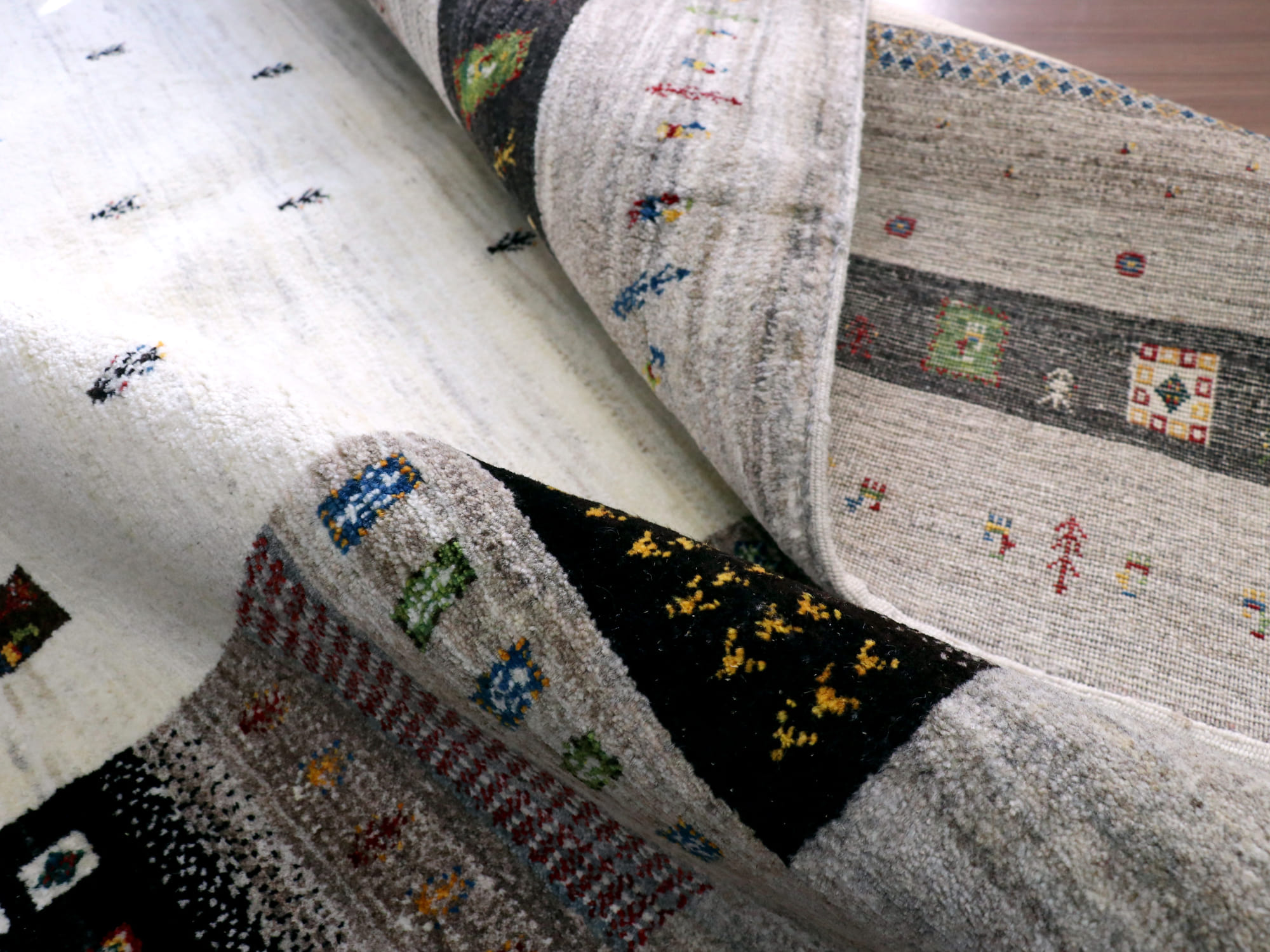 染めていない羊毛の色を使った、アイボリー、グレー、ベージュを巧みに組み合わせたボーダーデザインのギャッベ。織り目の細かなギャッベならではの、繊細で緻密なモチーフもカラフルな糸で織り込まれ、いつまで見ていても飽きることのない素晴らしい仕上がりの一枚です。