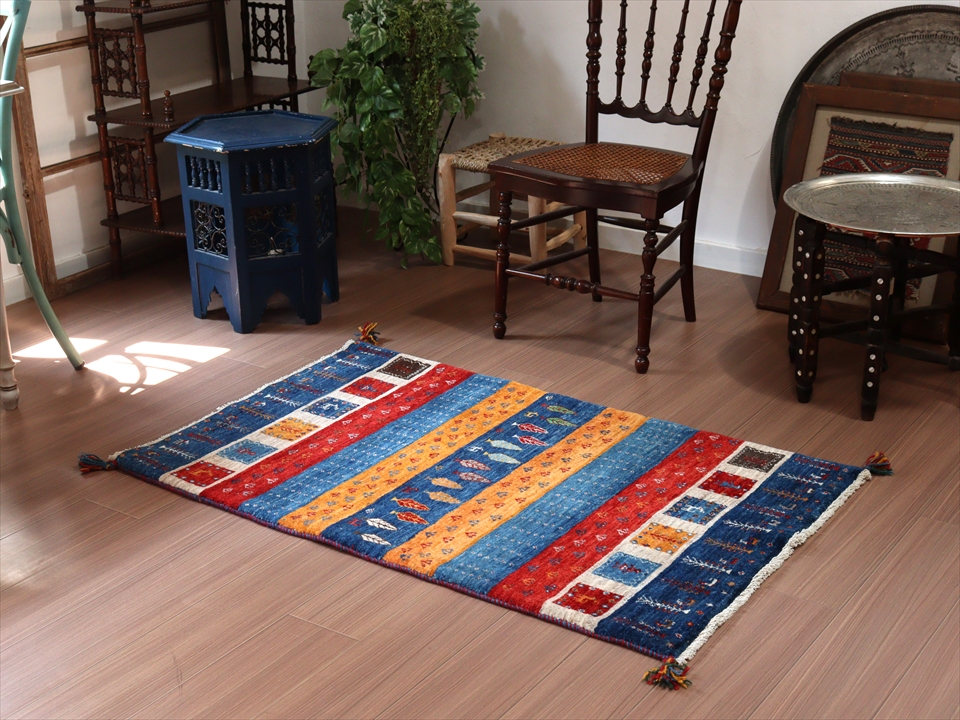 ギャッベ イラン産 手織り 127x80cm 鮮やかな色合いのボーダーデザイン