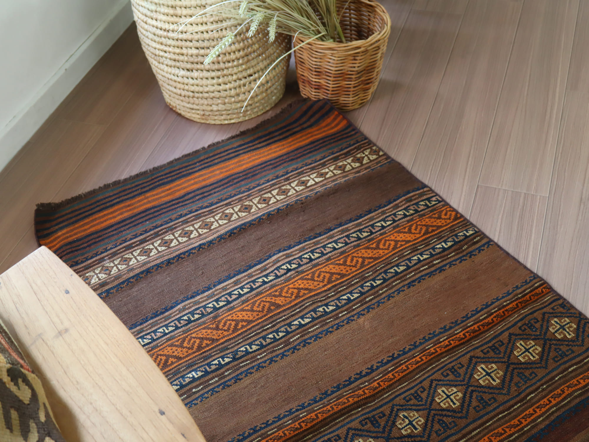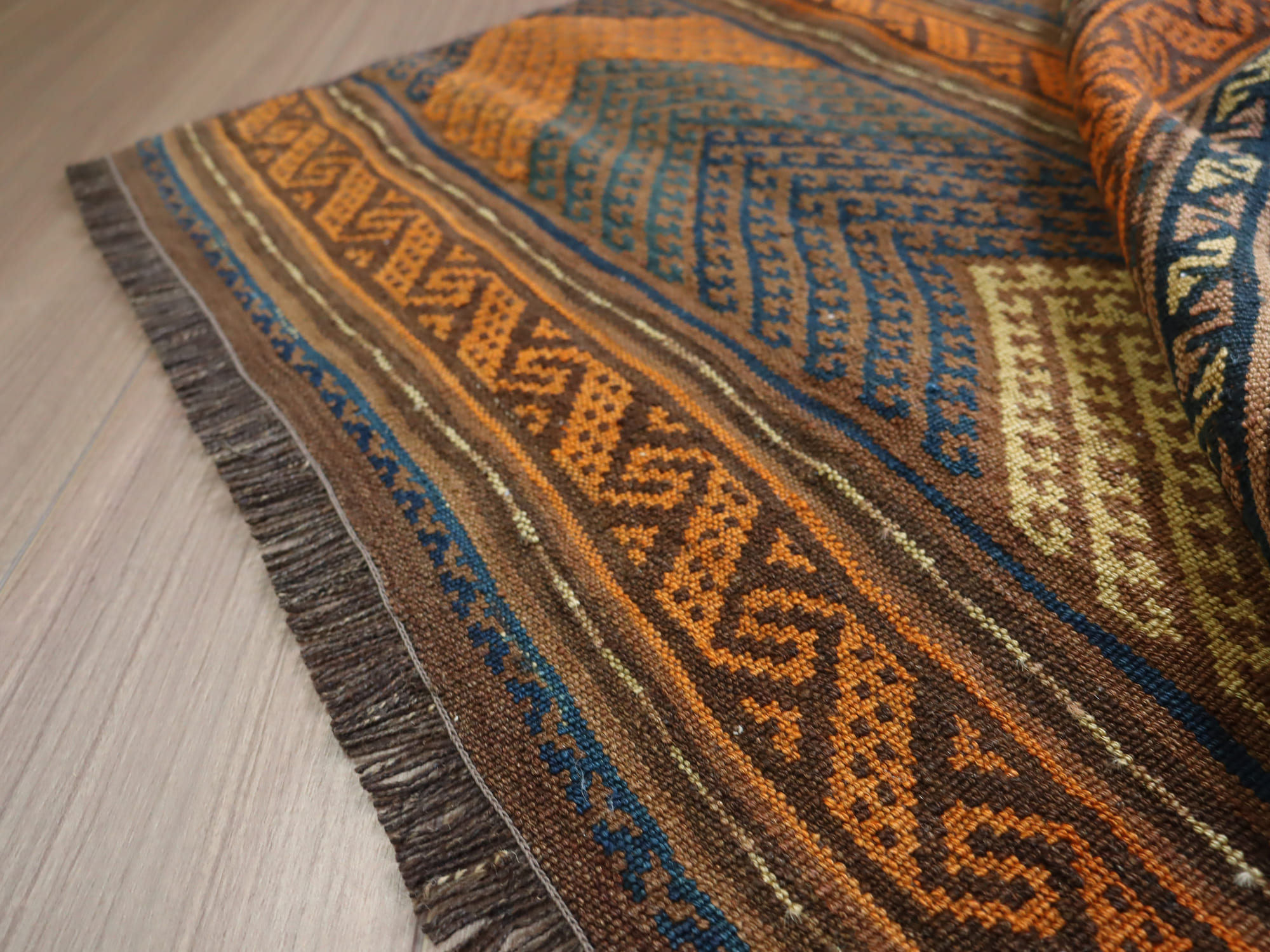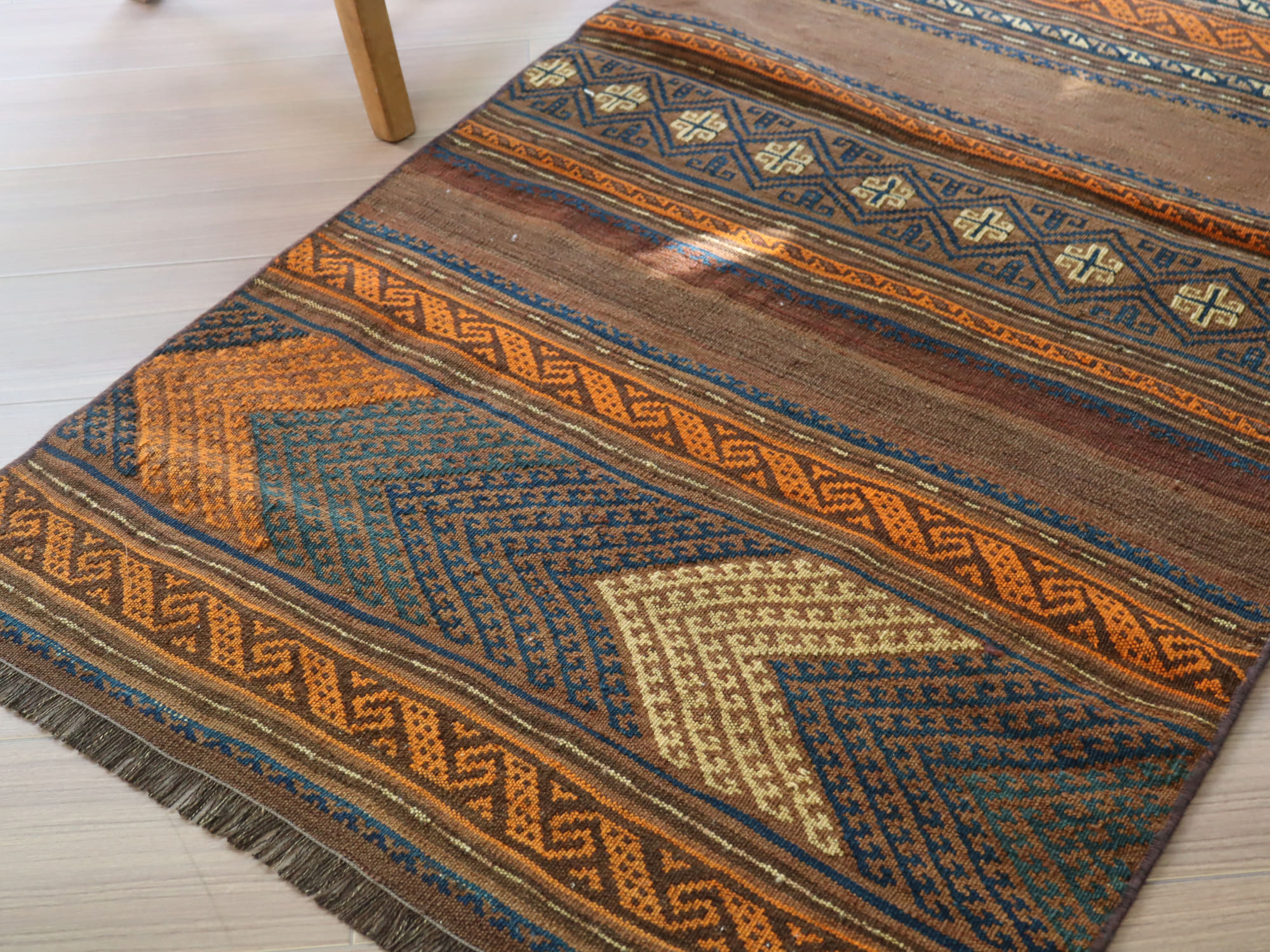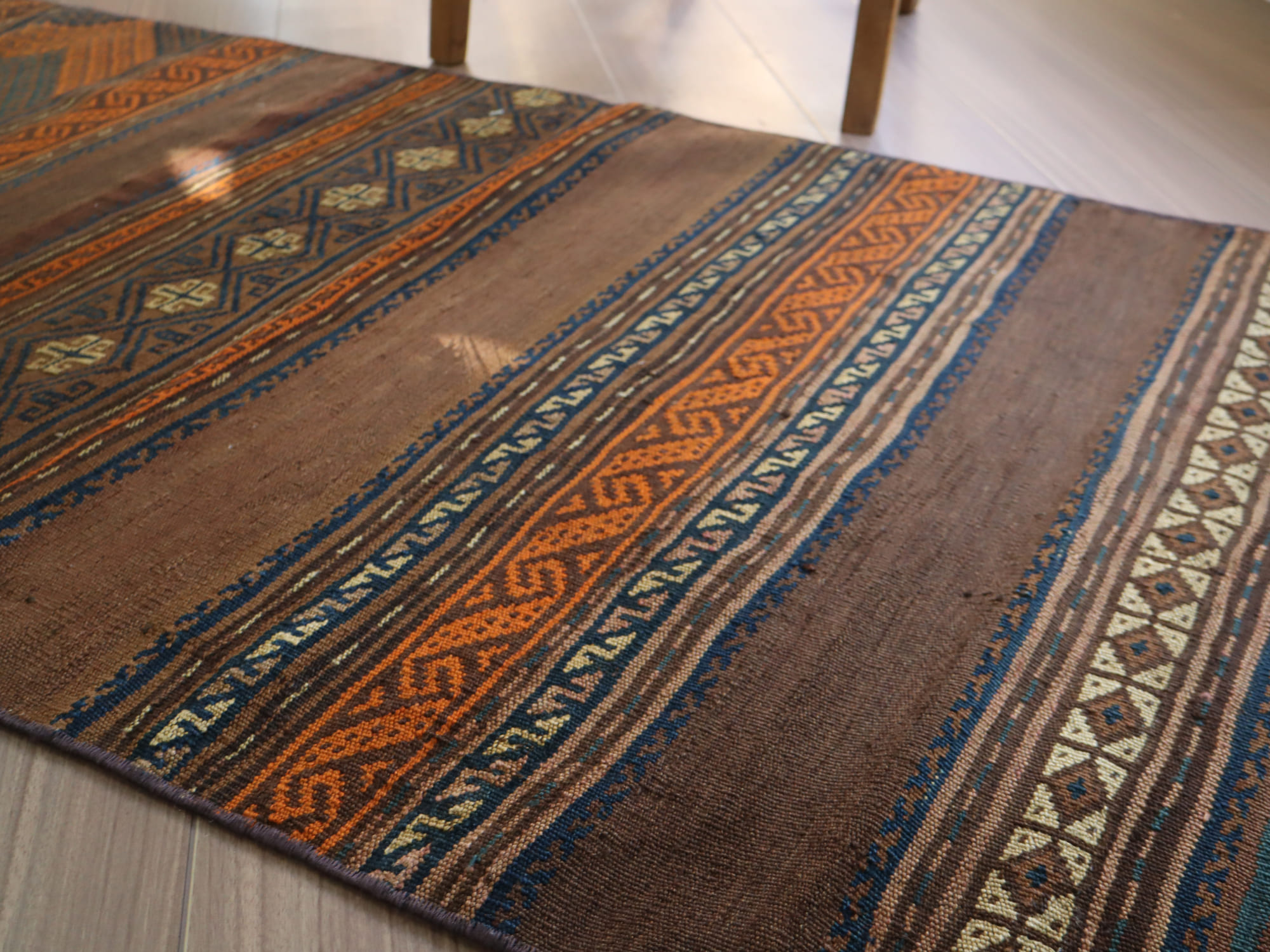 オールドキリム バルーチ154×77cm キャメルブラウン 細かなスザンニ織りの幾何学モチーフ