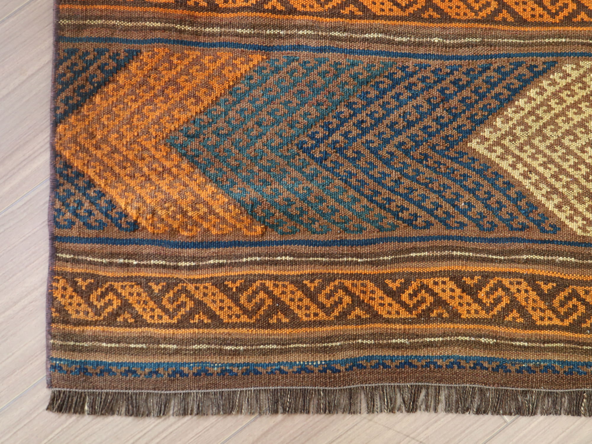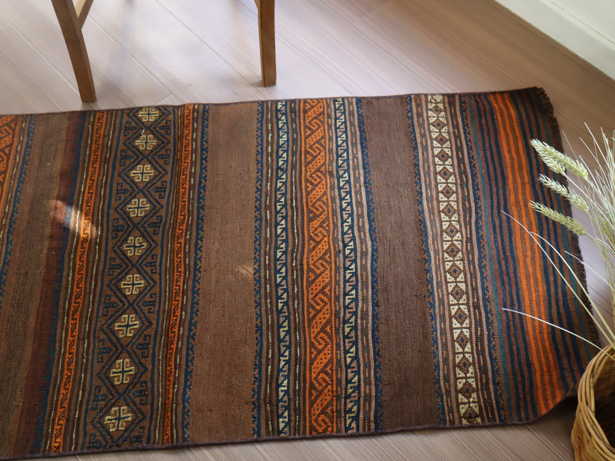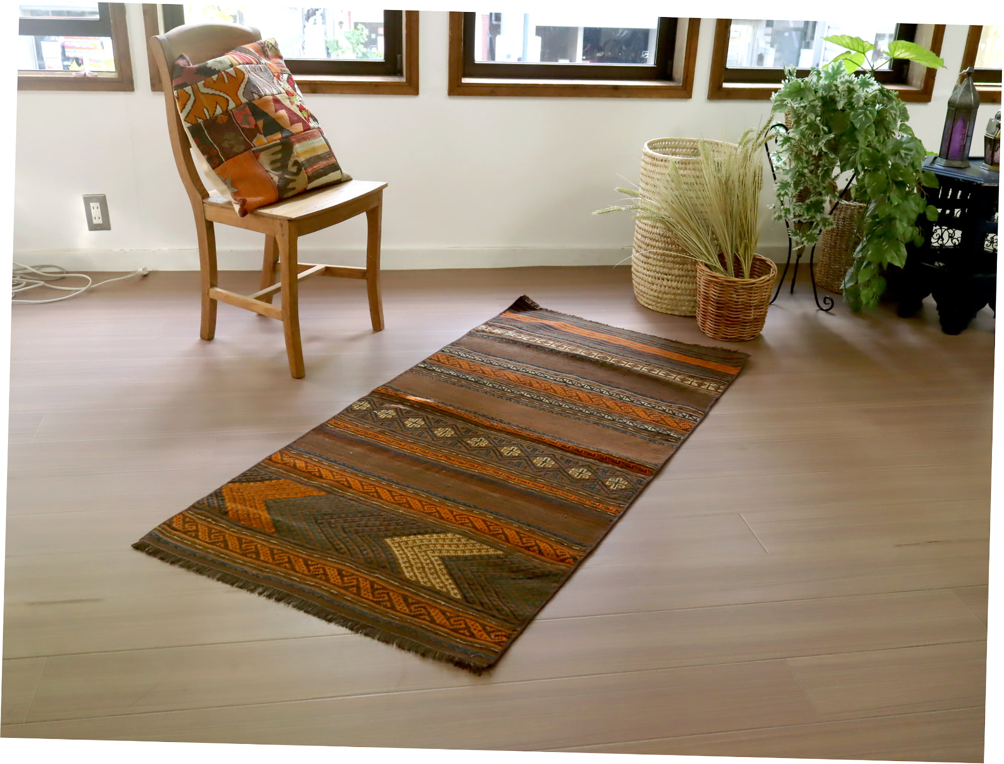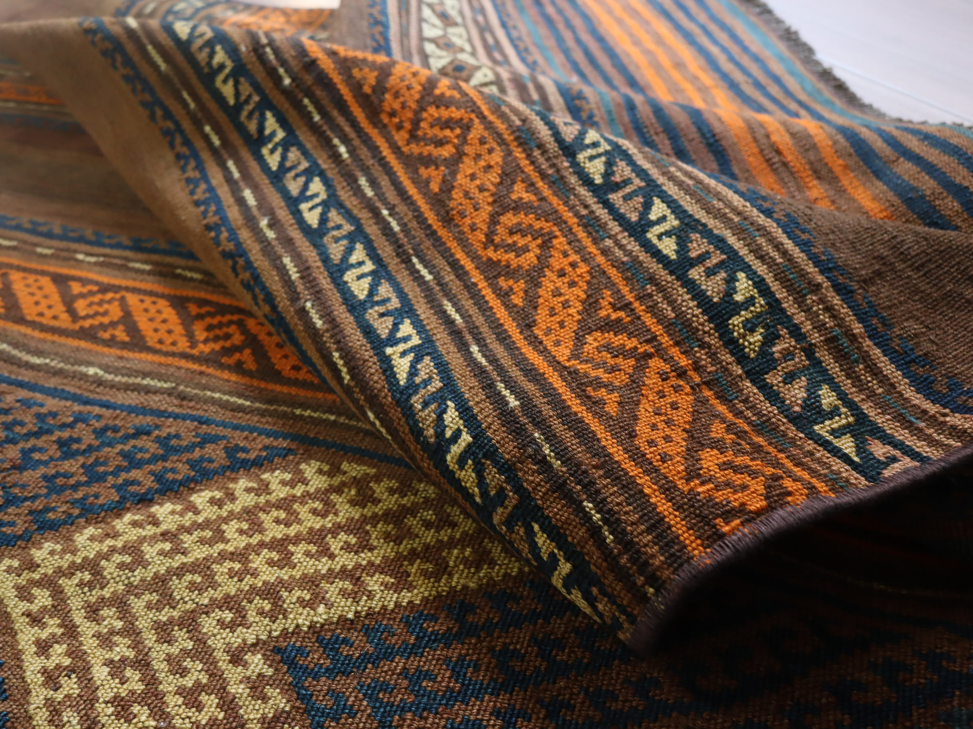 オールドキリム バルーチ154×77cm キャメルブラウン 細かなスザンニ織りの幾何学モチーフ