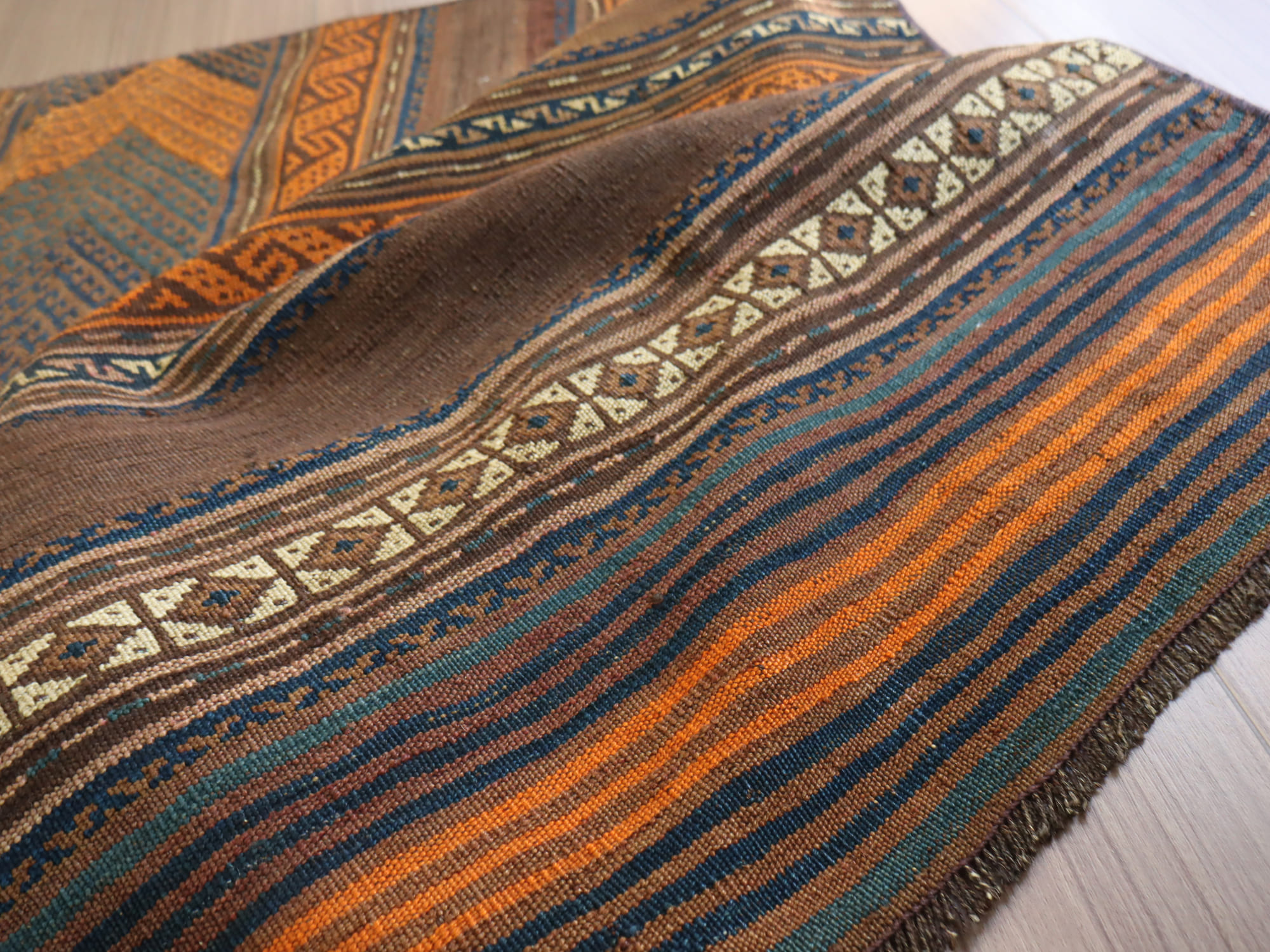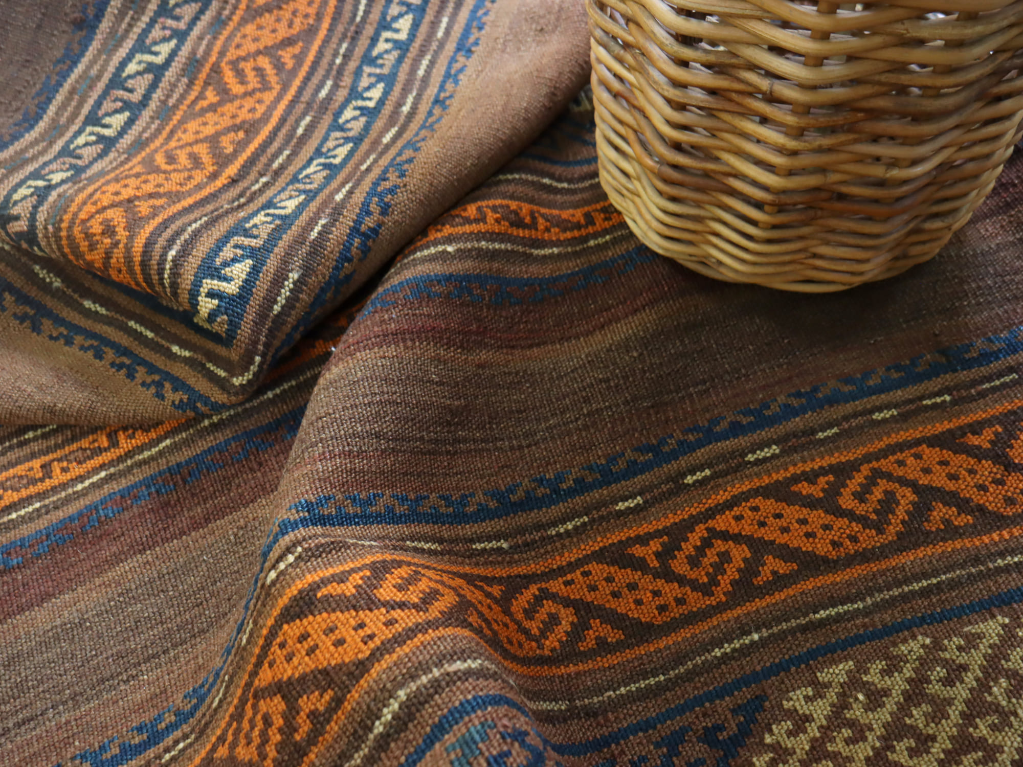 | アースカラーのボーダーデザインのランナーキリム。スザンニ織りと平織りの2つの技法で織られたキリム。もともとは、濃いアカムラサキ色だった色は日焼けによる褪色で、ソフトな色合いに変化しています。ストライプのベージュ色の部分は、ラクダのウールがつかわれています。 無地の部分は平織りで、模様のある部分がスザンニ織りです。表面にでていない糸を切らずに裏面に通して残しているので、スザンニ織り部分は通常のキリムと比べると厚みがあります。 |