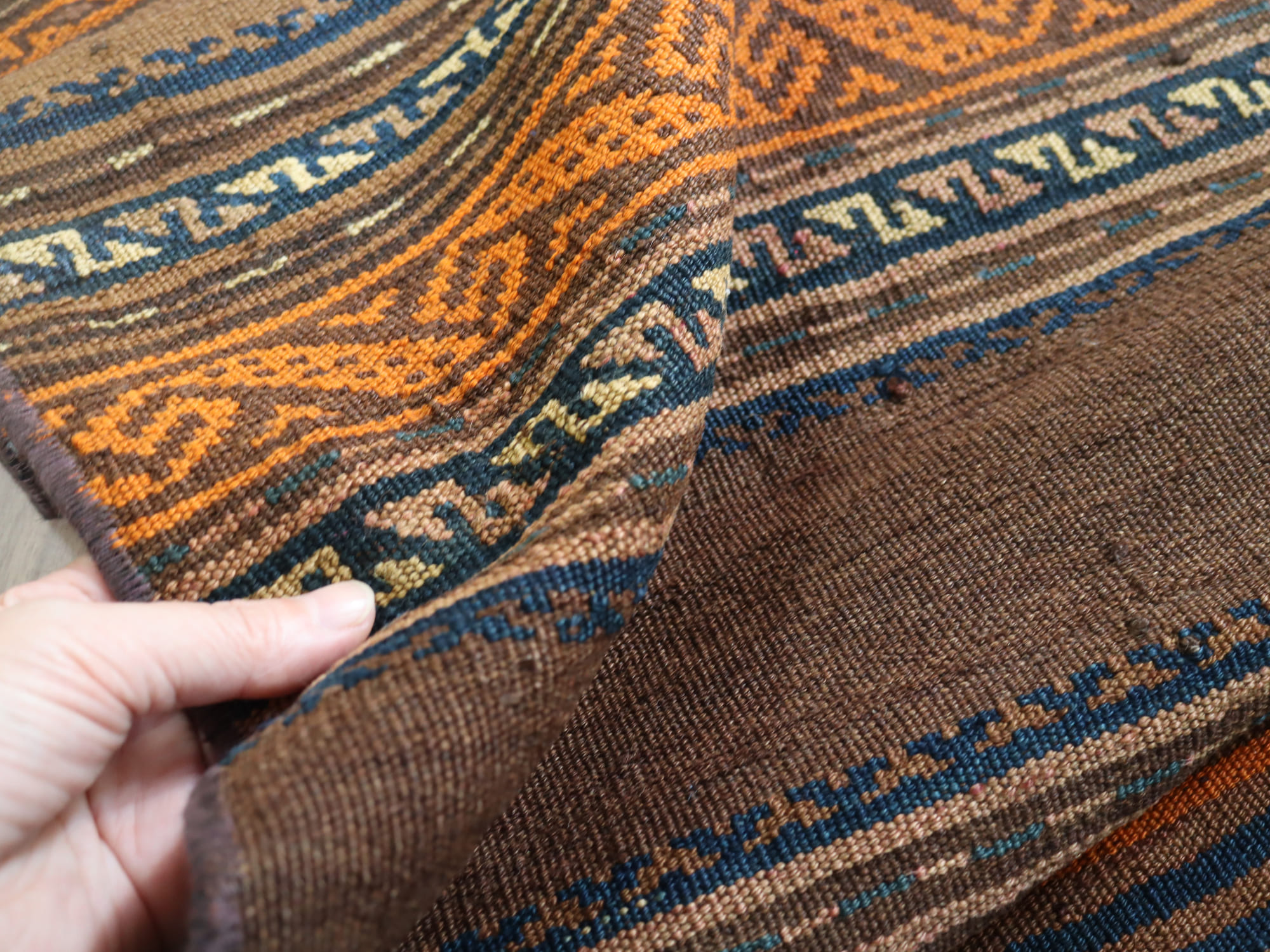 | 経糸にはこげ茶色のウールが使われています。色あせているため全体的に古びた印象ですが、織り自体にはダメージはありません。サイズはオリジナルではなく、大きなキリムからカットされた一部です。 |