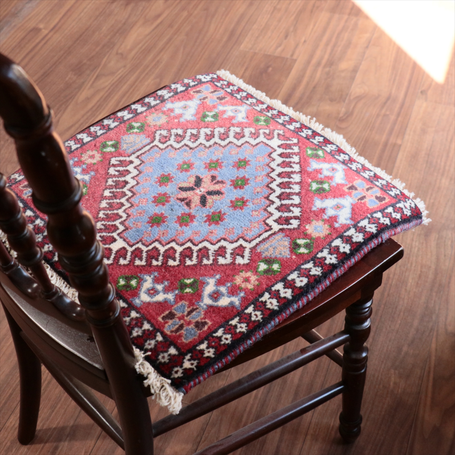 | 40cm角のミニサイズのラグ。小さいながらも、織りはしっかりしていて本格的です。多少ゆがみが気になりますが、ゆがみも含めて素朴な感じをお楽しみいただければと思います。 |