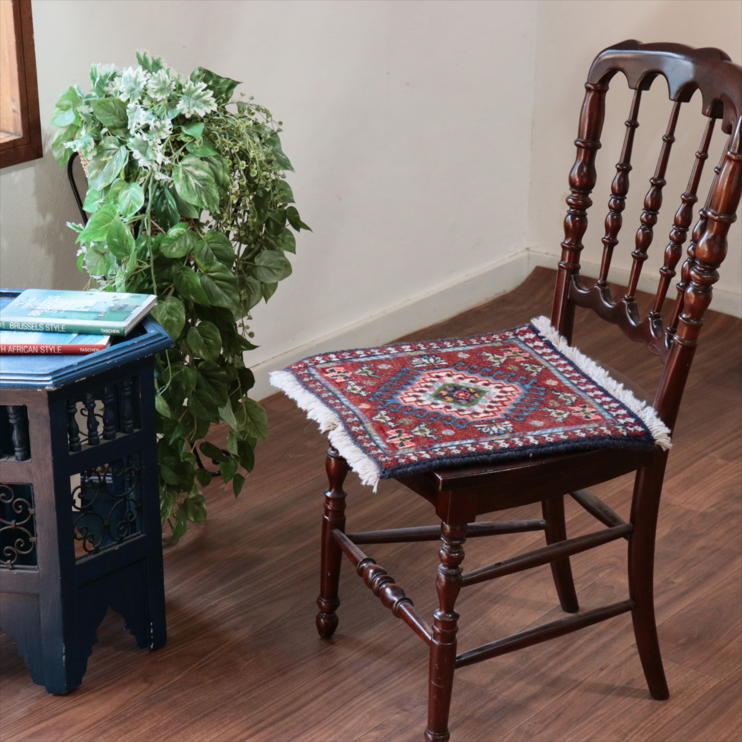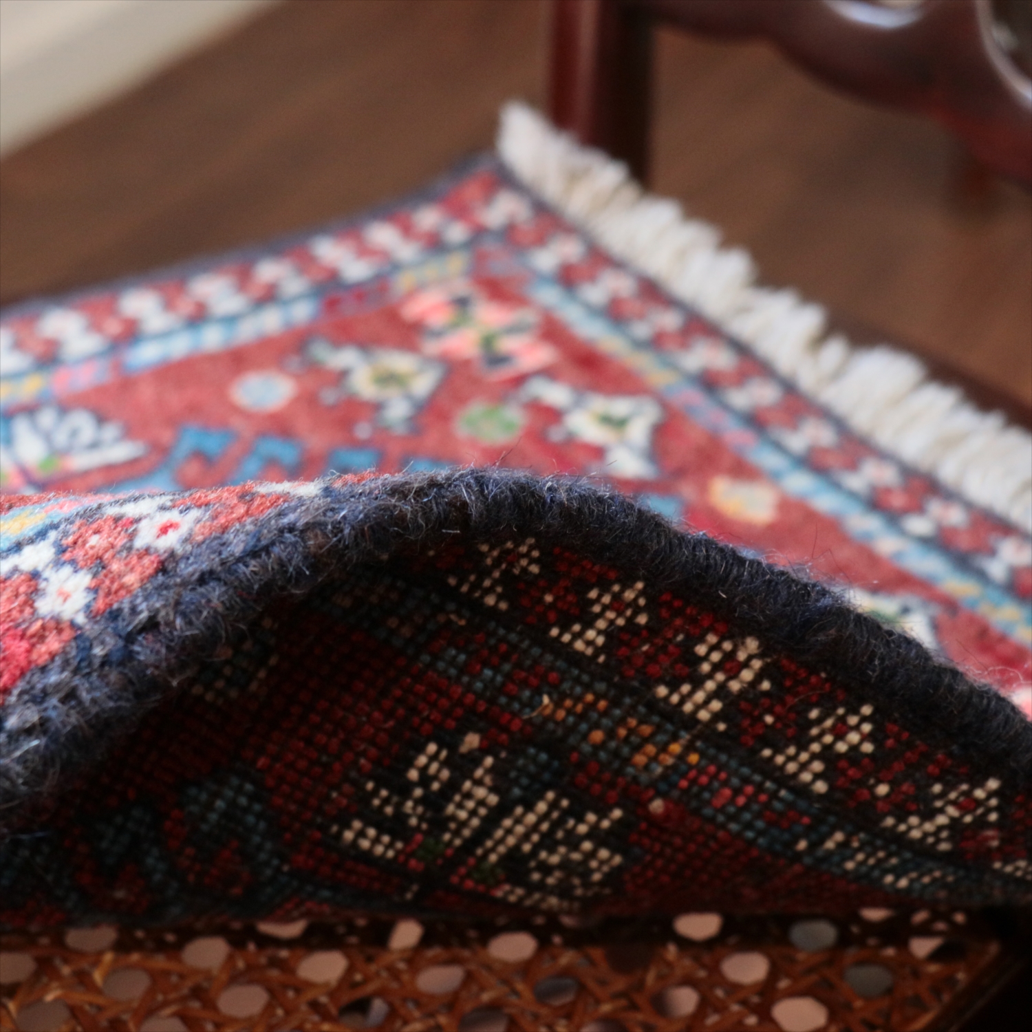 40cm角のミニサイズのラグ。小さいながらも、織りはしっかりしていて本格的です。多少ゆがみが気になりますが、ゆがみも含めて素朴な感じをお楽しみいただければと思います。