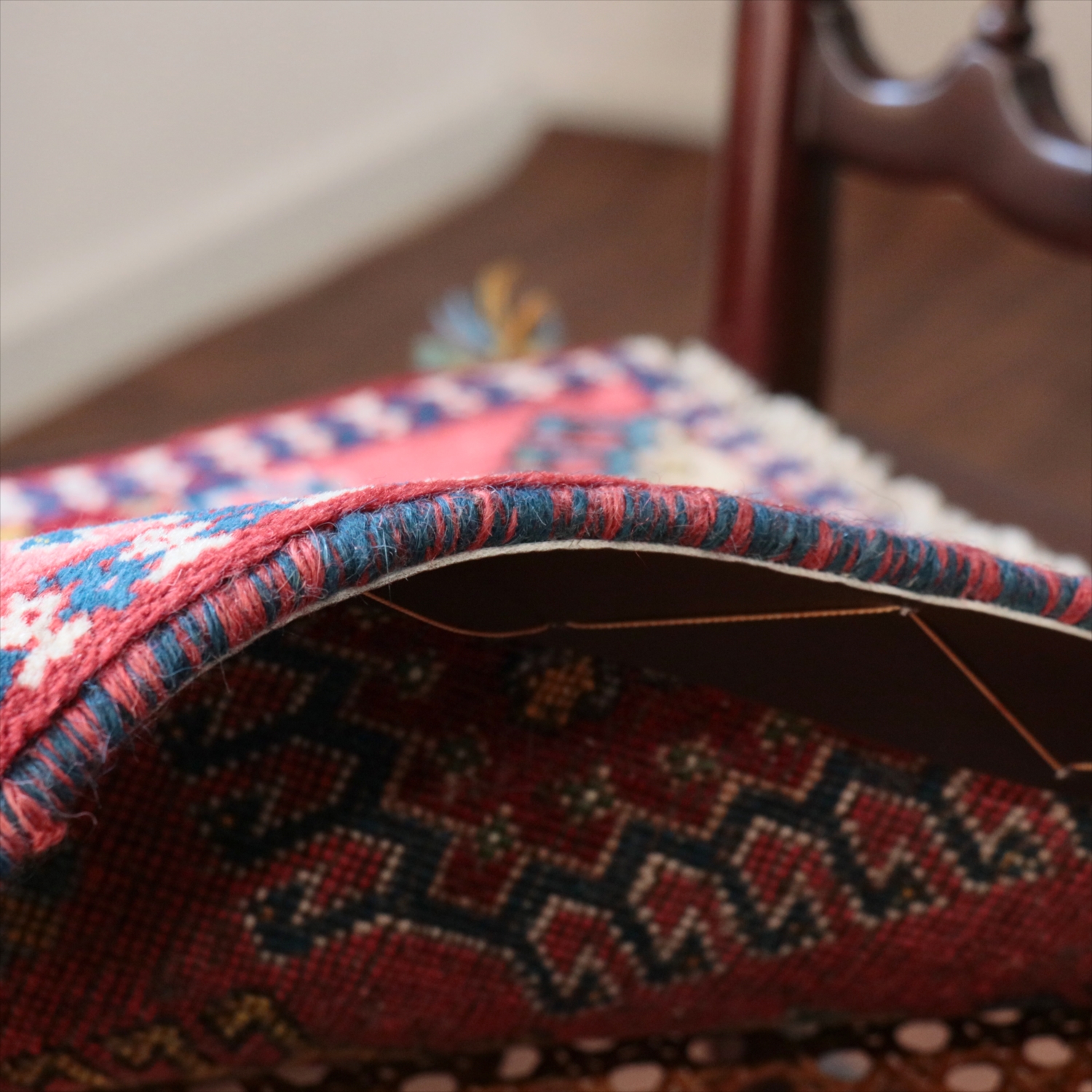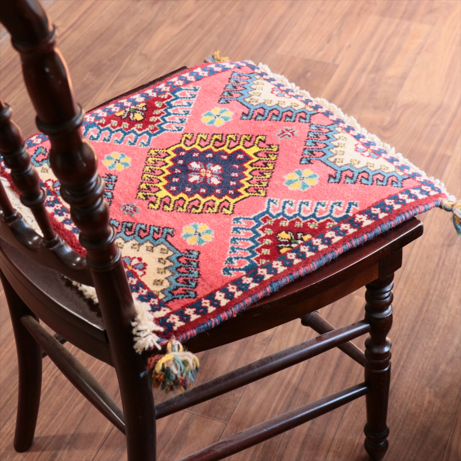| 40cm角のミニサイズのラグ。小さいながらも、織りはしっかりしていて本格的です。多少ゆがみが気になりますが、ゆがみも含めて素朴な感じをお楽しみいただければと思います。 |