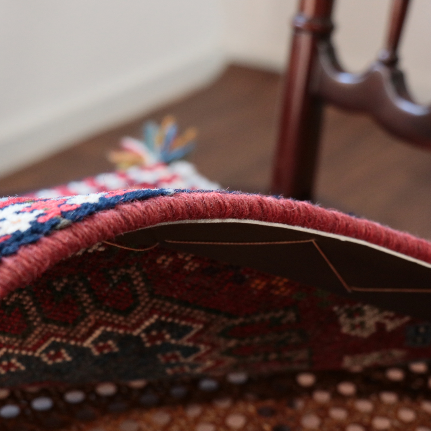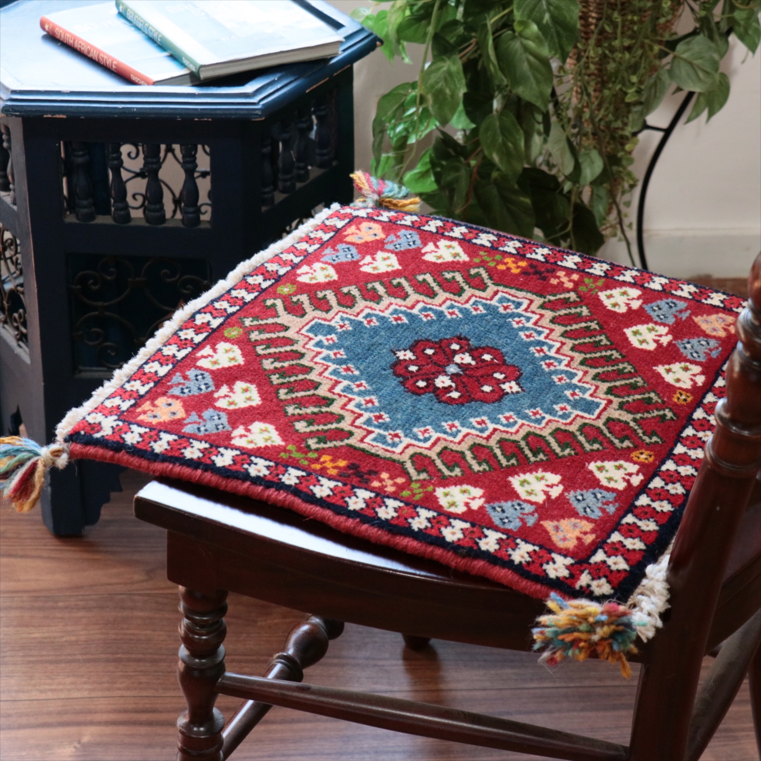 40cm角のミニサイズのラグ。小さいながらも、織りはしっかりしていて本格的です。多少ゆがみが気になりますが、ゆがみも含めて素朴な感じをお楽しみいただければと思います。