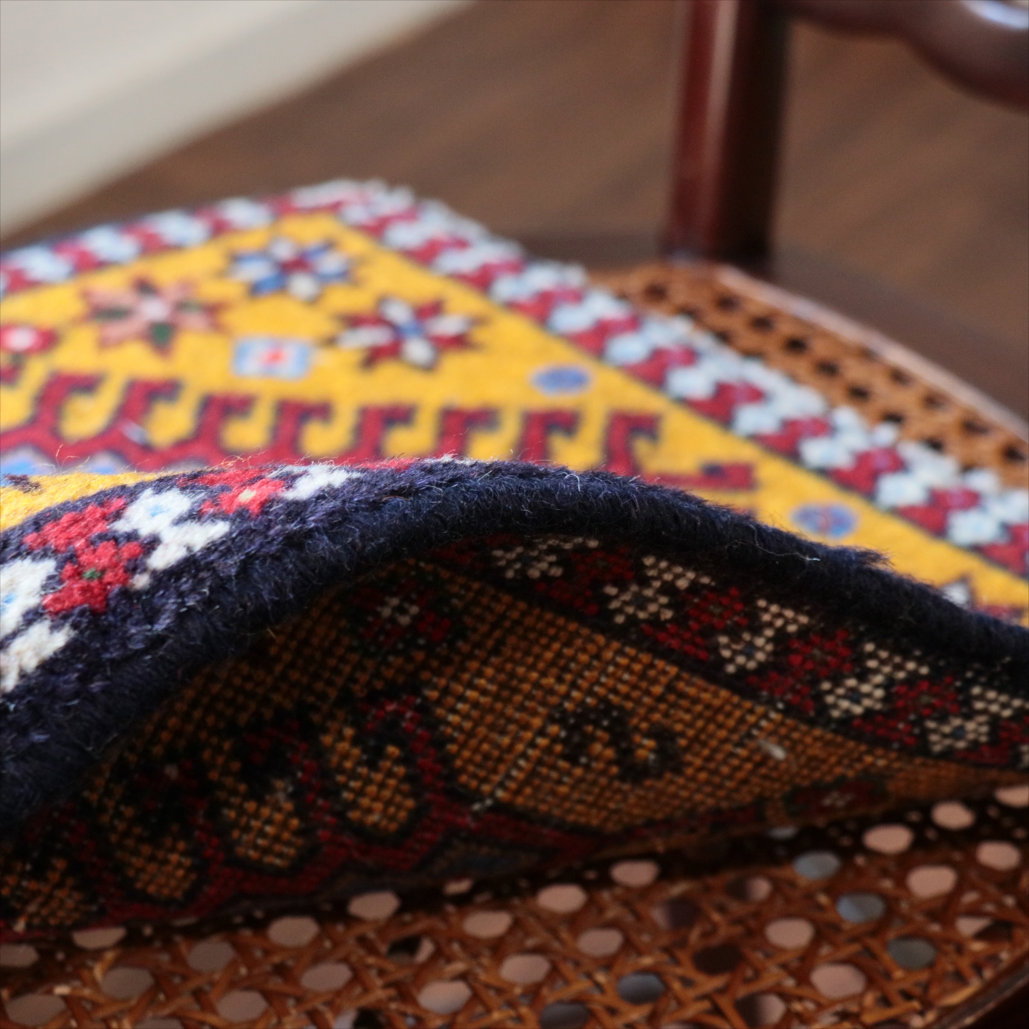 | 40cm角のミニサイズのラグ。小さいながらも、織りはしっかりしていて本格的です。多少ゆがみが気になりますが、ゆがみも含めて素朴な感じをお楽しみいただければと思います。 |