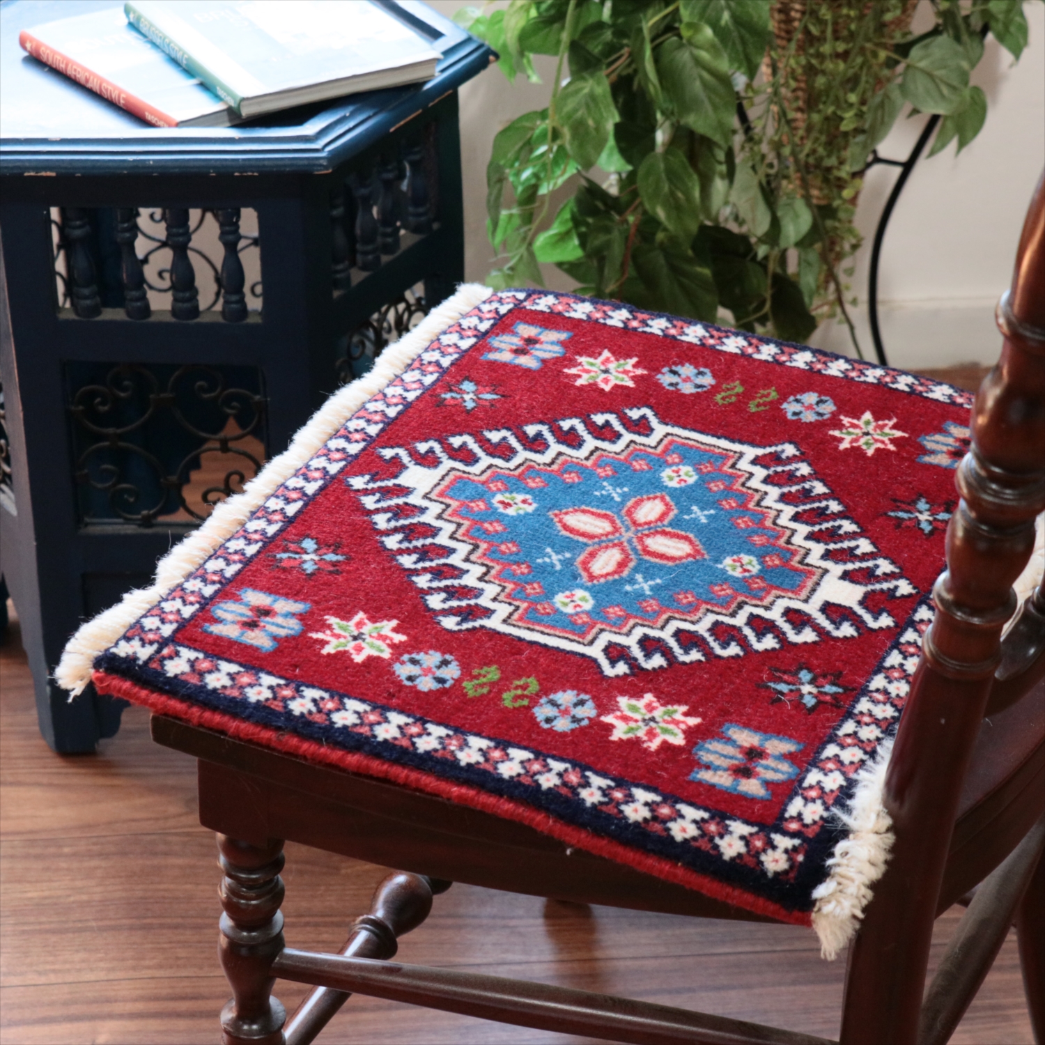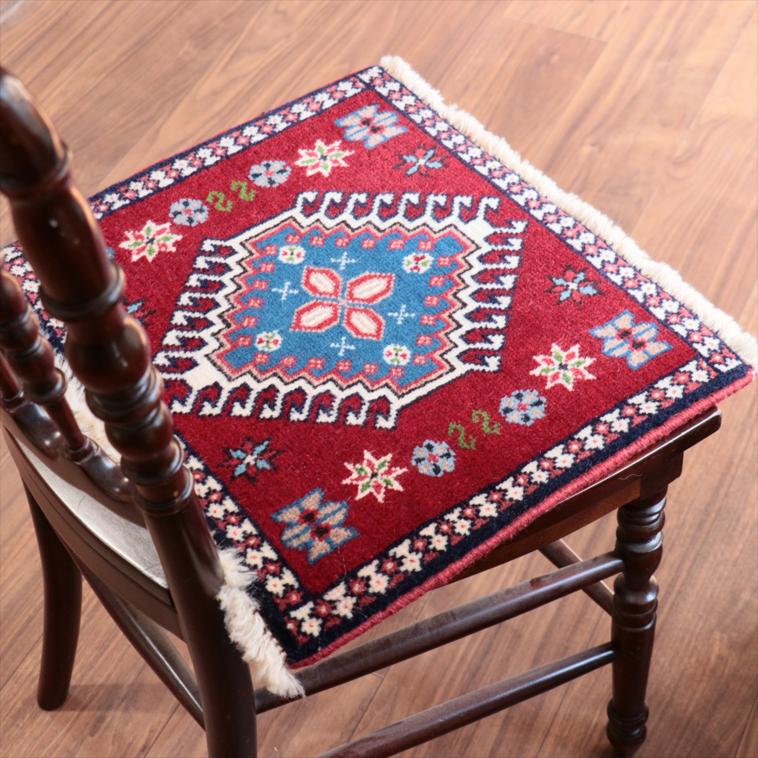 | 40cm角のミニサイズのラグ。小さいながらも、織りはしっかりしていて本格的です。多少ゆがみが気になりますが、ゆがみも含めて素朴な感じをお楽しみいただければと思います。 |