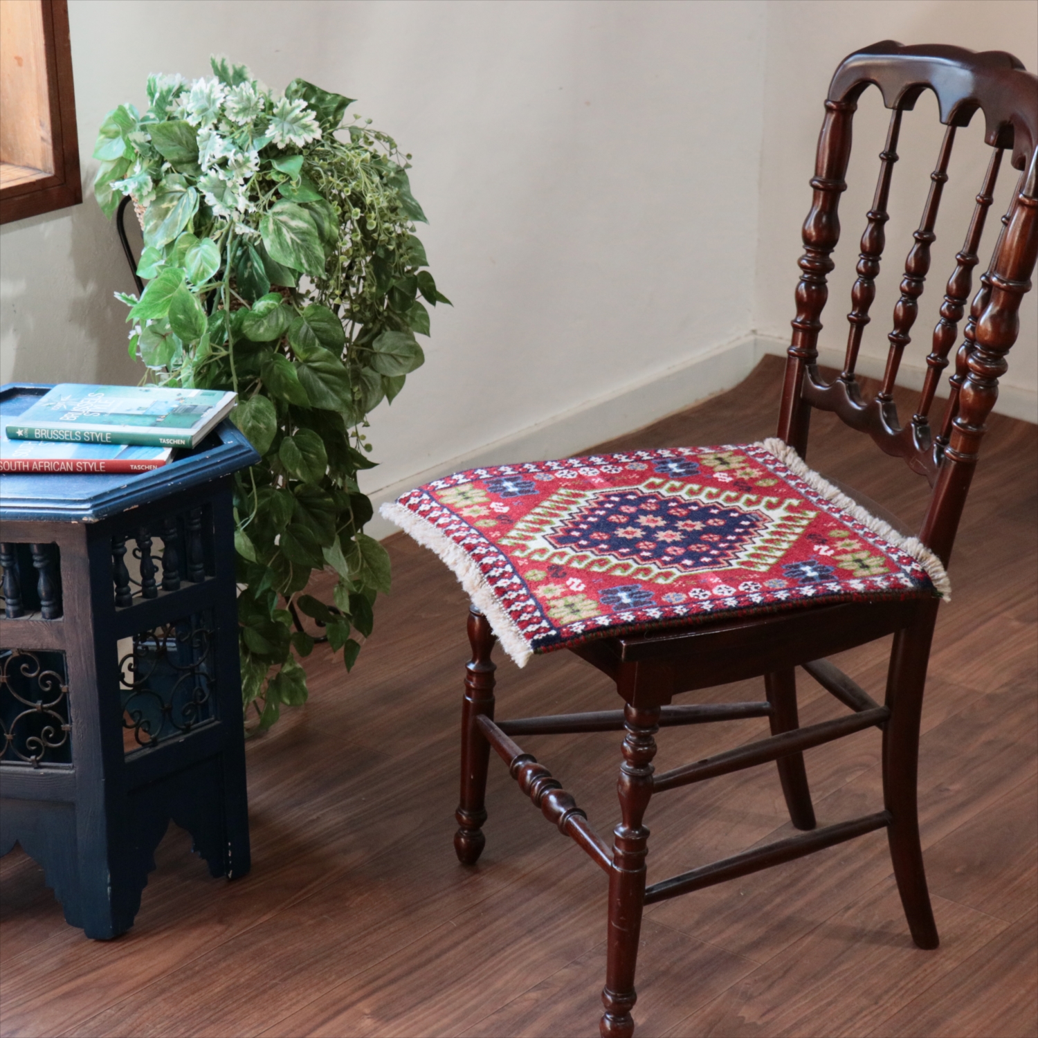 | 40cm角のミニサイズのラグ。小さいながらも、織りはしっかりしていて本格的です。多少ゆがみが気になりますが、ゆがみも含めて素朴な感じをお楽しみいただければと思います。 |